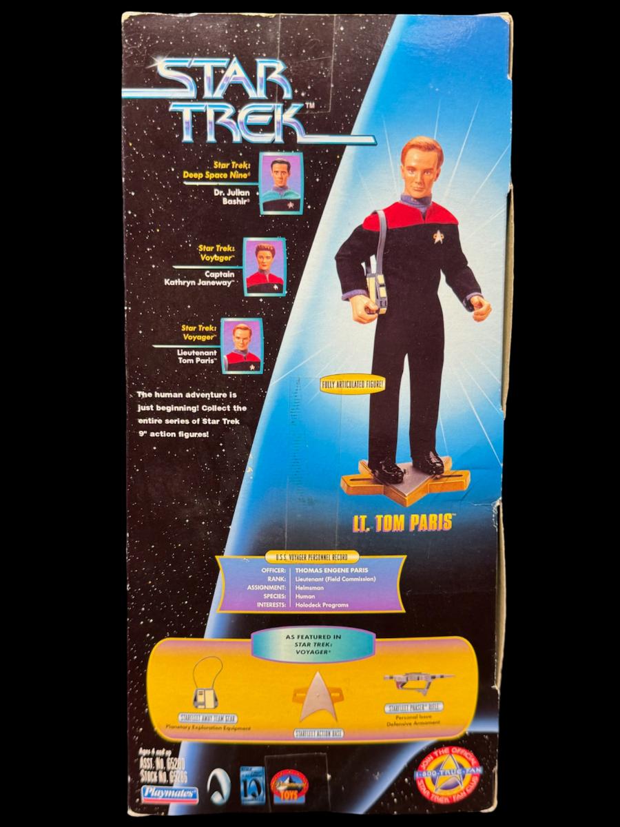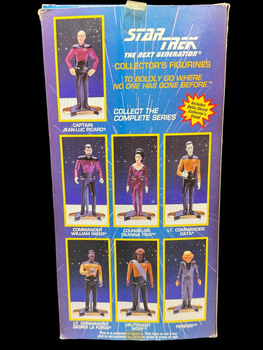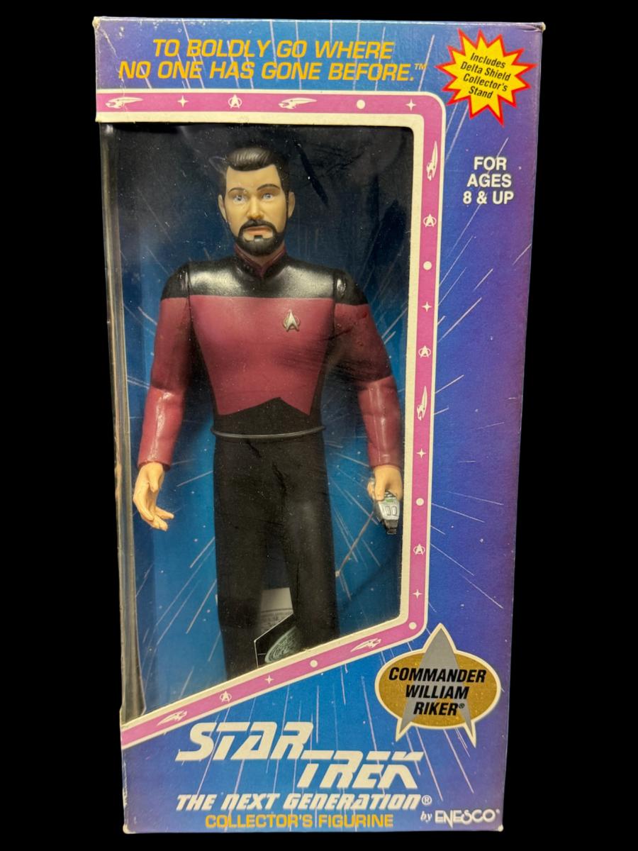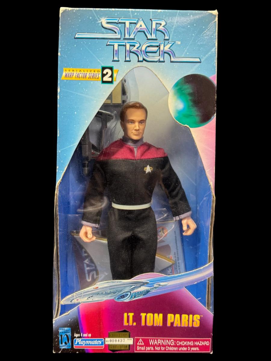 Includes a Playmates Warp Factor Series 2 Lt. Tom Paris nine inch figure, and an Enesco “The Next Generation” Commander William Riker ten inch figure. Total of two pieces. In the original boxes, which have storage related wear.
