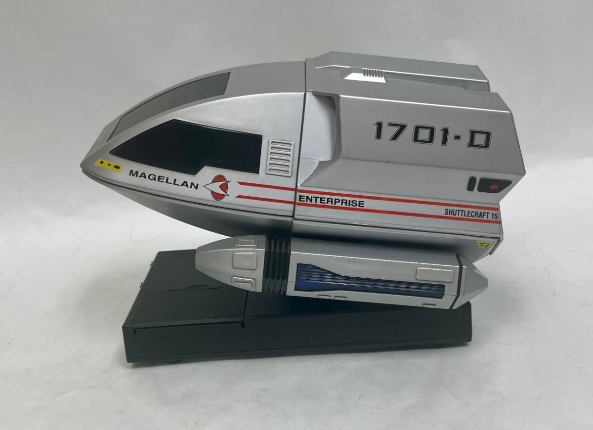 Markings for NCC-1701D (Enterprise-D), Shuttlecraft 15 "Magellan". Does not include AC plug-in power supply, but can run on batteries. Tested, all functions appear to work as expected. Alarm tone is the "Red Alert" sound. In good condition.