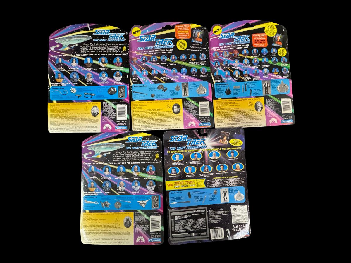 NOS. Includes Captain Scott, Ferengi, Gowron the Klingon, LT Natasha Yar, and Q. Total of five pieces, in the original packaging.