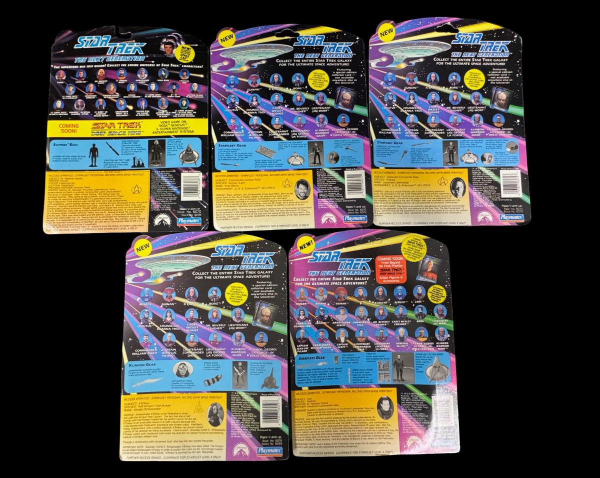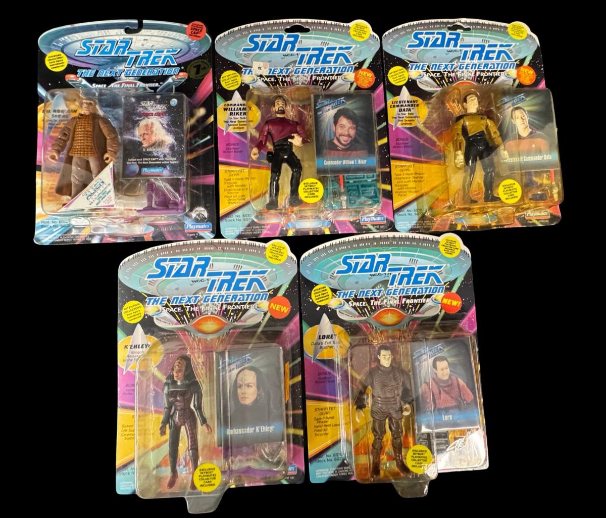 NOS. Includes Lore, Lt. Commander Data, Commander William Riker, Dr. Noonian Soong, and K’Ehleyr. Total of five pieces in the original packaging.