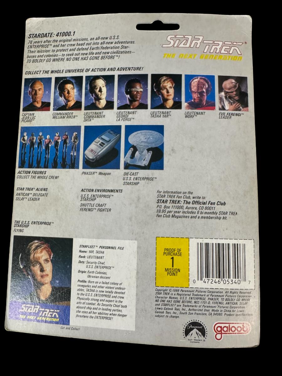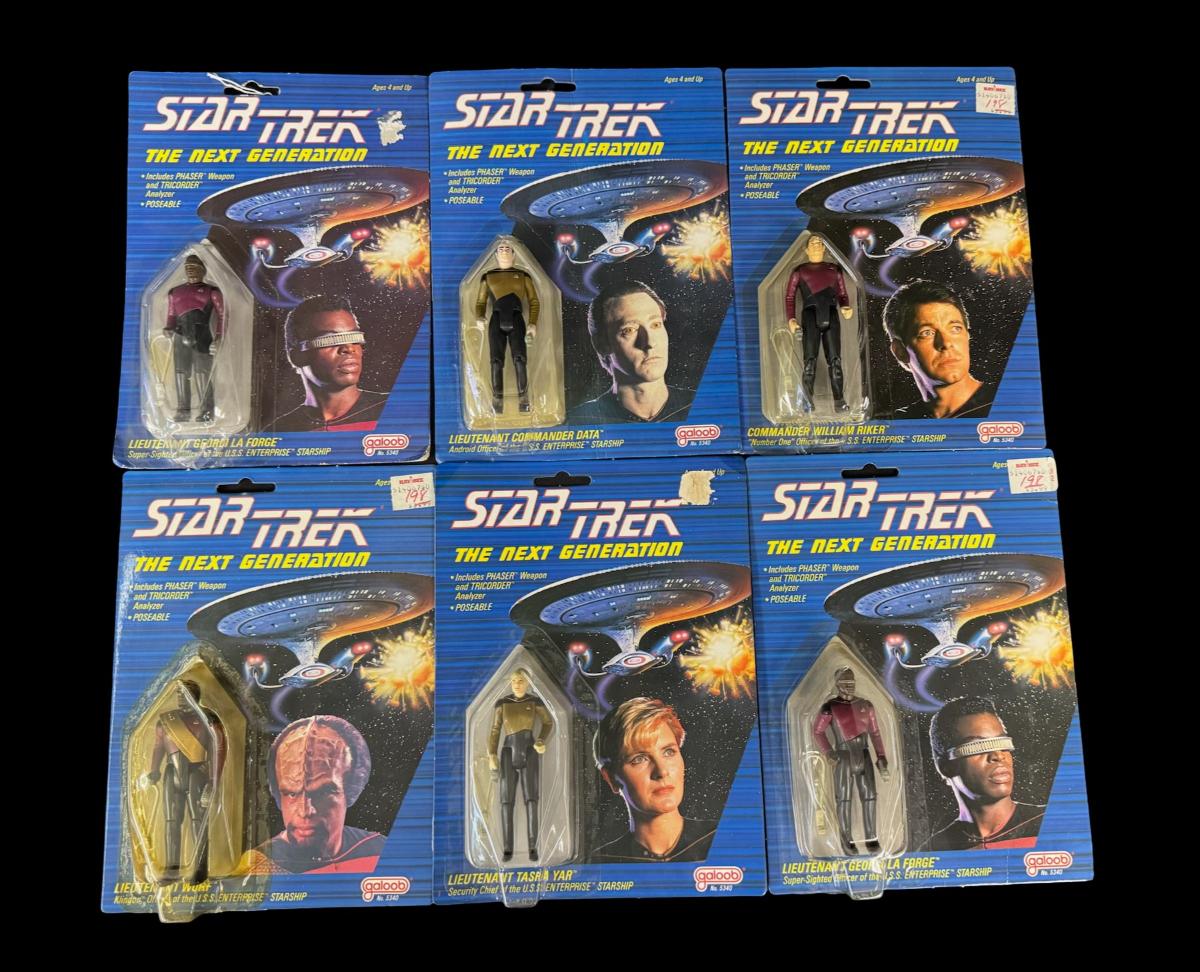 Made by Galoob. Includes Lieutenant Geordi La Forge (x2), Lieutenant Commander Data, Commander William Riker, Lieutenant Worf, and Lieutenant Tasha Yar. Total of six pieces. In the original packaging, which may have storage related wear.