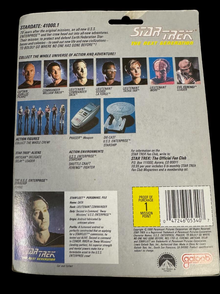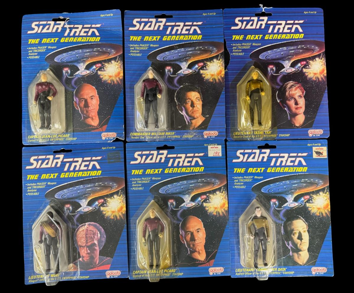 Made by Galoob. Includes Lieutenant Commander Data, Captain Jean-Luc Picard (x2), Lieutenant Worf, Lieutenant Tasha Yar, and Commander William Riker. Total of six pieces. In the original packaging, which may have storage related wear.