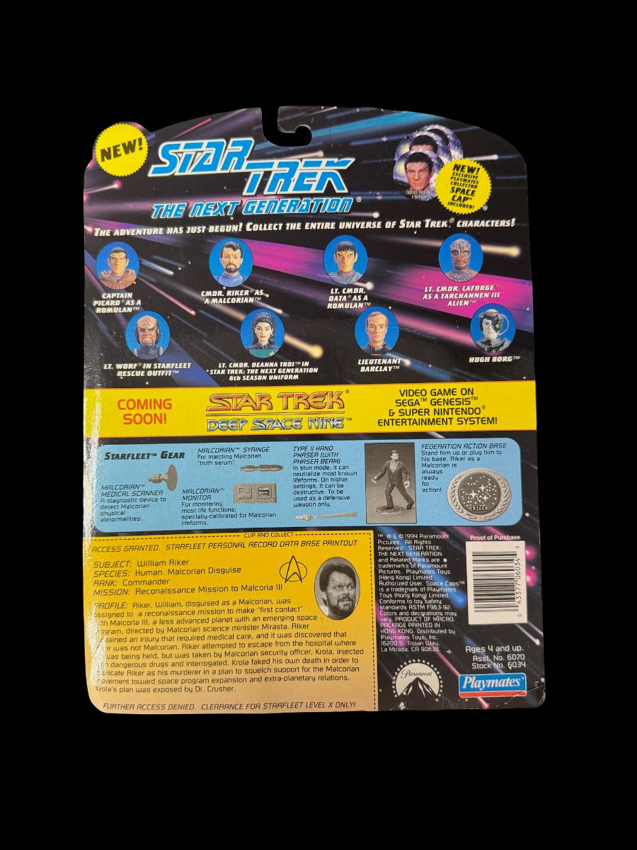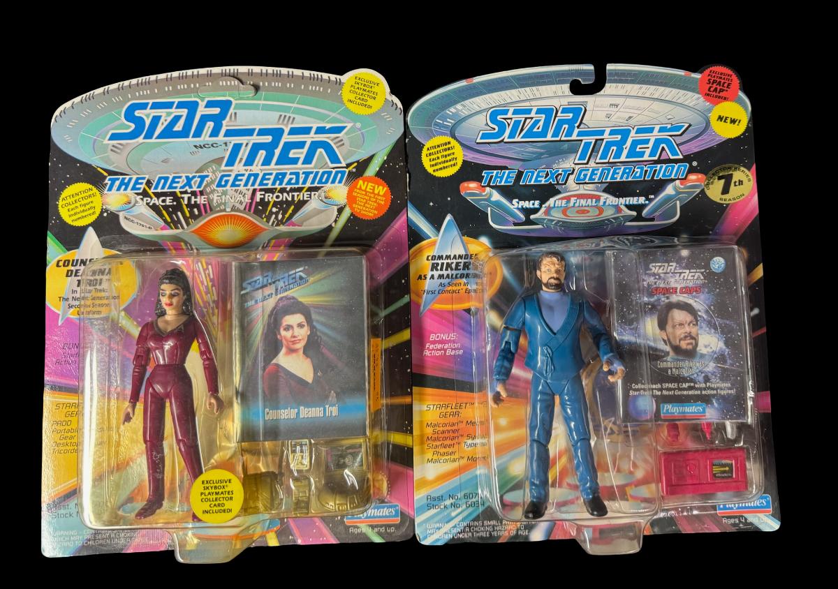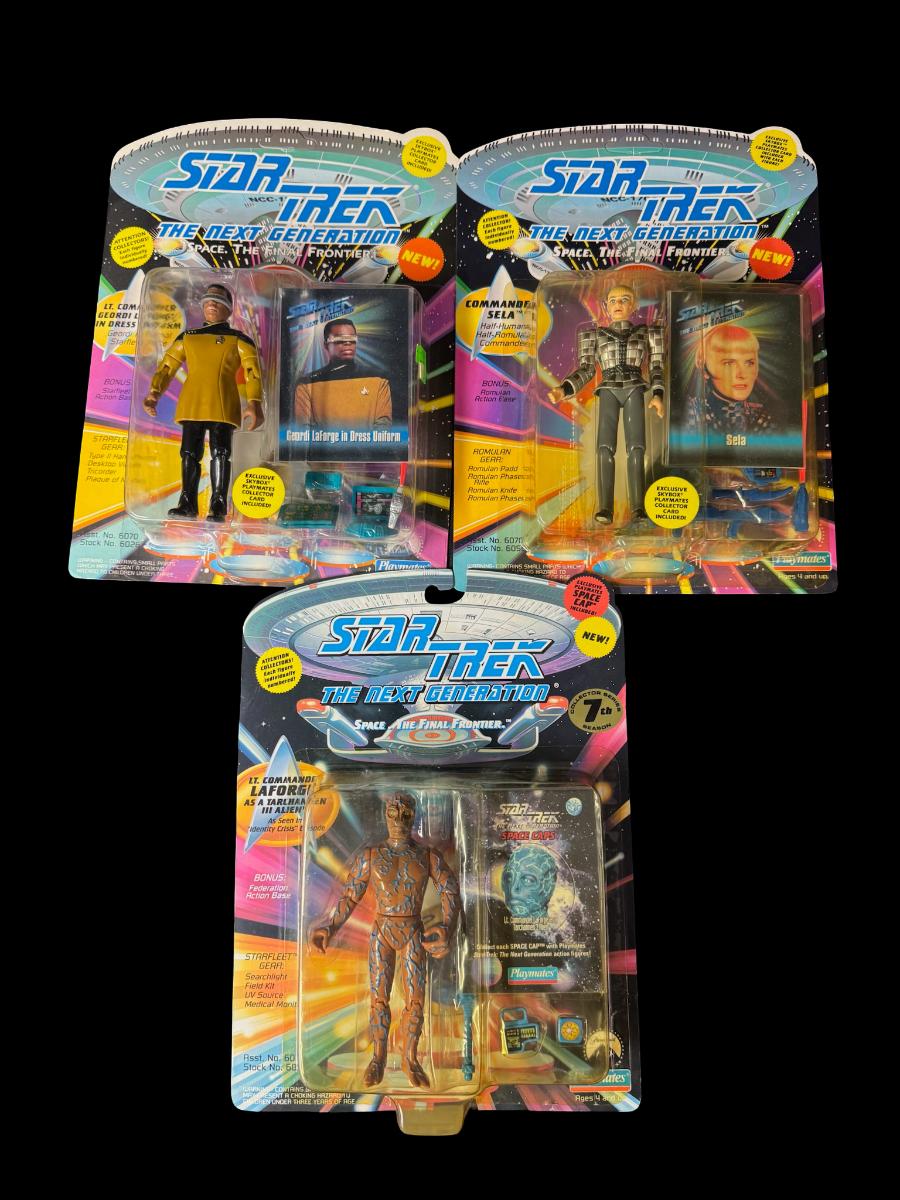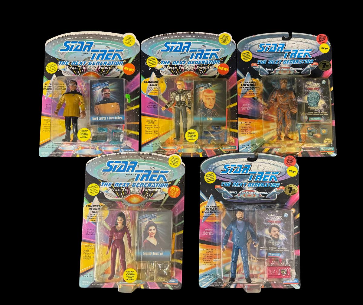 Includes Geordi La Forge in Dress Uniform, Counselor Deanna Troi, Commander Riker as a Malcorian, Sela, and Space Caps. Total of five pieces. In the original packaging.