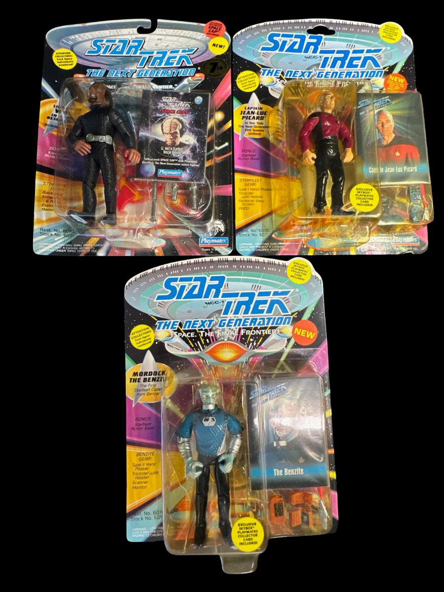 Includes Lt. Commander Deanna Troi, Lt. Commander a Romulan, Lt. Worf in Starfleet Rescue Uniform, The Benzite, and Captain Jean-Luc Picard. Total of five pieces. In the original packaging.