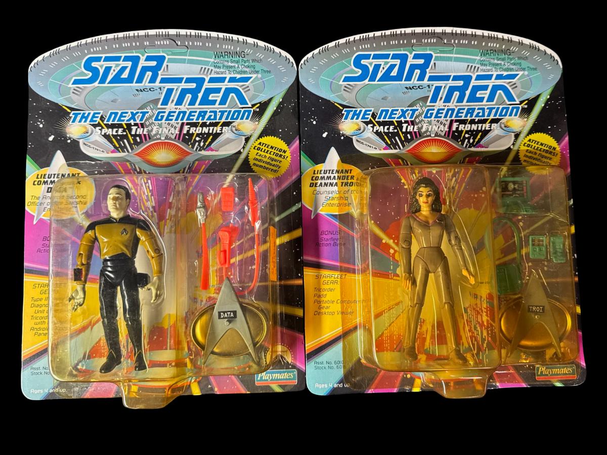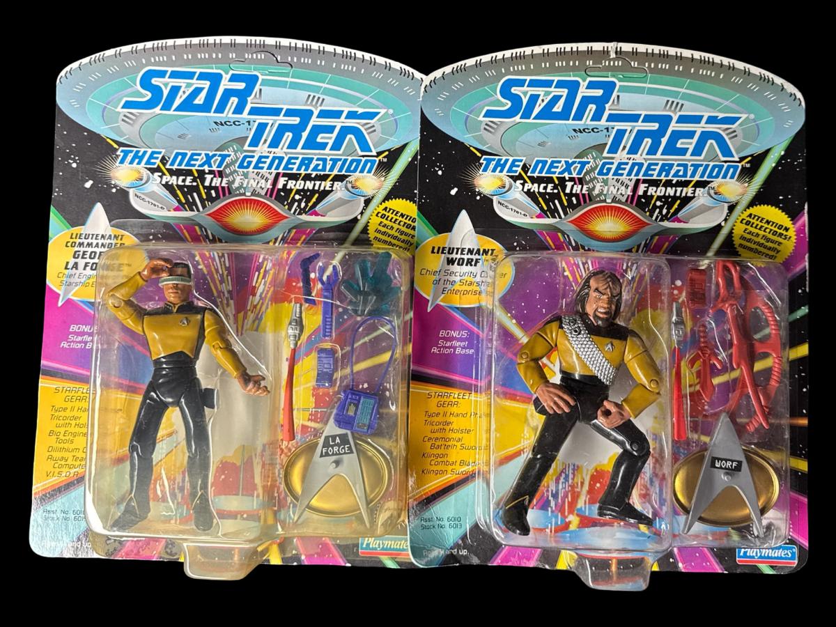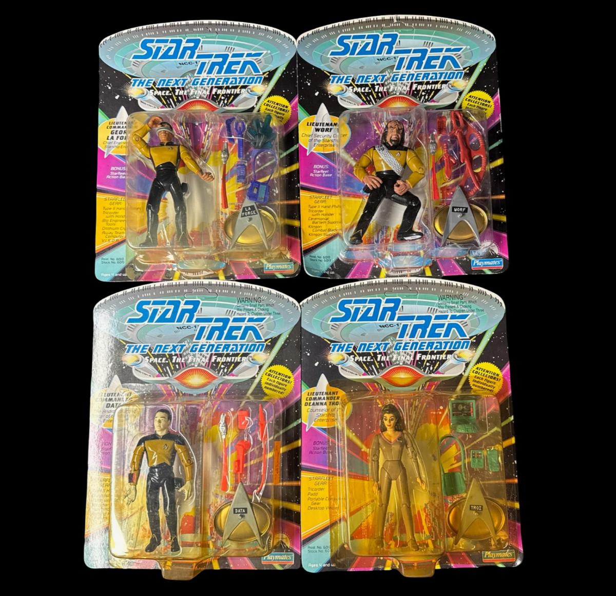 Includes Lt. Worf, Lt. Commander Geordi La Forge, Lt. Commander Data, and Lt. Commander Deanna Troi. Total of four pieces. In the original packaging.