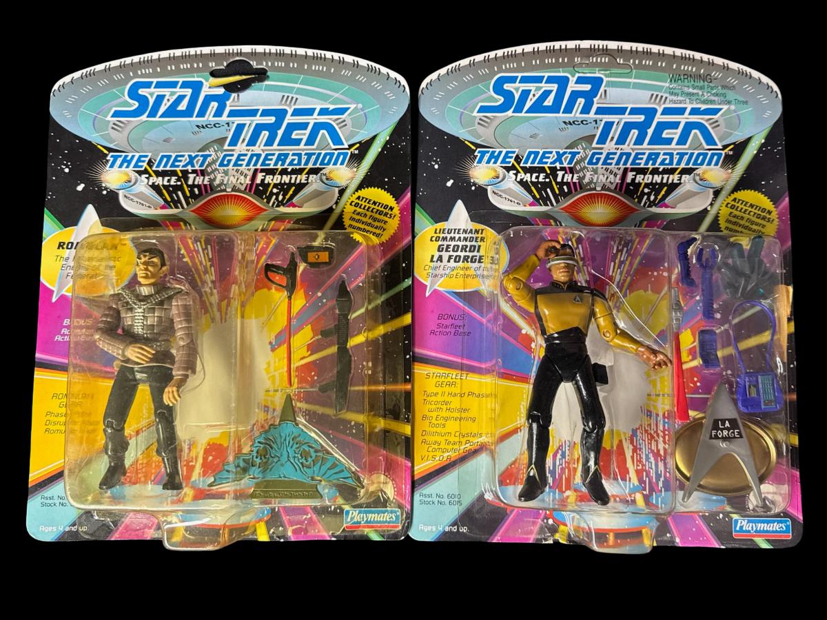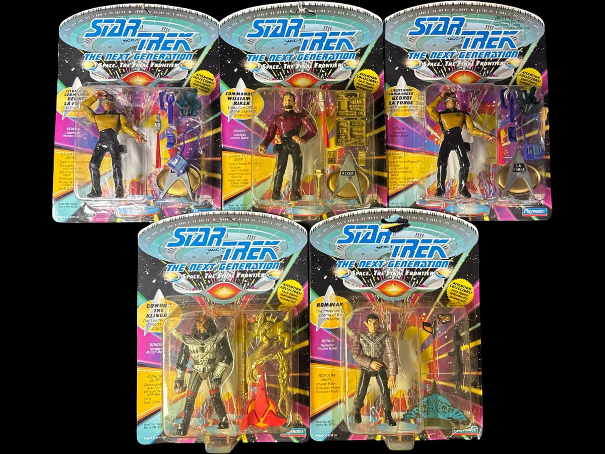Includes Lt. Commander Geordi La Forge (x2), Commander William T. Riker, Gowron the Klingon, and Romulan. Total of five pieces. In the original packaging.