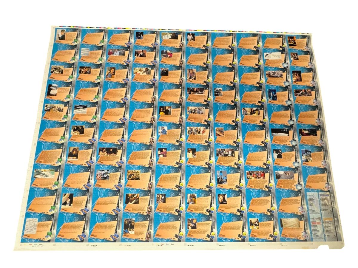 This is a full, uncut production sheet of trading cards from eh early 1990s. There are some minor nicks along the border, which do not affect the integrity of the cards themselves. Comes with original packing box. Pre-auction estimate: $50-$100.