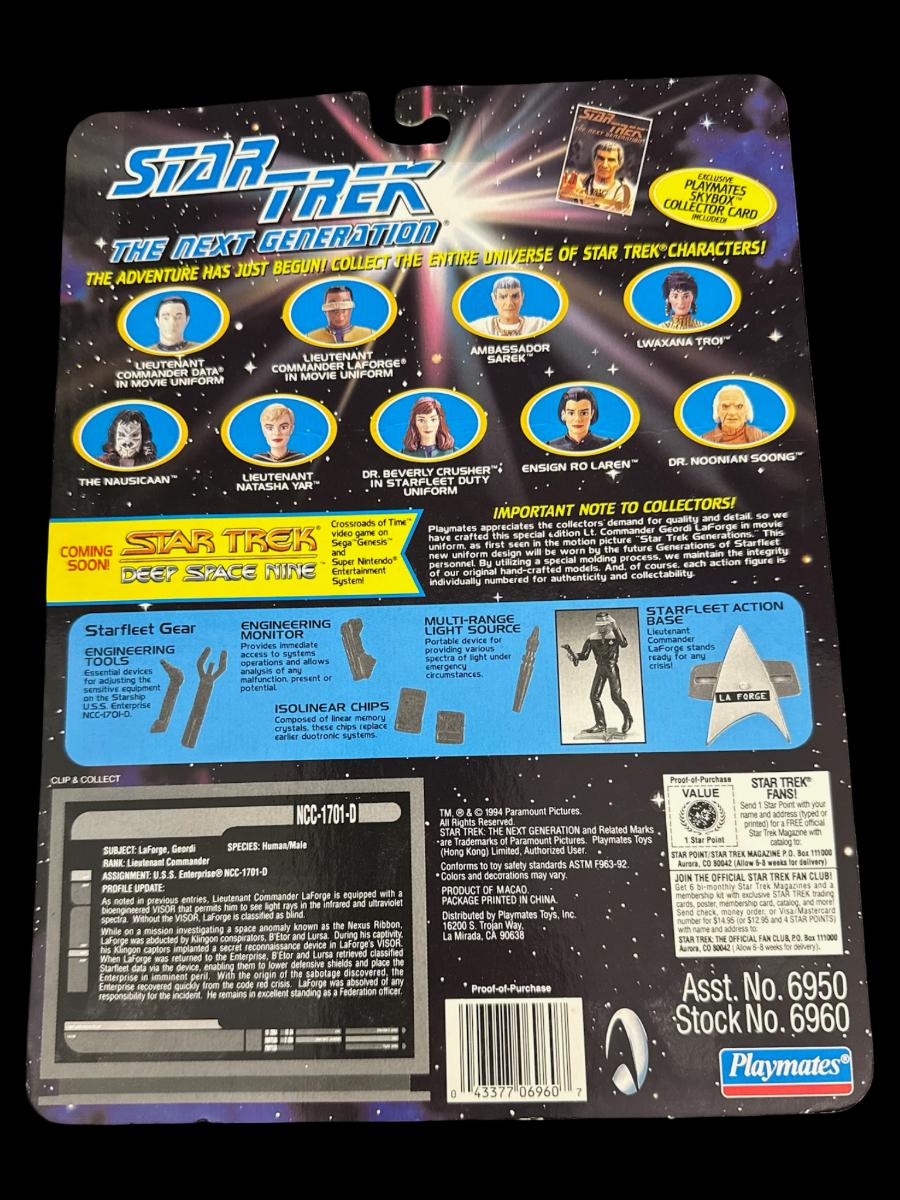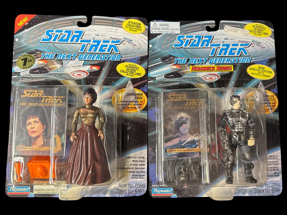 Includes Capt. Jean-Luc Picard as Locutus, Lwaxana Troi, Lt. Commander Geordi La Forge, and The Nausicaan. Total of four pieces. In the original packaging.