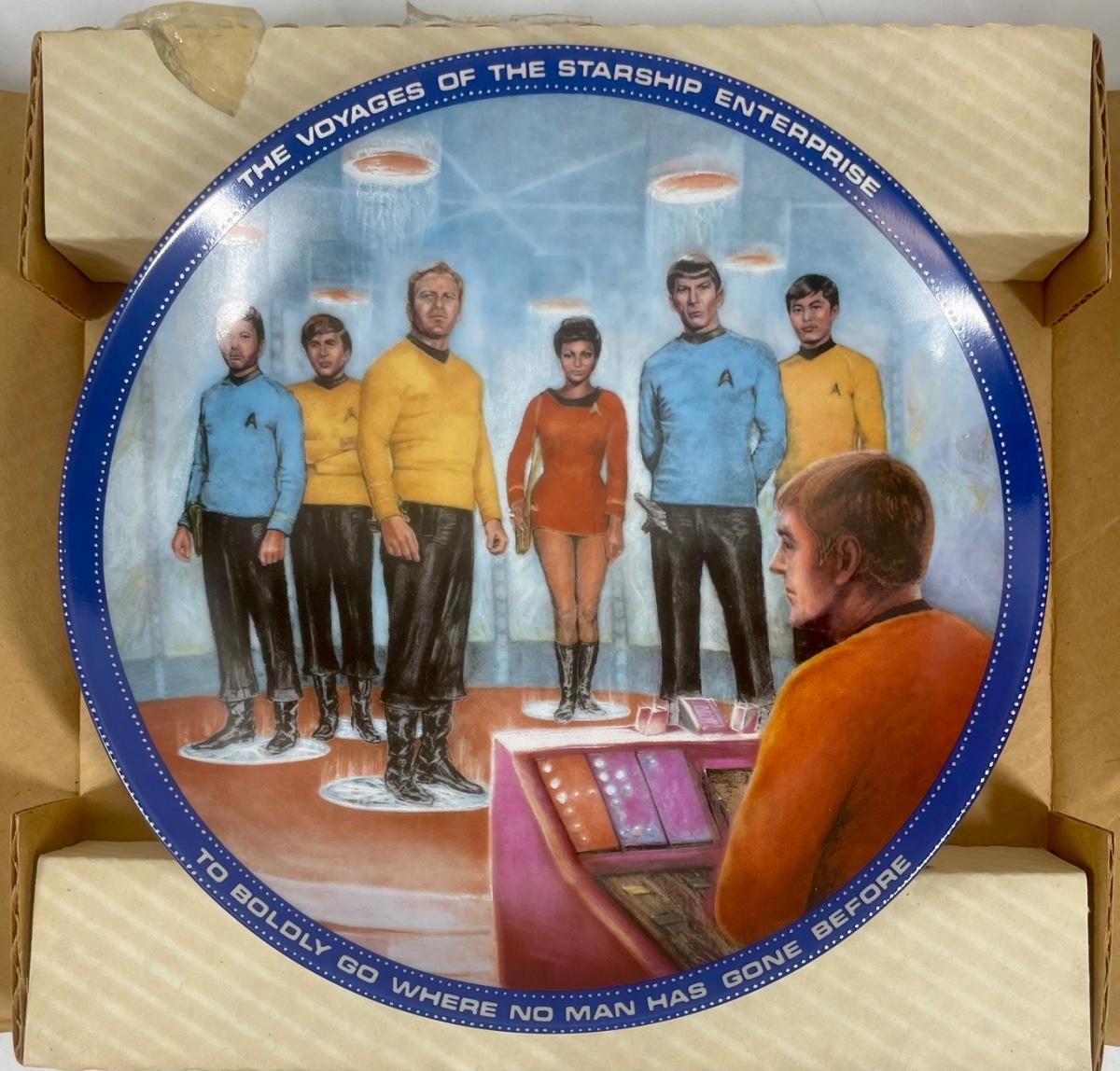 8 1/2” Star Trek Collector plate from 1984. Image of main cast of the original series in the Transporter Room. With certificate of authenticity, In original shipping box. Part of a set of 9, see other auctions for more.