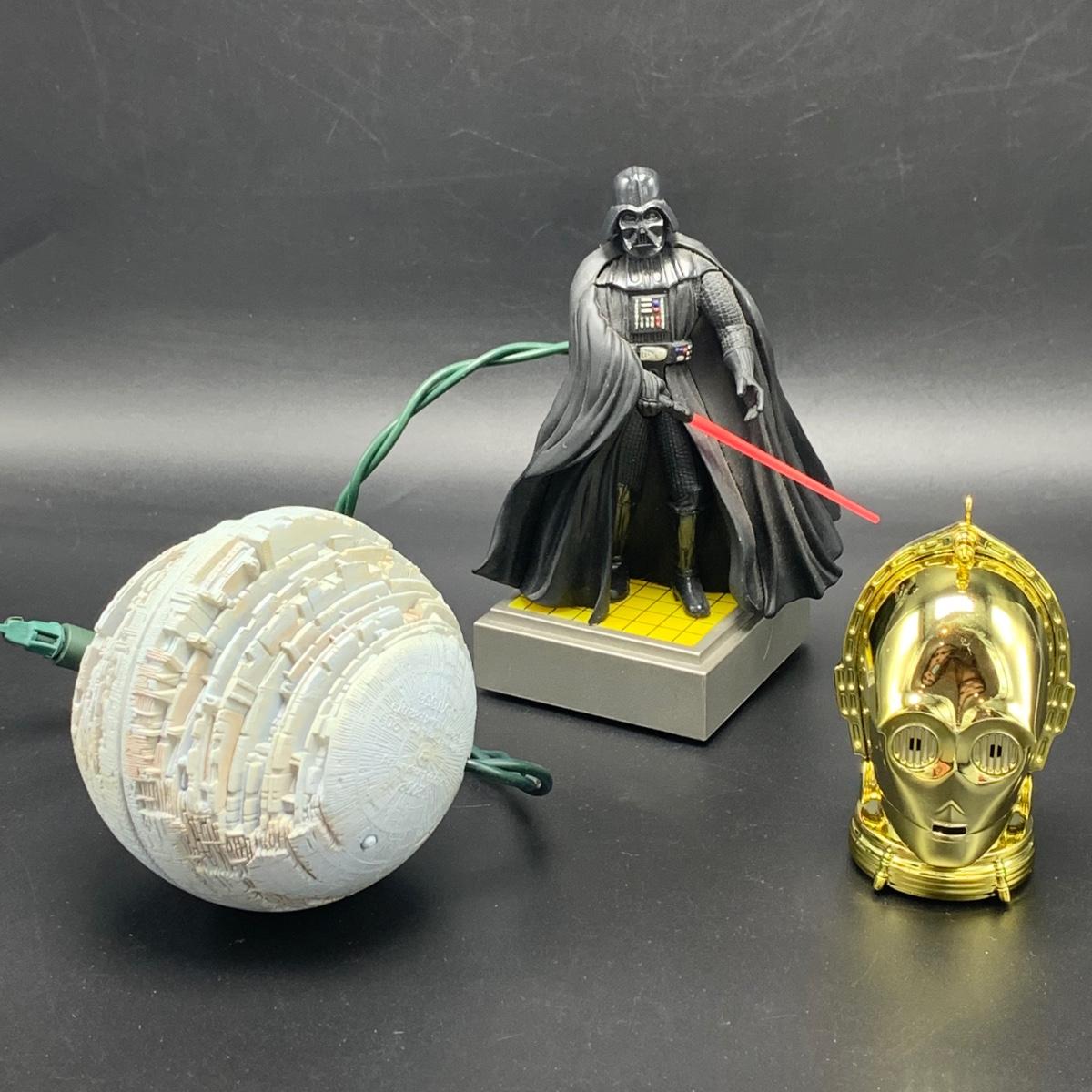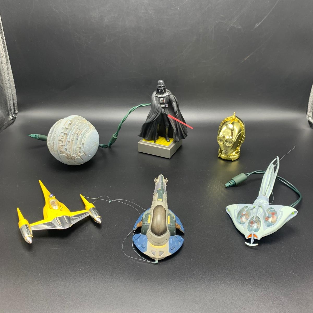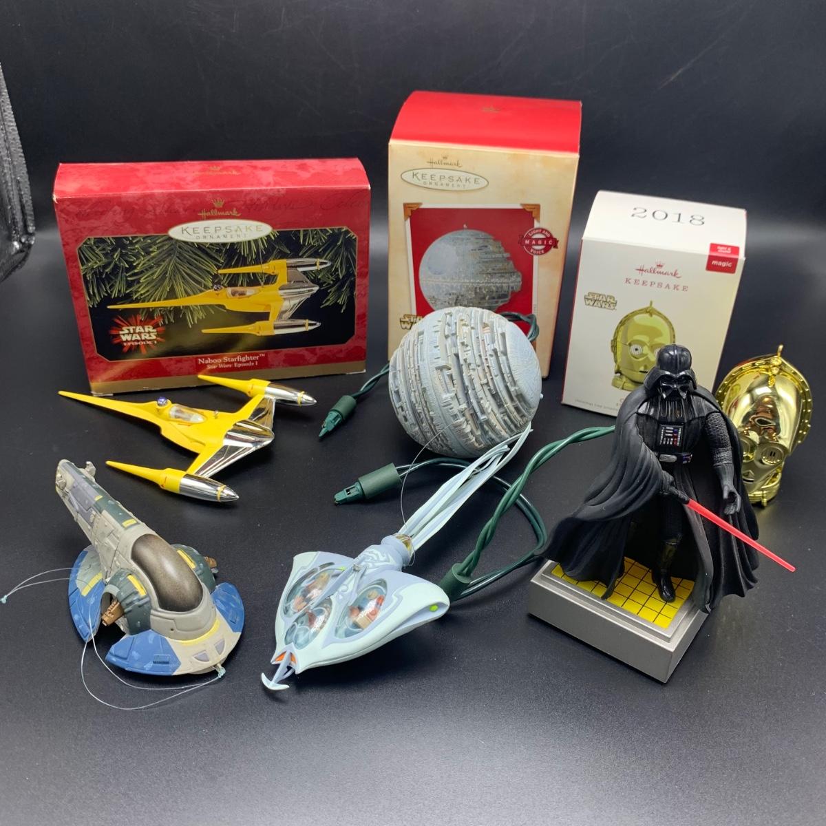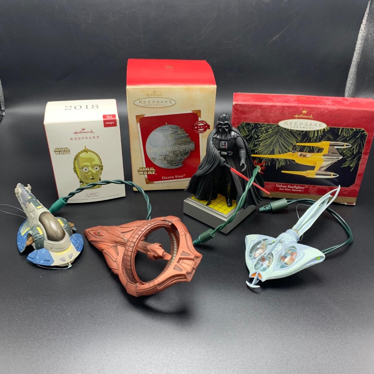 Seven Star Wars Hallmark keepsake ornaments. Three come with their original boxes. The Naboo Starfighter and the Slave Vehicle are not electronic. Of the electronic ornaments, C-3PO is the only one able to be tested; it speaks and lights up when its button is pressed. Items are plastic. The slave vehicle is a heavier plastic. It has pieces that appear to have been broken off and are missing. Darth Vader is the largest ornament and measures approximately 3” x 3” x 5”H.