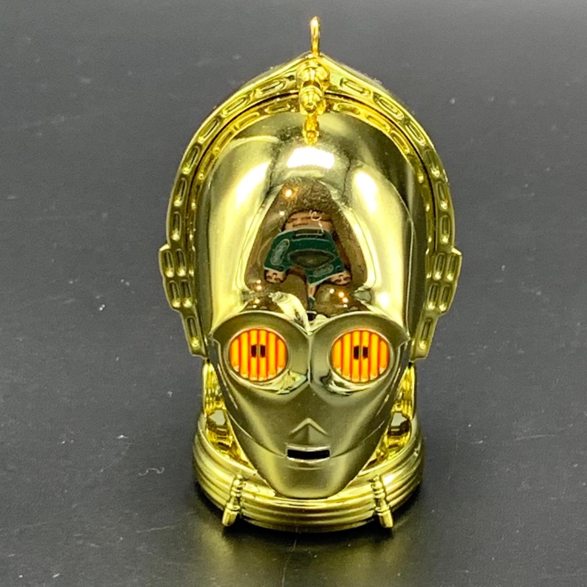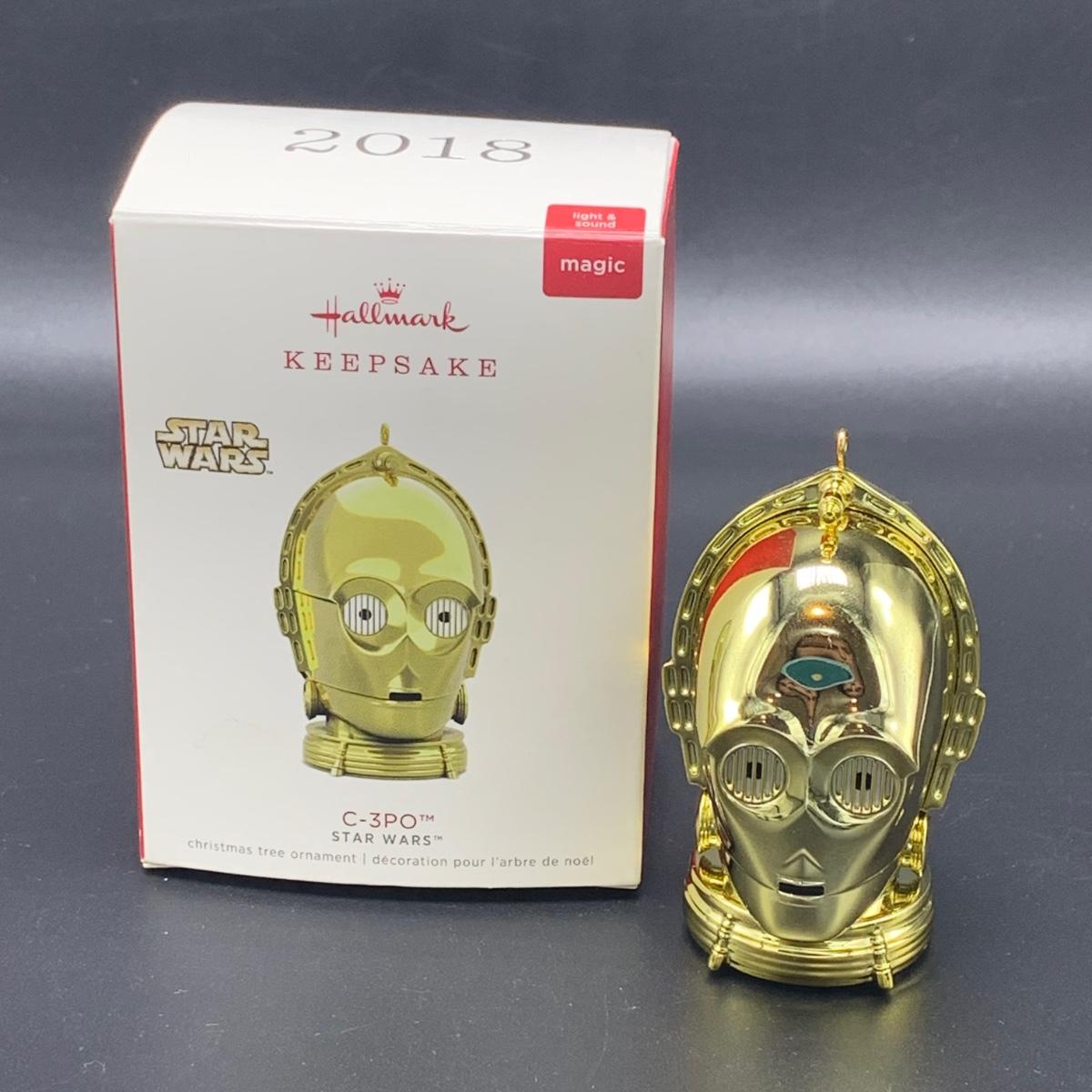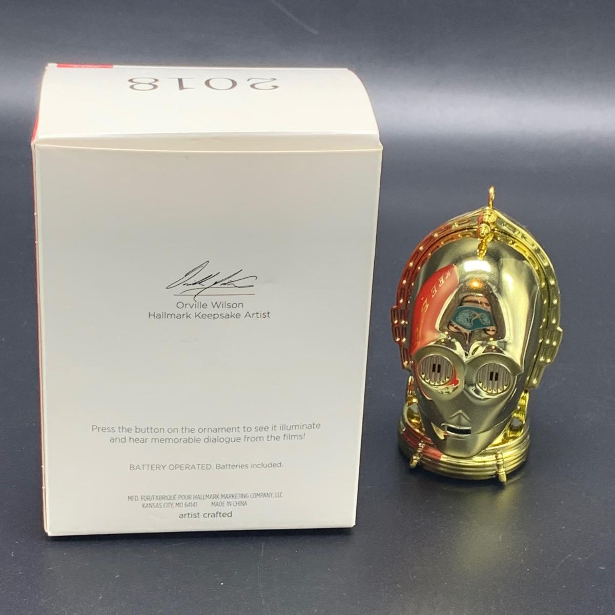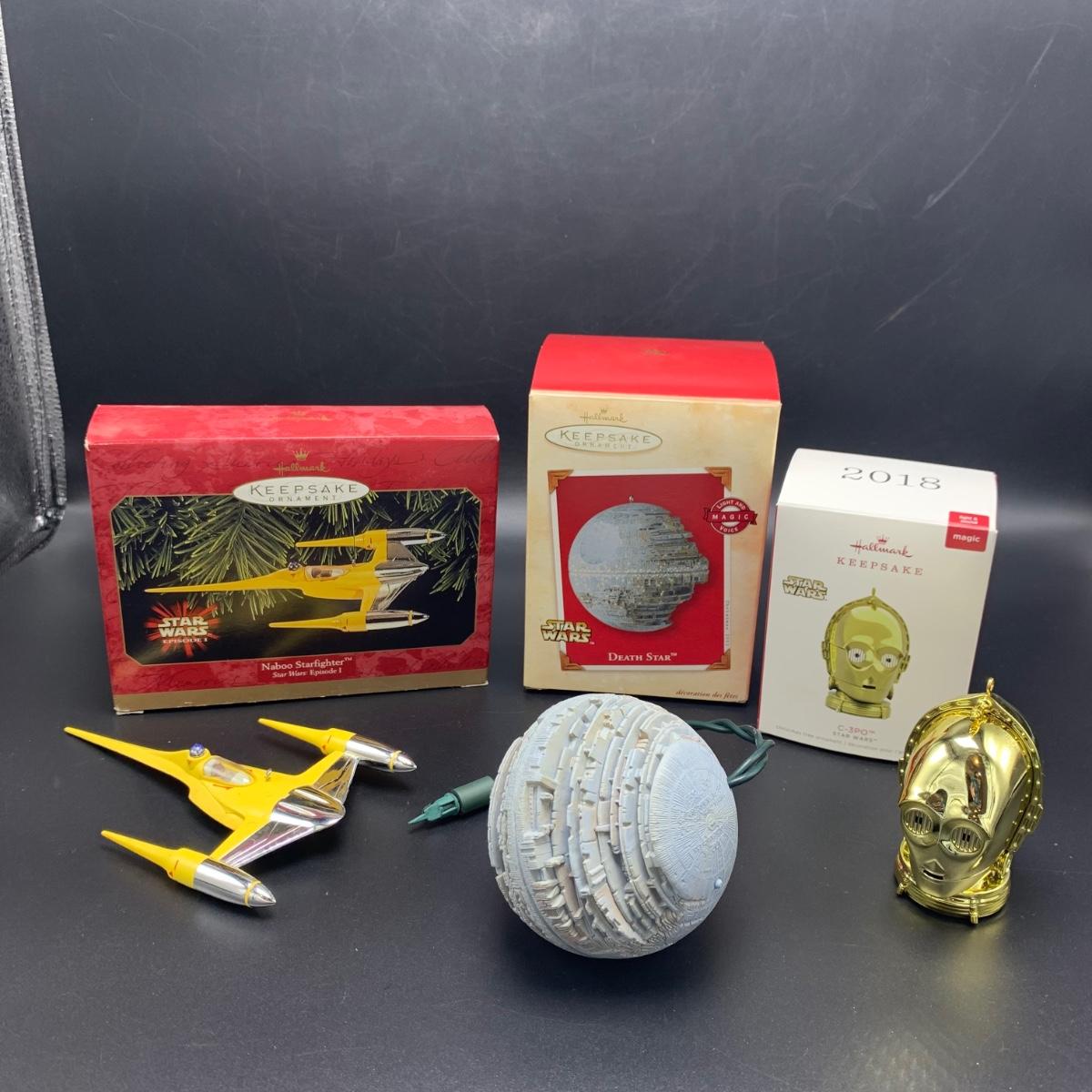 Seven Star Wars Hallmark keepsake ornaments. Three come with their original boxes. The Naboo Starfighter and the Slave Vehicle are not electronic. Of the electronic ornaments, C-3PO is the only one able to be tested; it speaks and lights up when its button is pressed. Items are plastic. The slave vehicle is a heavier plastic. It has pieces that appear to have been broken off and are missing. Darth Vader is the largest ornament and measures approximately 3” x 3” x 5”H.