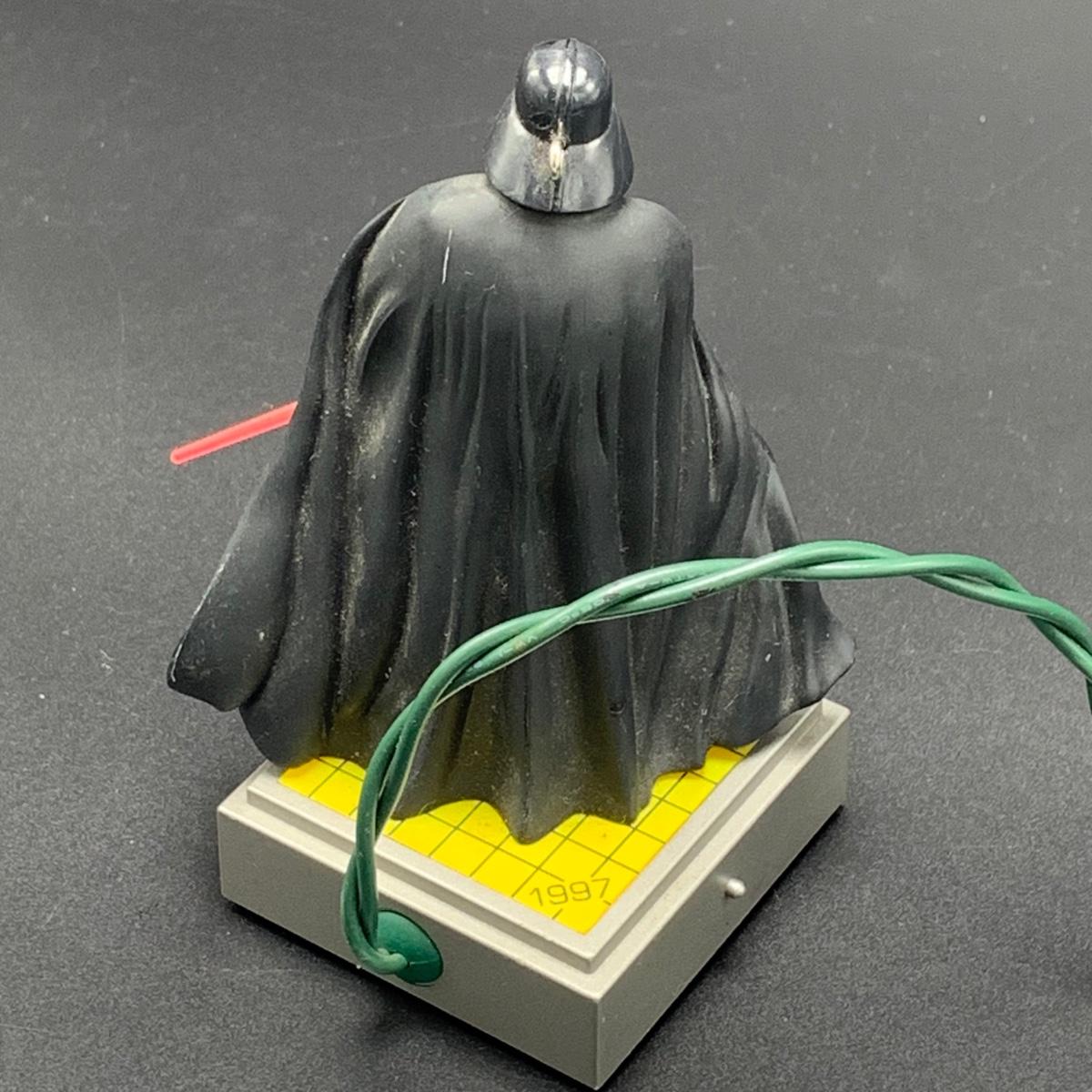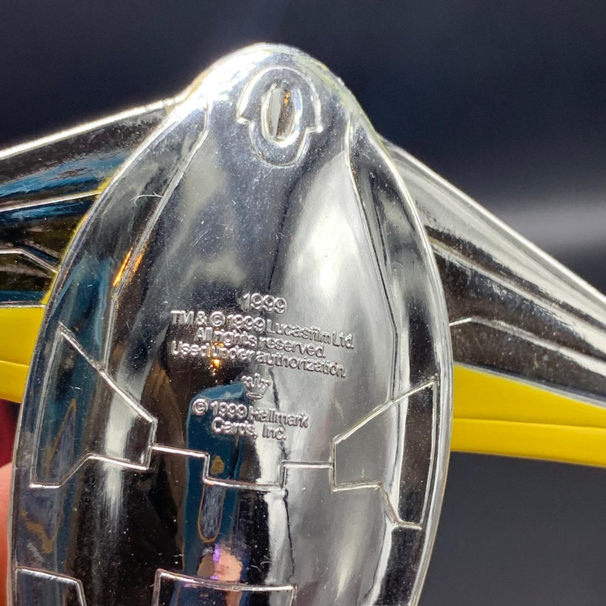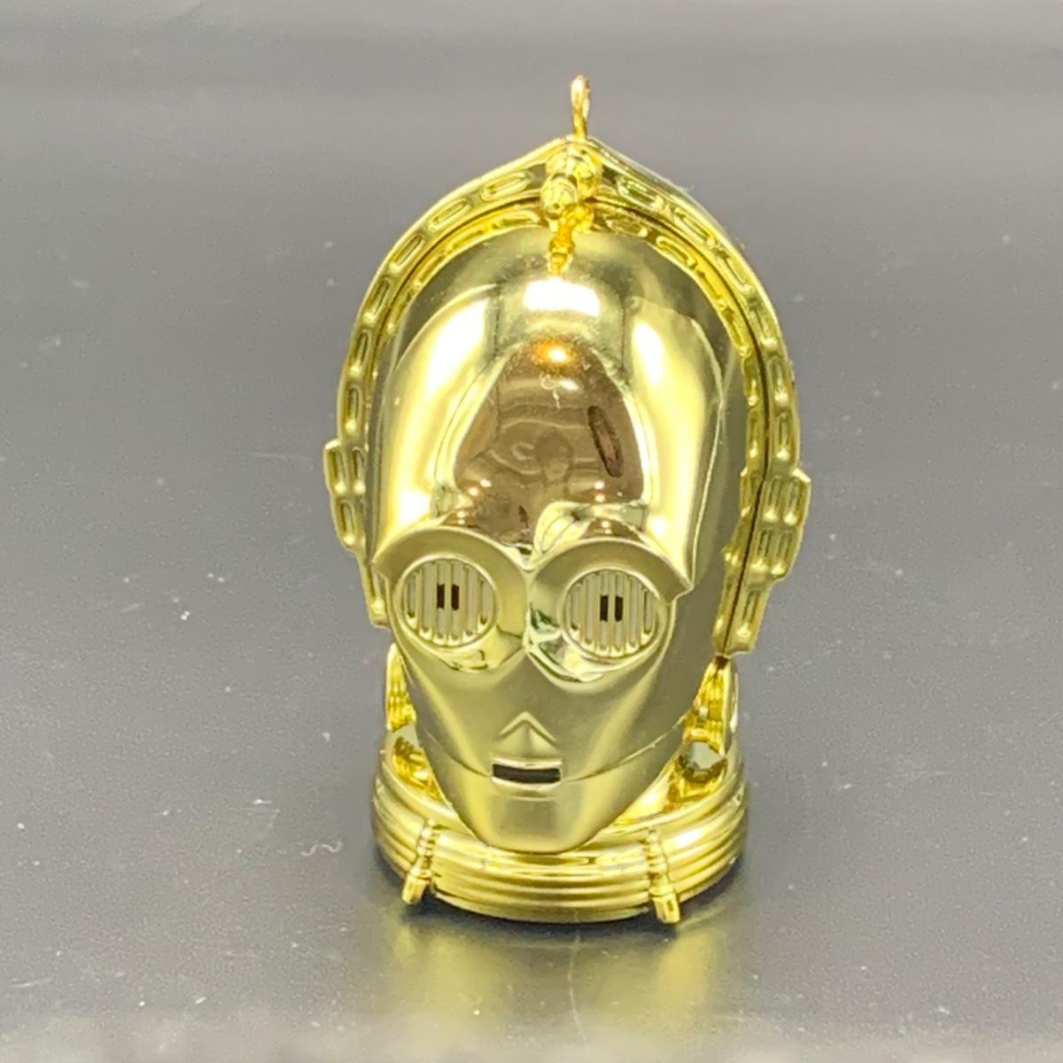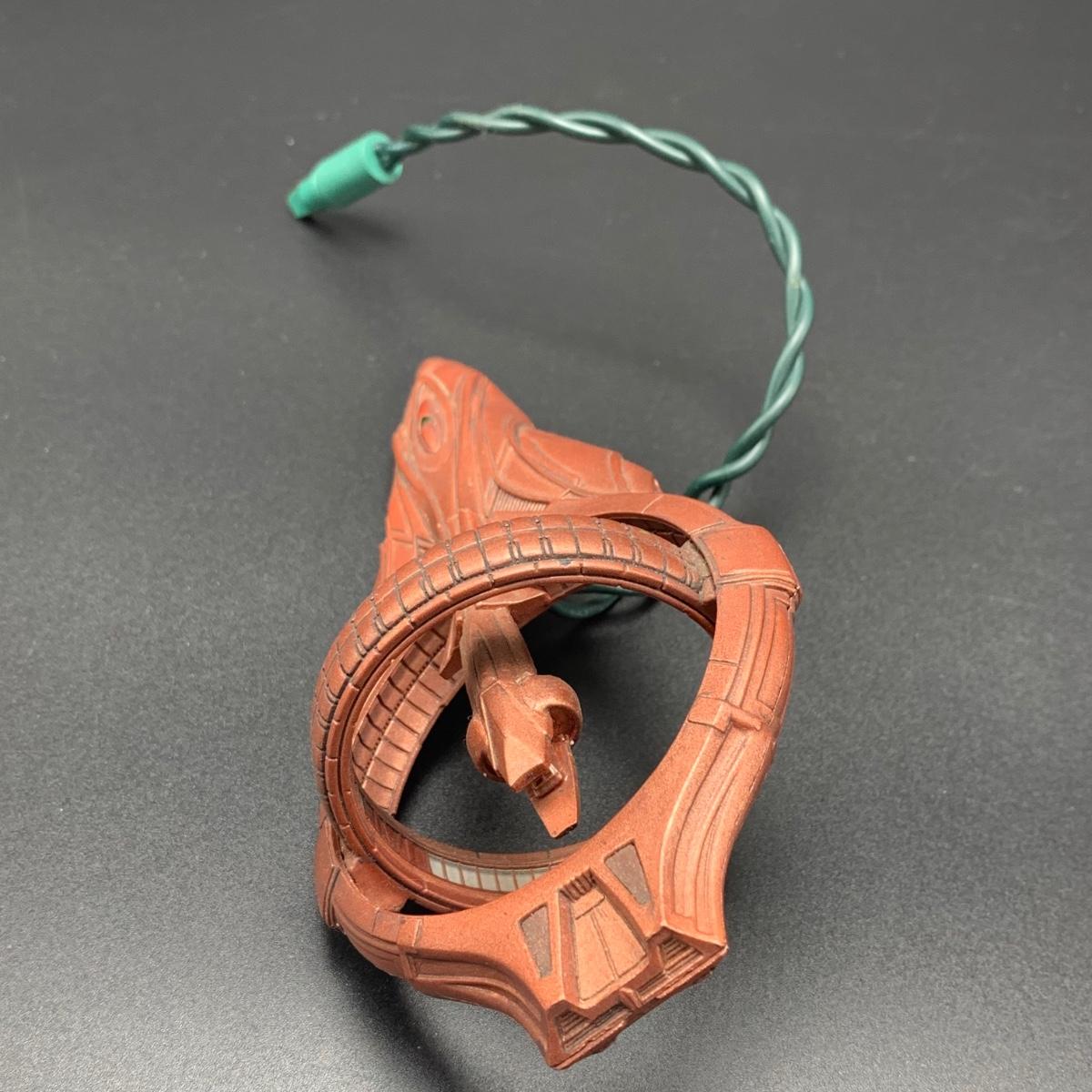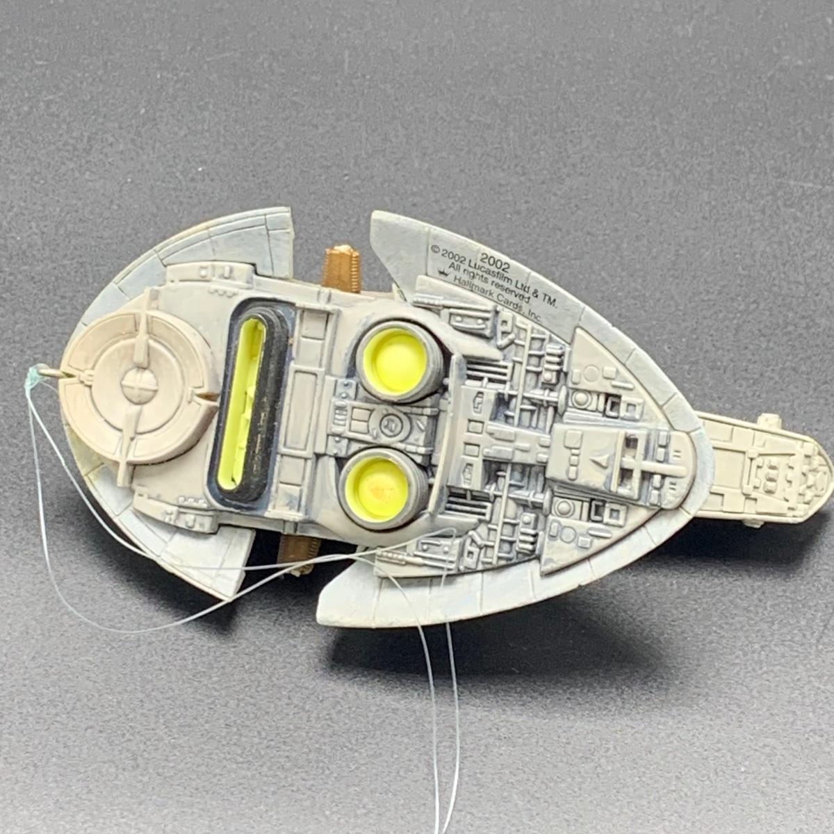 Seven Star Wars Hallmark keepsake ornaments. Three come with their original boxes. The Naboo Starfighter and the Slave Vehicle are not electronic. Of the electronic ornaments, C-3PO is the only one able to be tested; it speaks and lights up when its button is pressed. Items are plastic. The slave vehicle is a heavier plastic. It has pieces that appear to have been broken off and are missing. Darth Vader is the largest ornament and measures approximately 3” x 3” x 5”H.