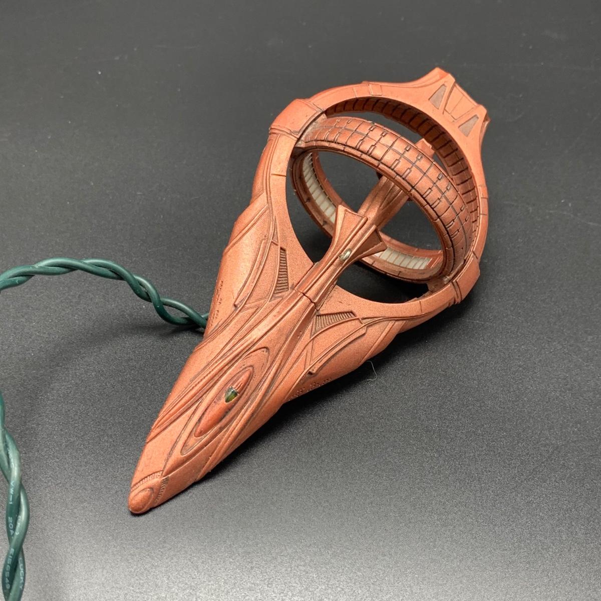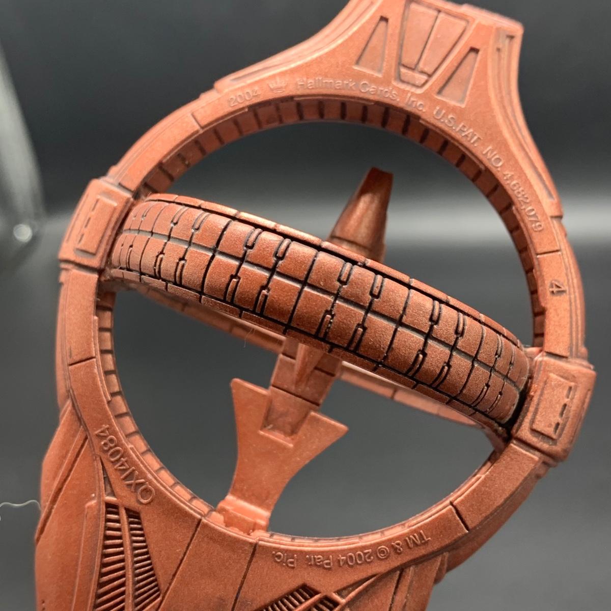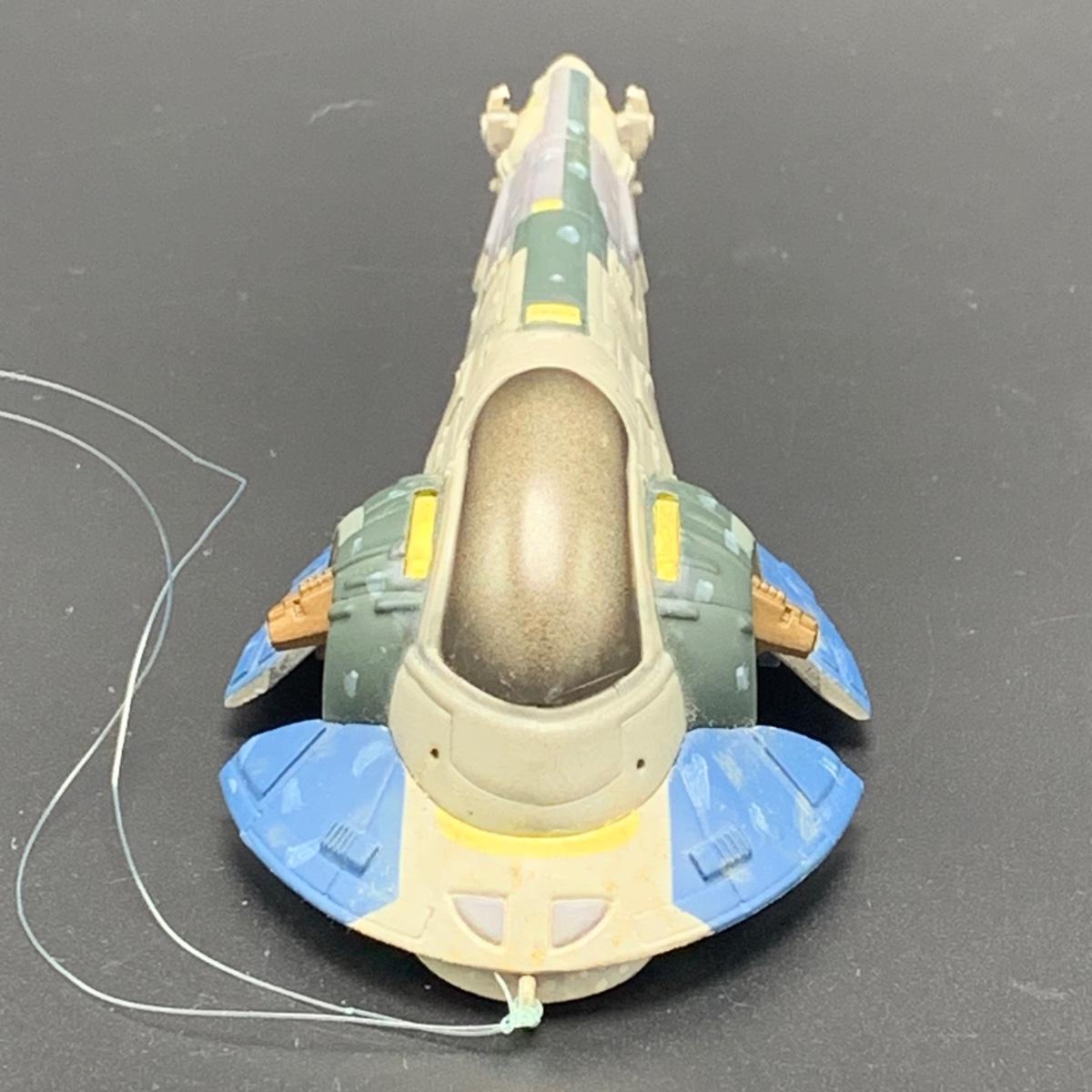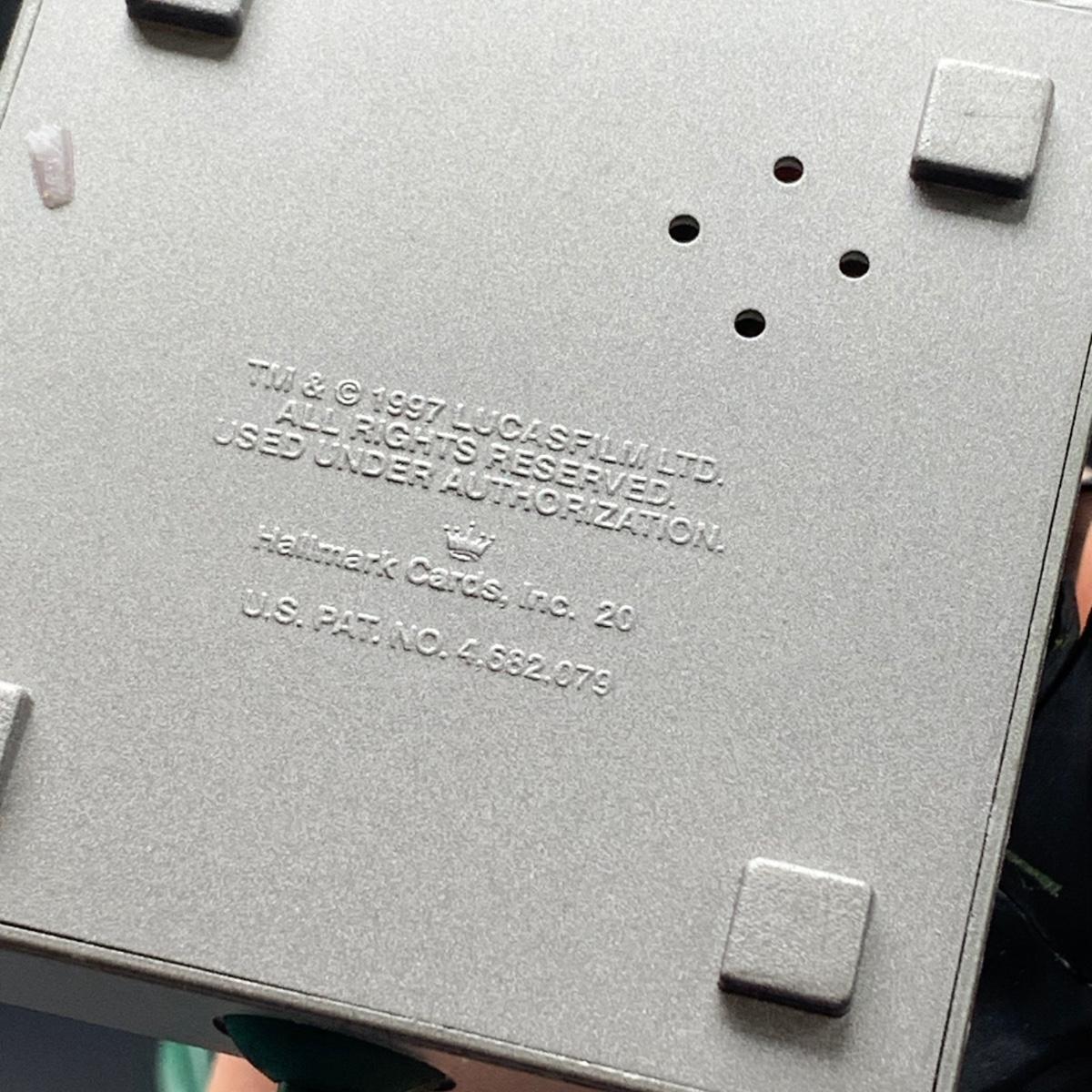 Seven Star Wars Hallmark keepsake ornaments. Three come with their original boxes. The Naboo Starfighter and the Slave Vehicle are not electronic. Of the electronic ornaments, C-3PO is the only one able to be tested; it speaks and lights up when its button is pressed. Items are plastic. The slave vehicle is a heavier plastic. It has pieces that appear to have been broken off and are missing. Darth Vader is the largest ornament and measures approximately 3” x 3” x 5”H.