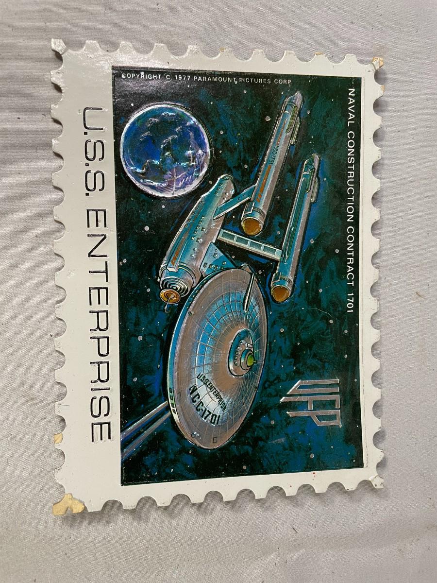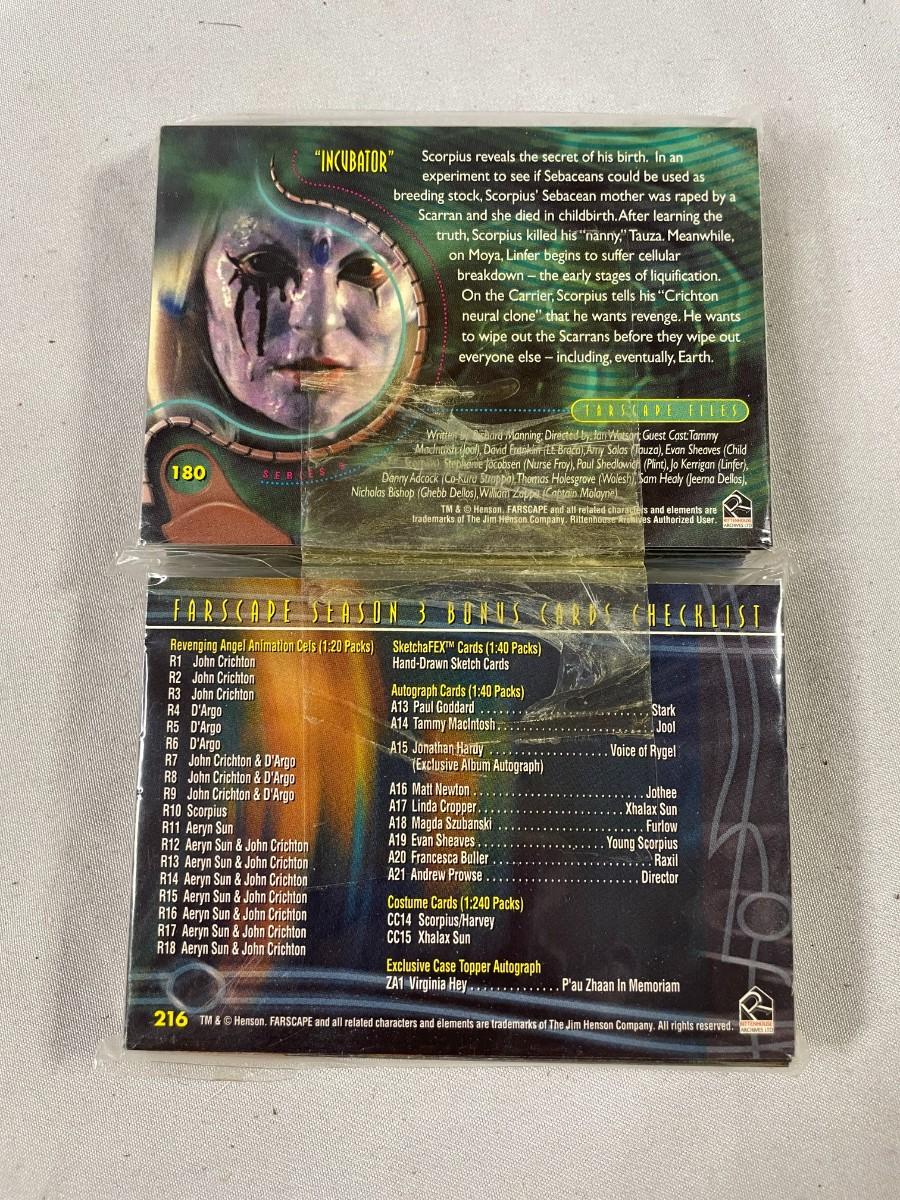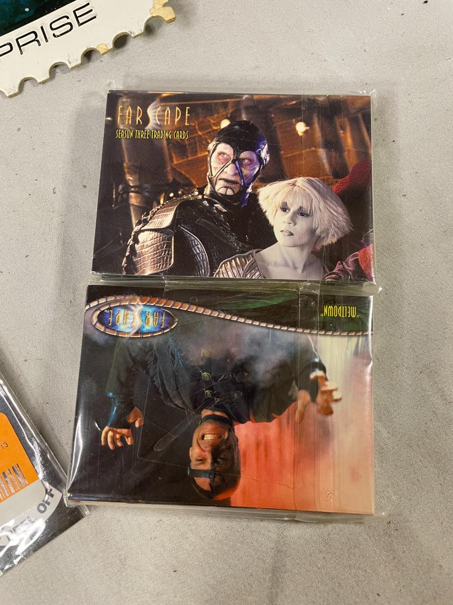 There is a spot of damage at the bottom of the stamp replica, otherwise everything is in new condition. The Farscape trading cards are still in their original sealed cellophane.