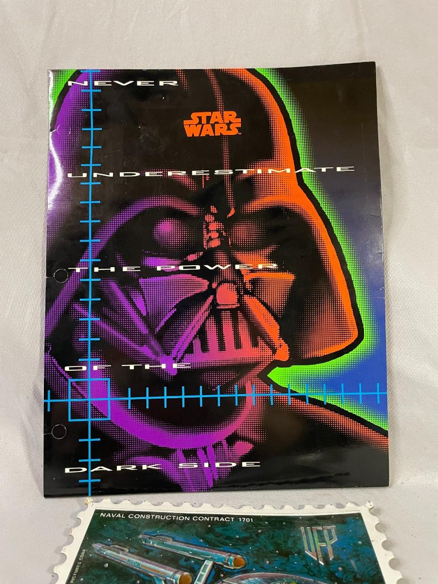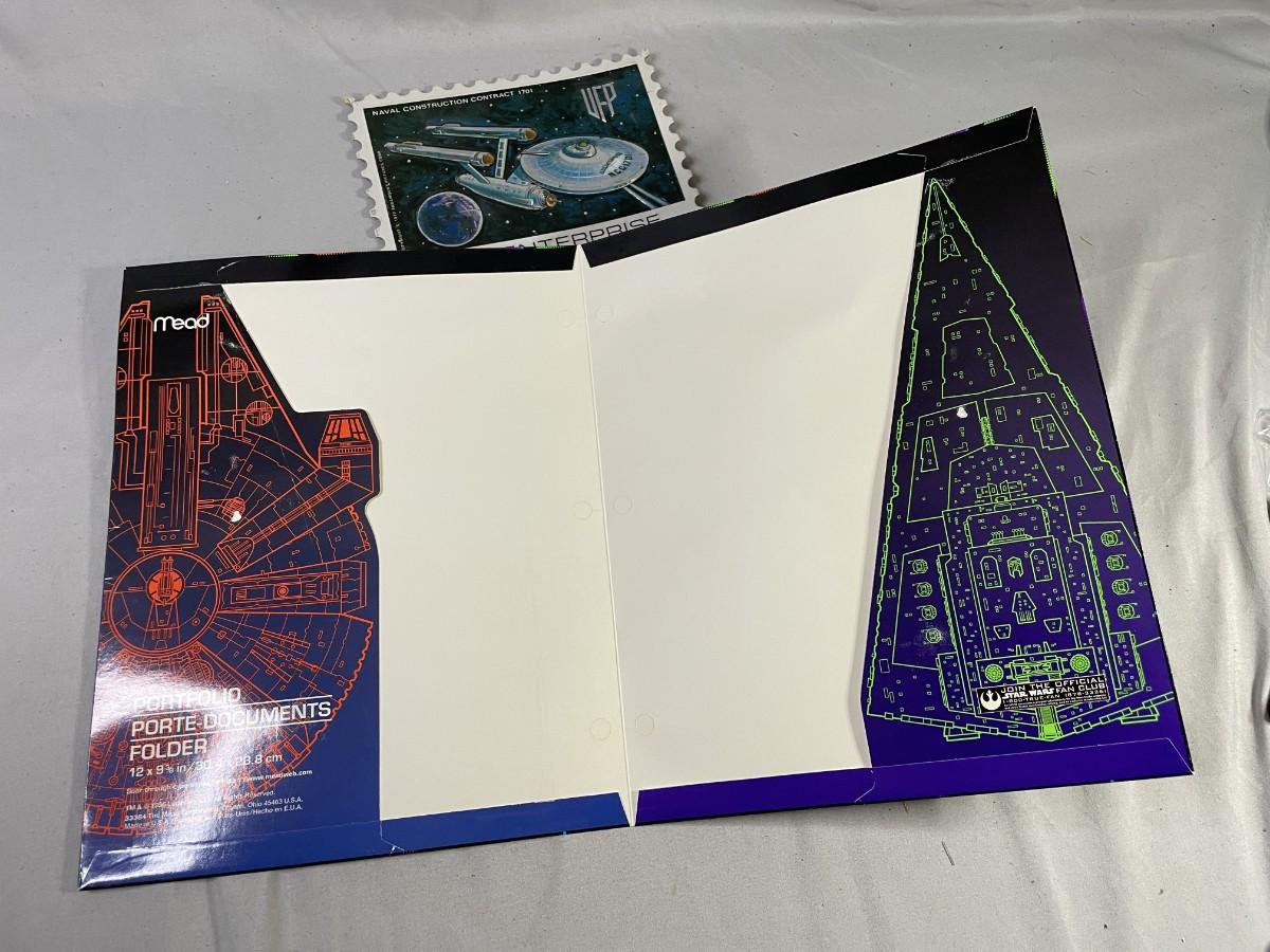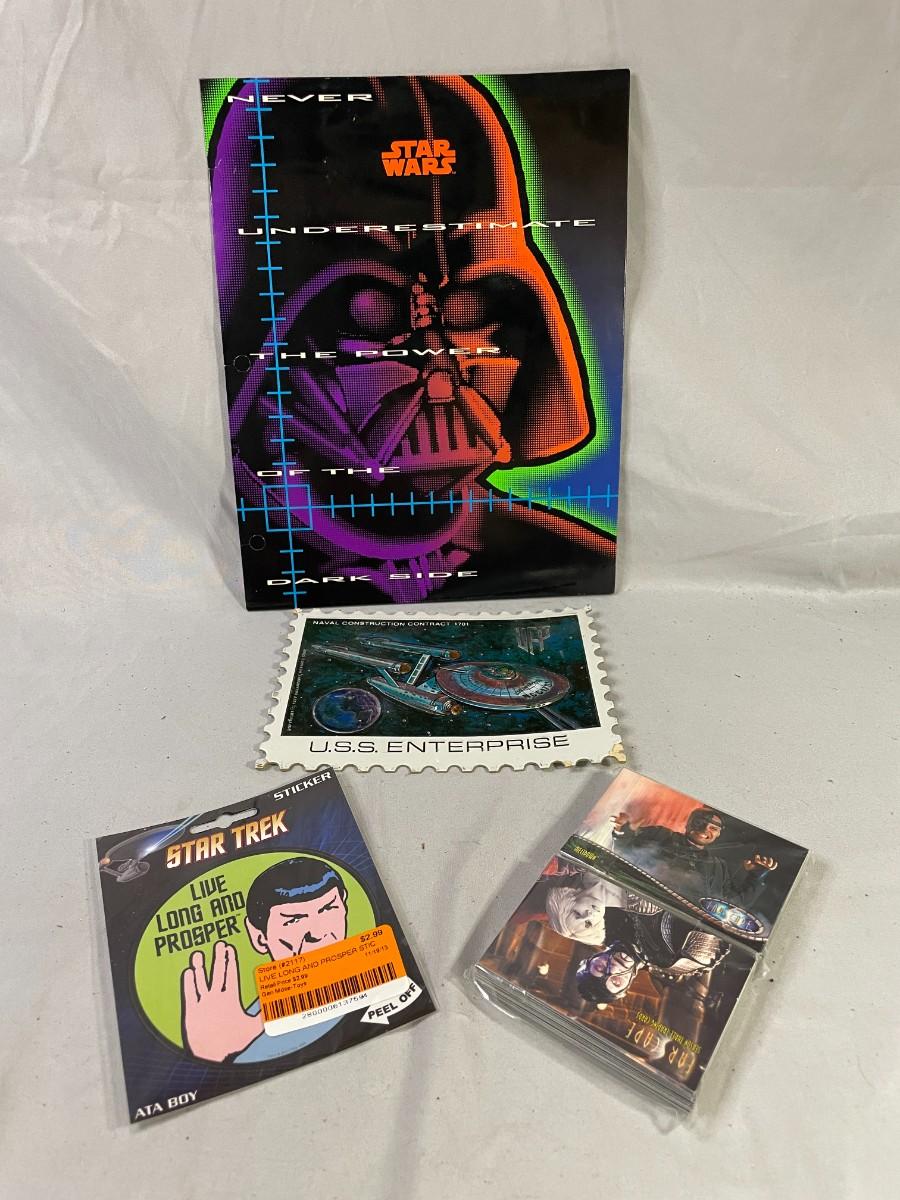 There is a spot of damage at the bottom of the stamp replica, otherwise everything is in new condition. The Farscape trading cards are still in their original sealed cellophane.
