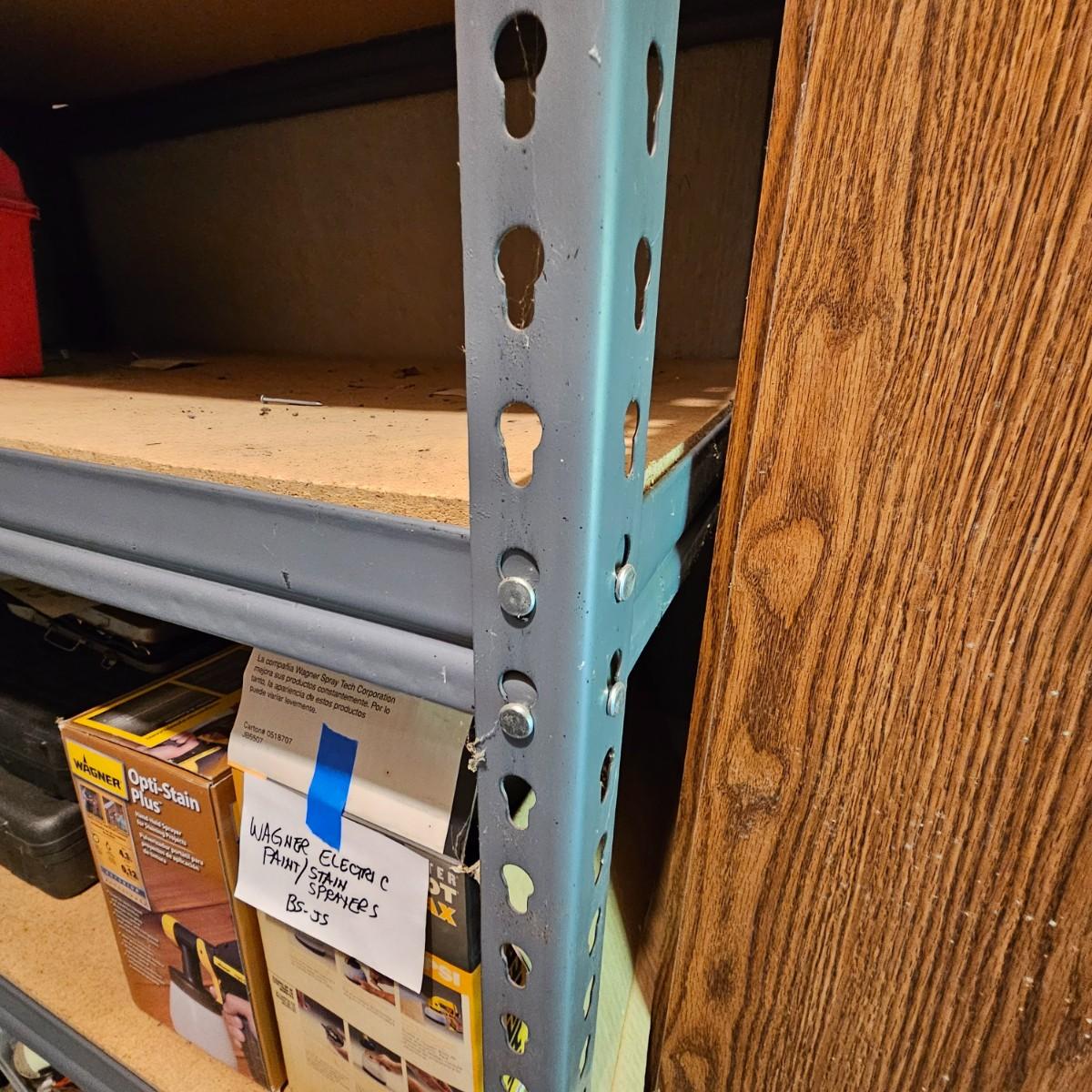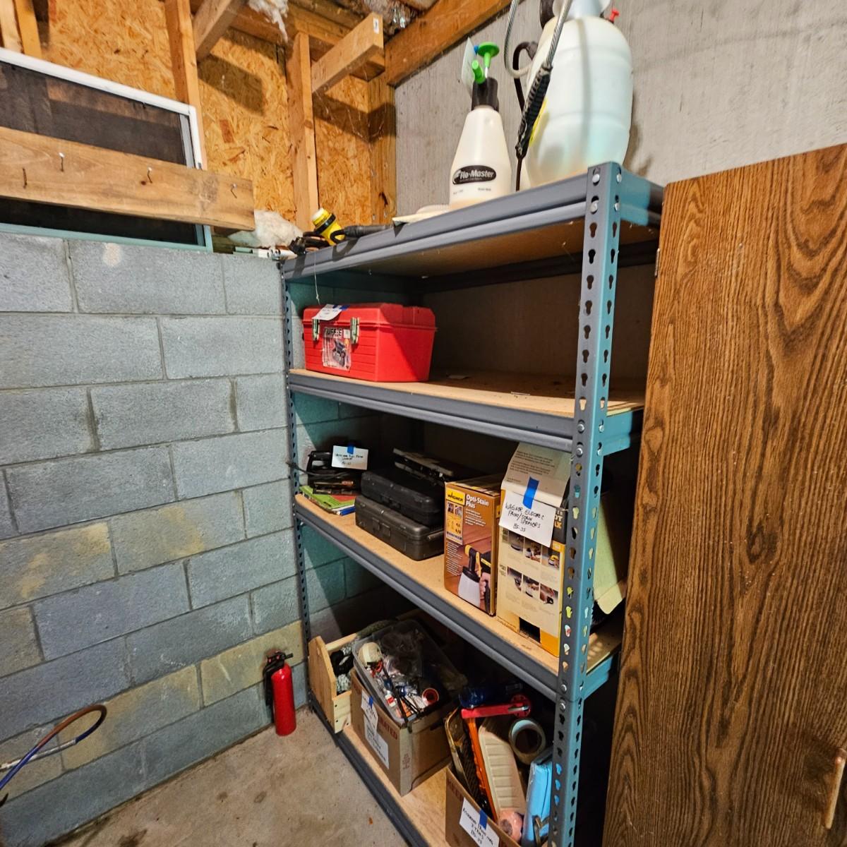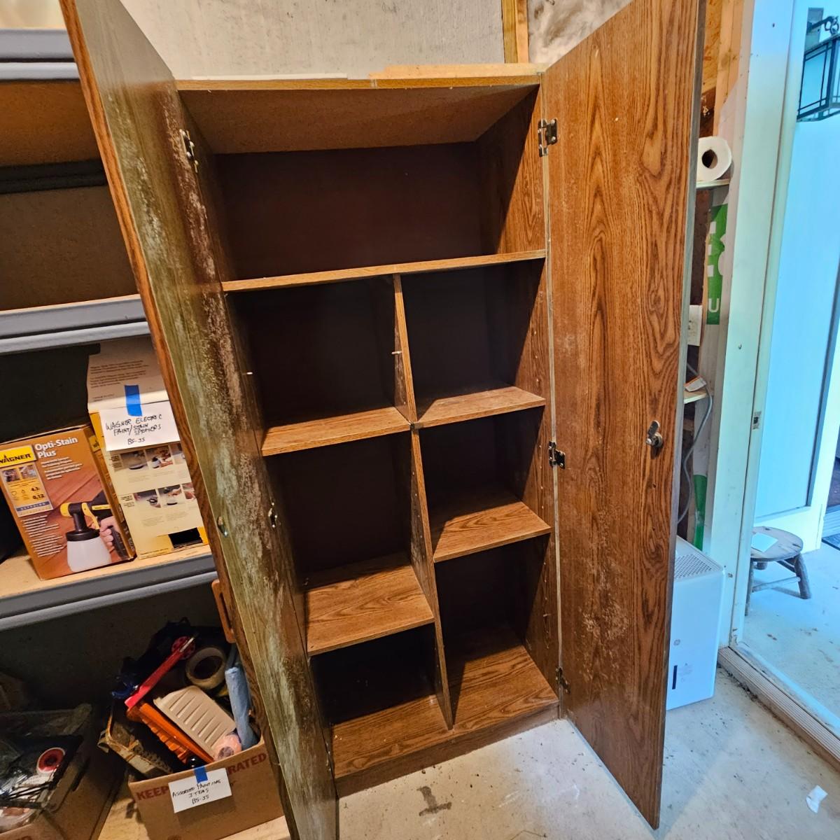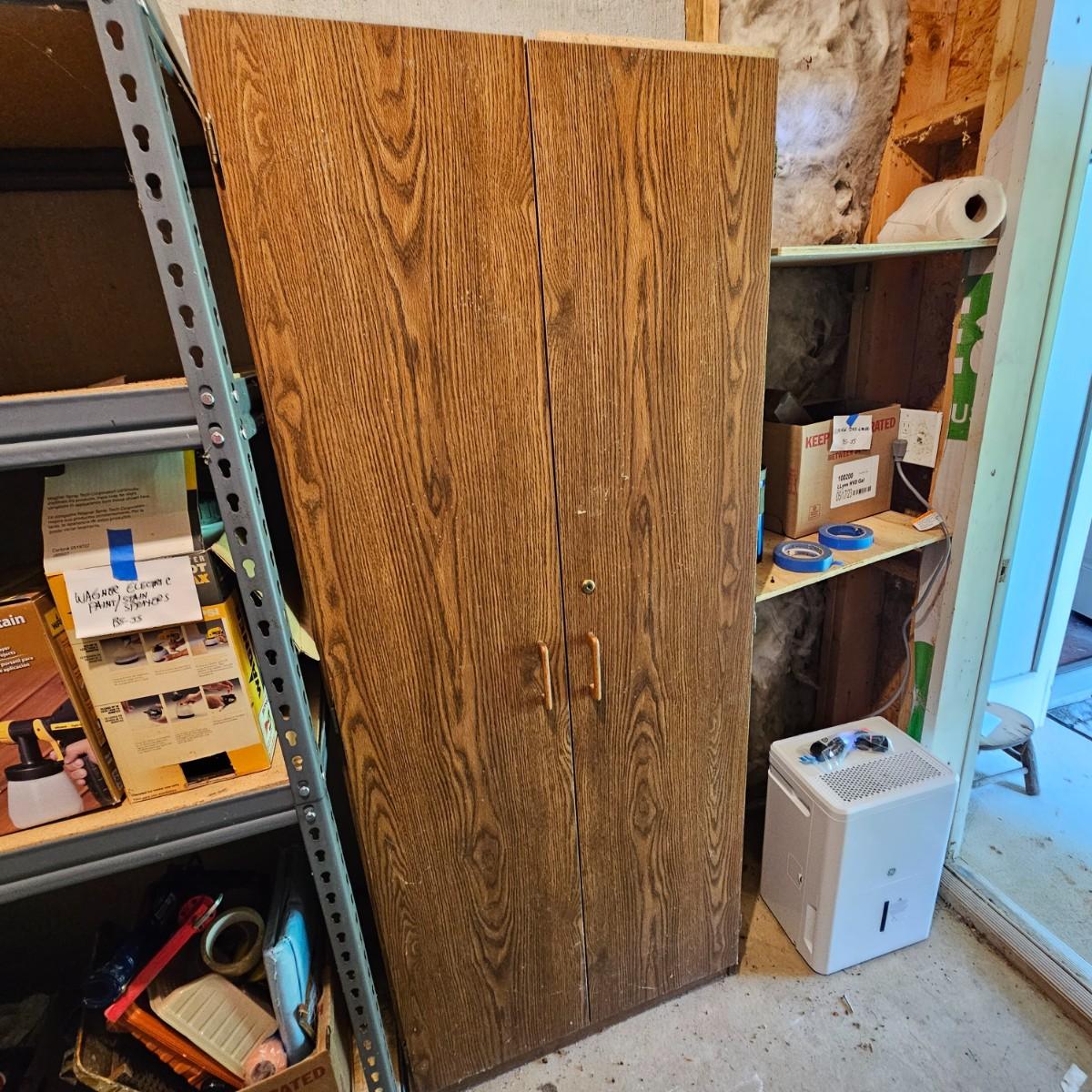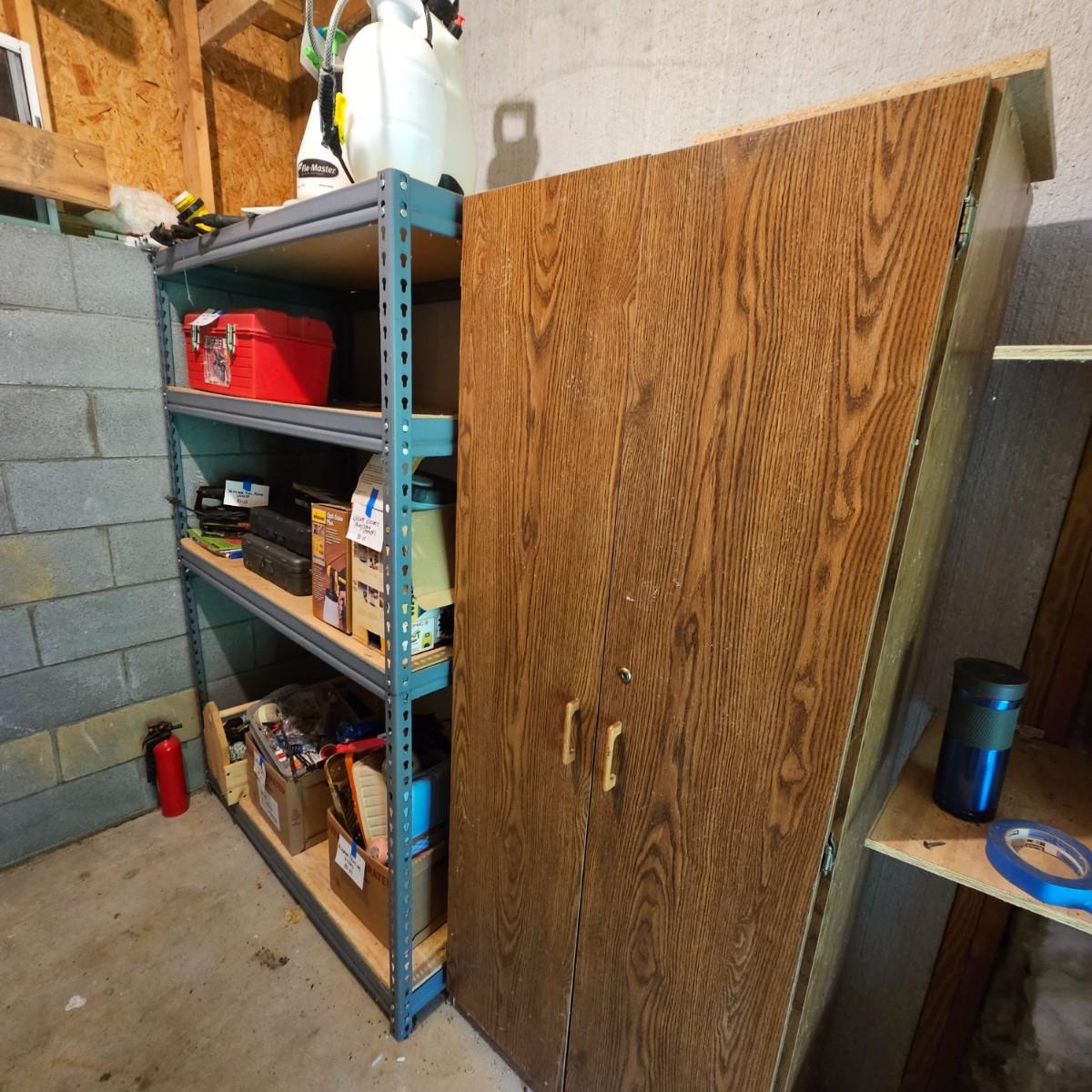One steel set of shelves with particle board inserts. 48" x 24" x 72"H. Please note, items on shelf do not go with shelf but are available within this sale. Also includes a wood two door storage cabinet with inside shelves. Some mold & mildew inside/outside that will need cleaning. 30" x 16" x 72"H. See photos for details. Local pickup only.