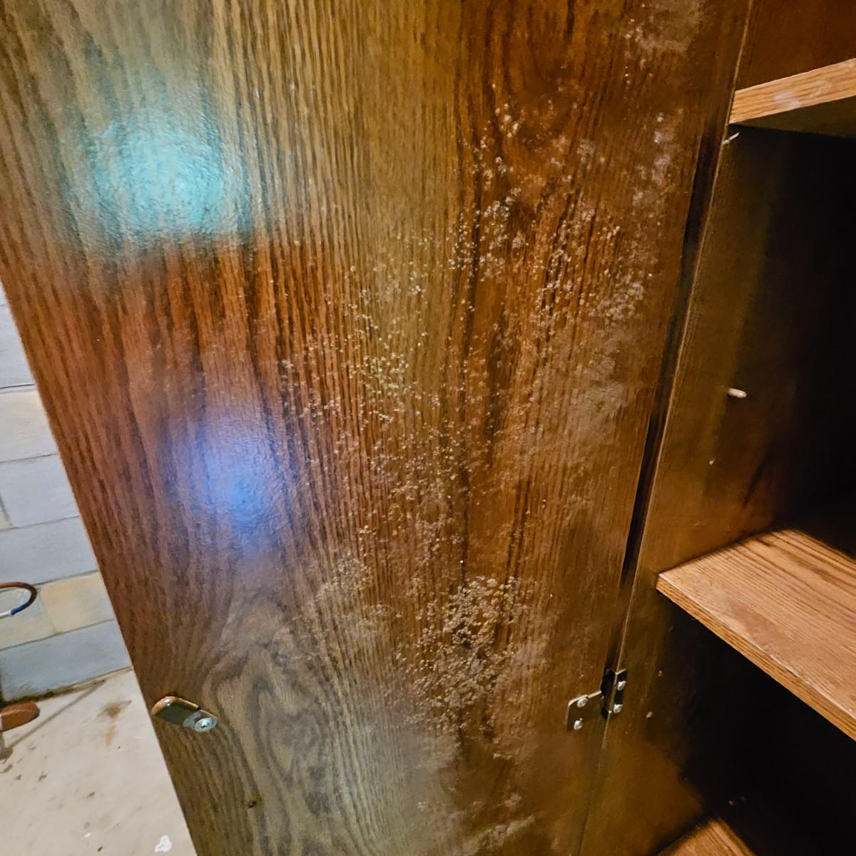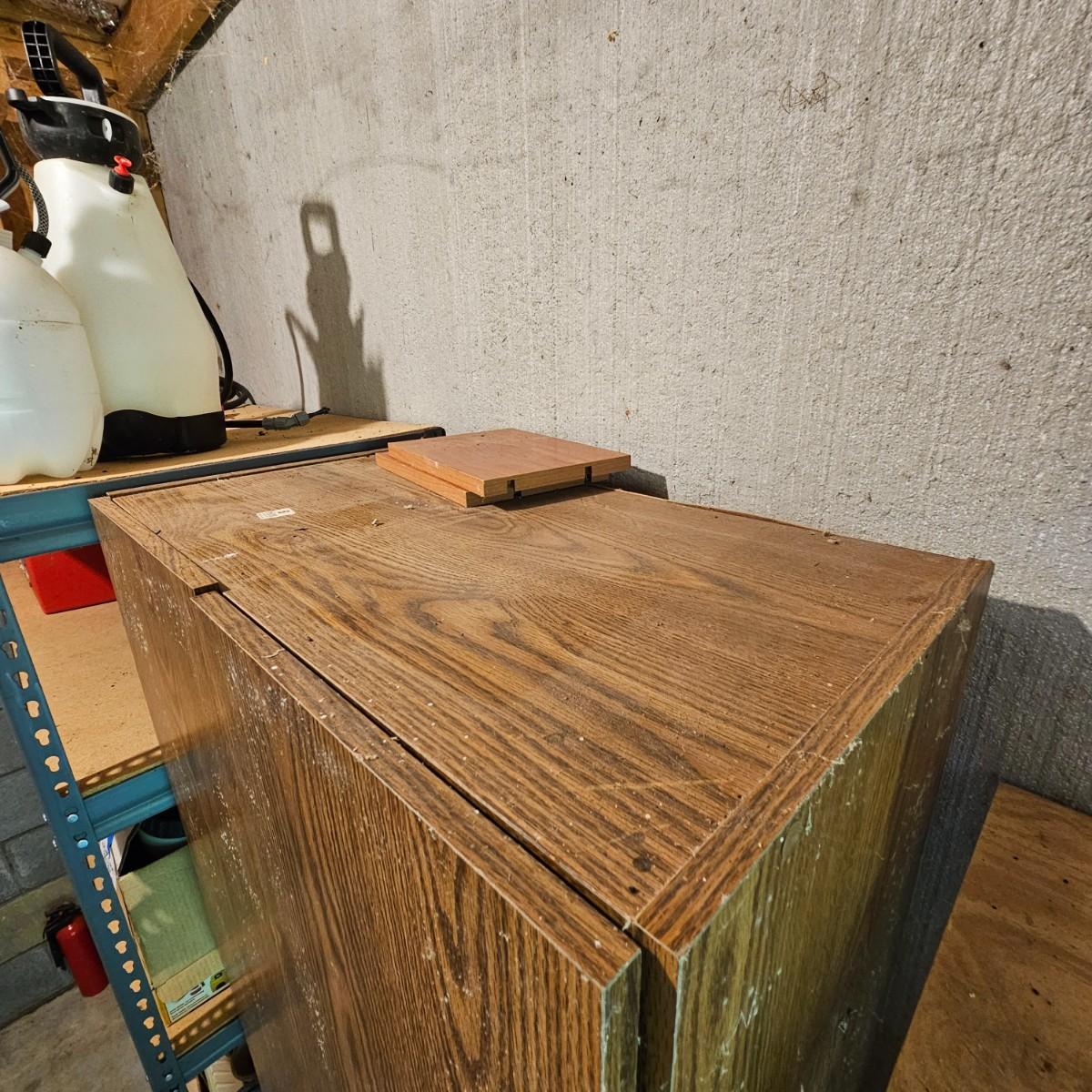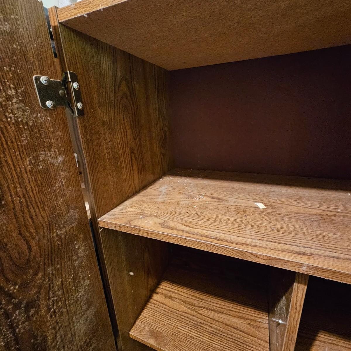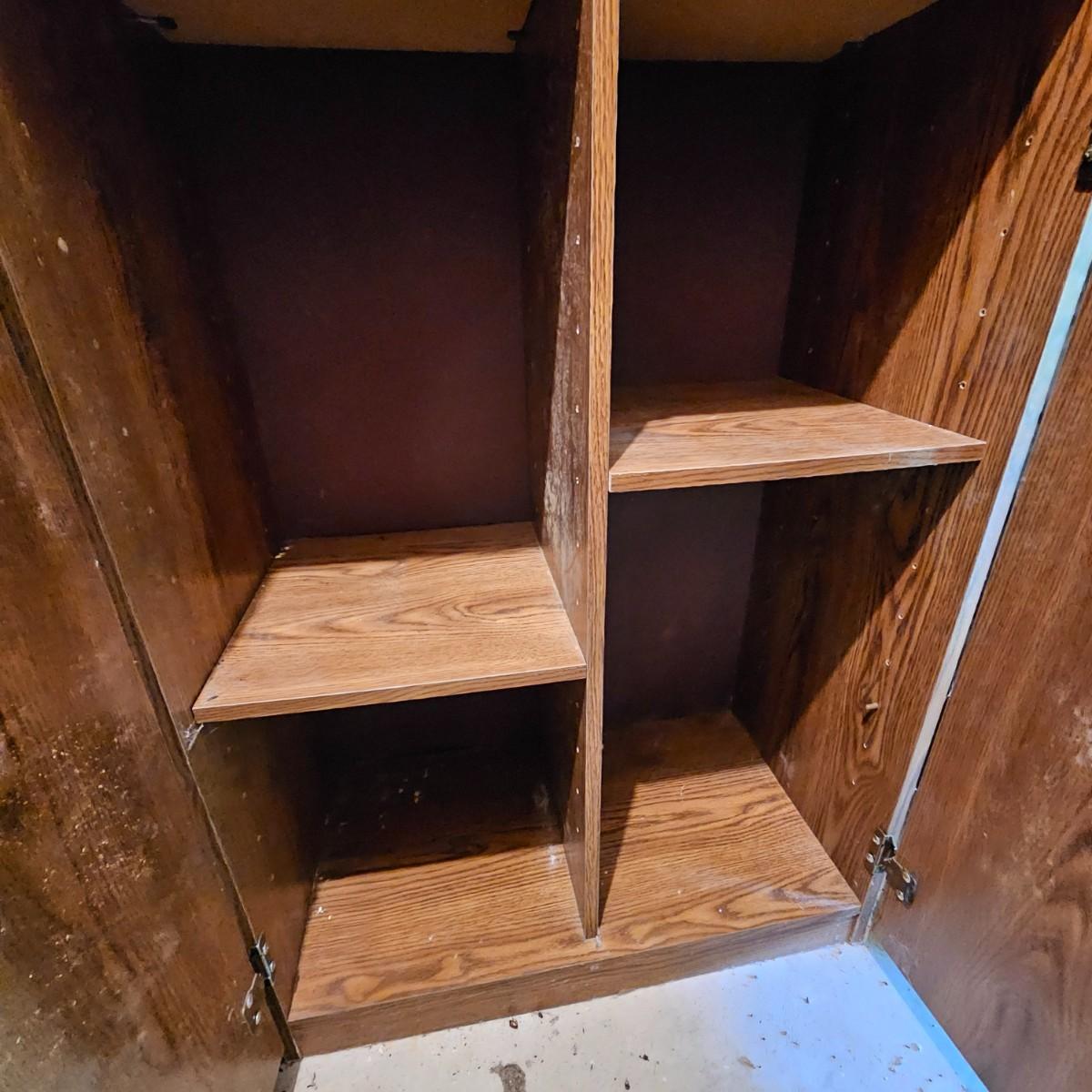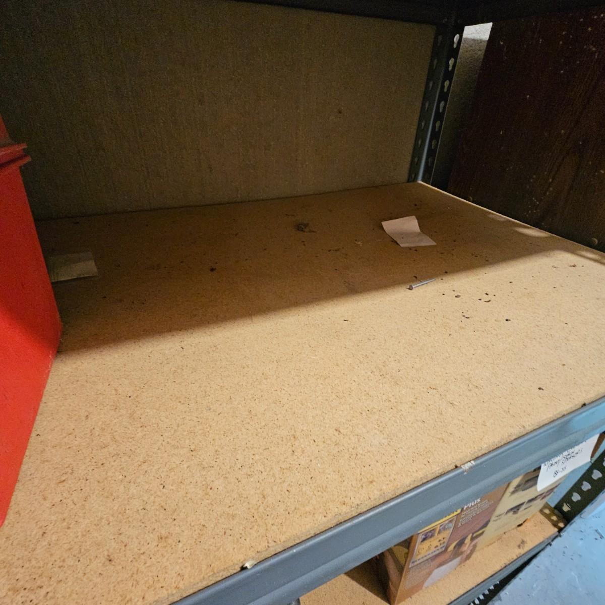 One steel set of shelves with particle board inserts. 48" x 24" x 72"H. Please note, items on shelf do not go with shelf but are available within this sale. Also includes a wood two door storage cabinet with inside shelves. Some mold & mildew inside/outside that will need cleaning. 30" x 16" x 72"H. See photos for details. Local pickup only.