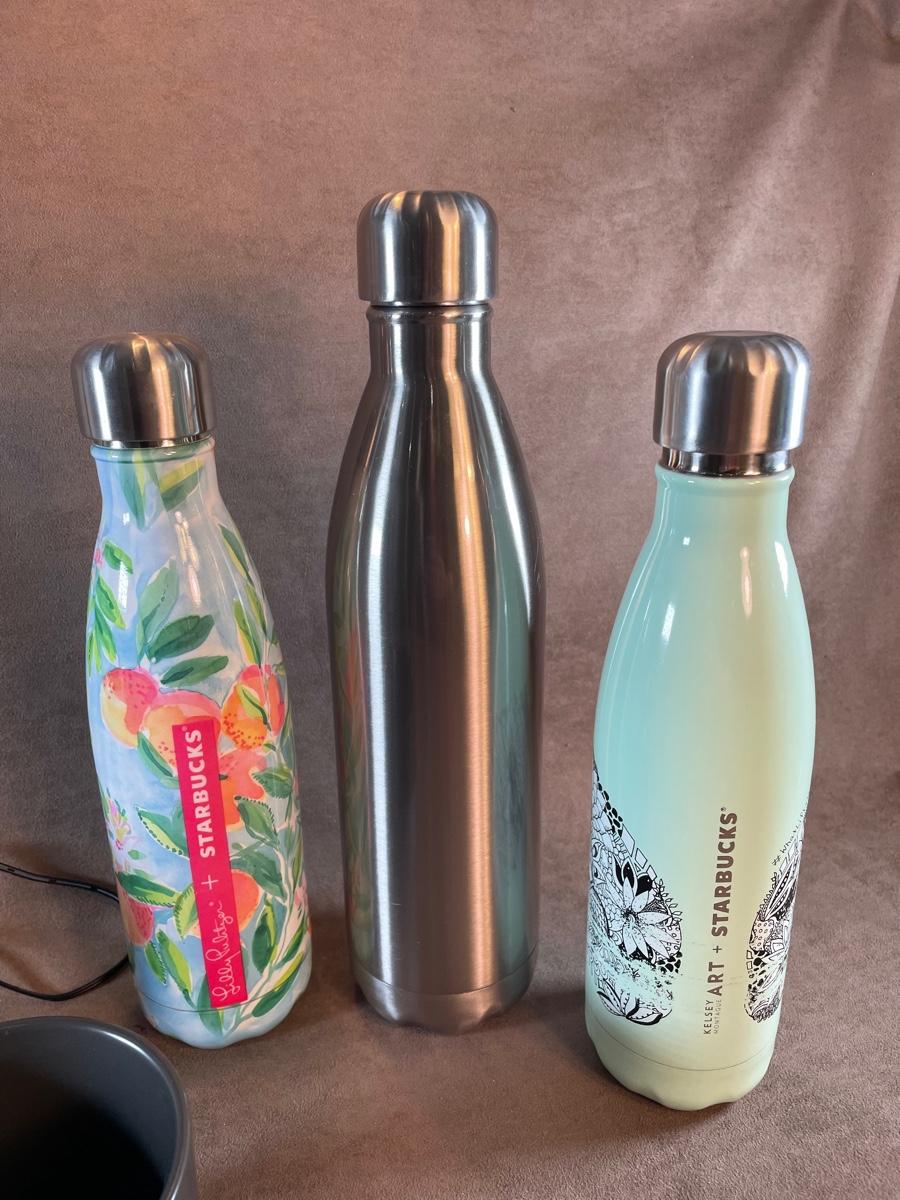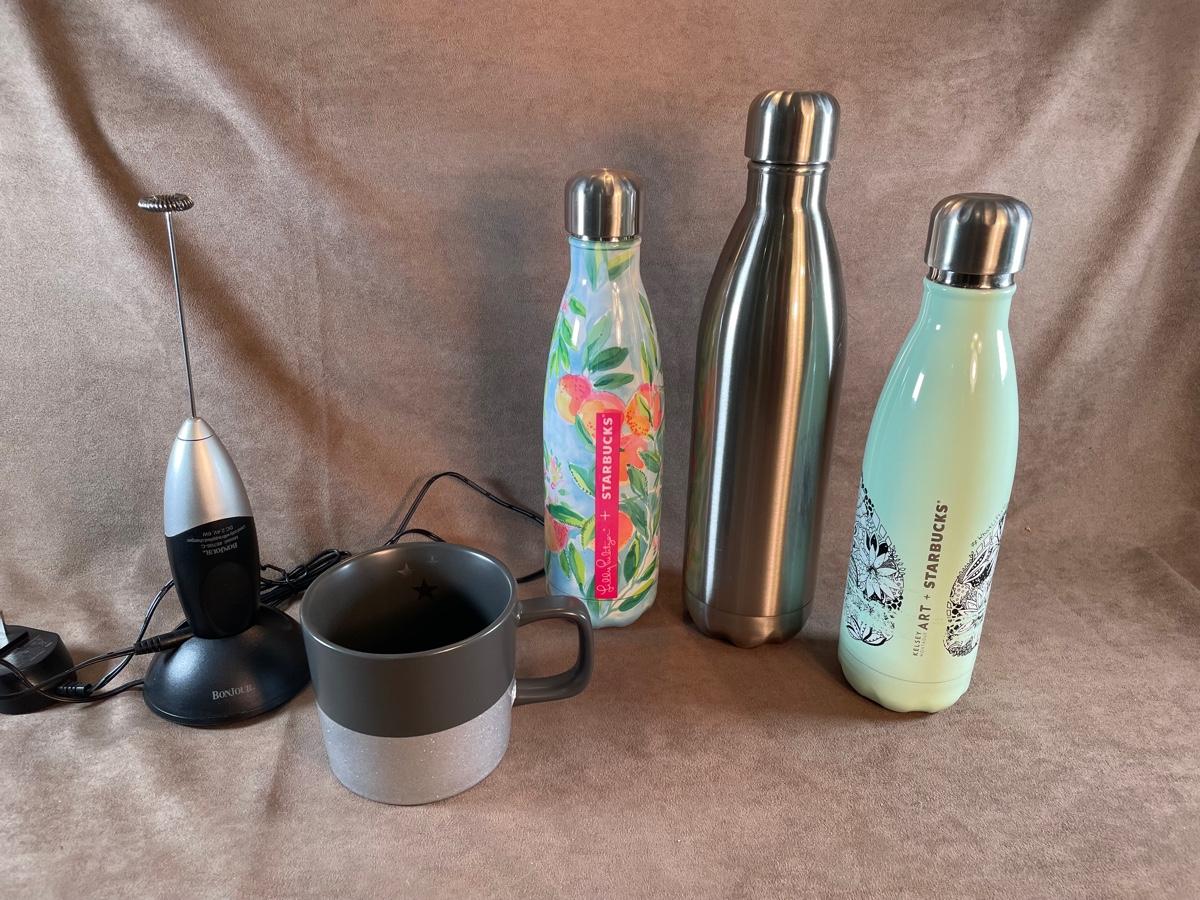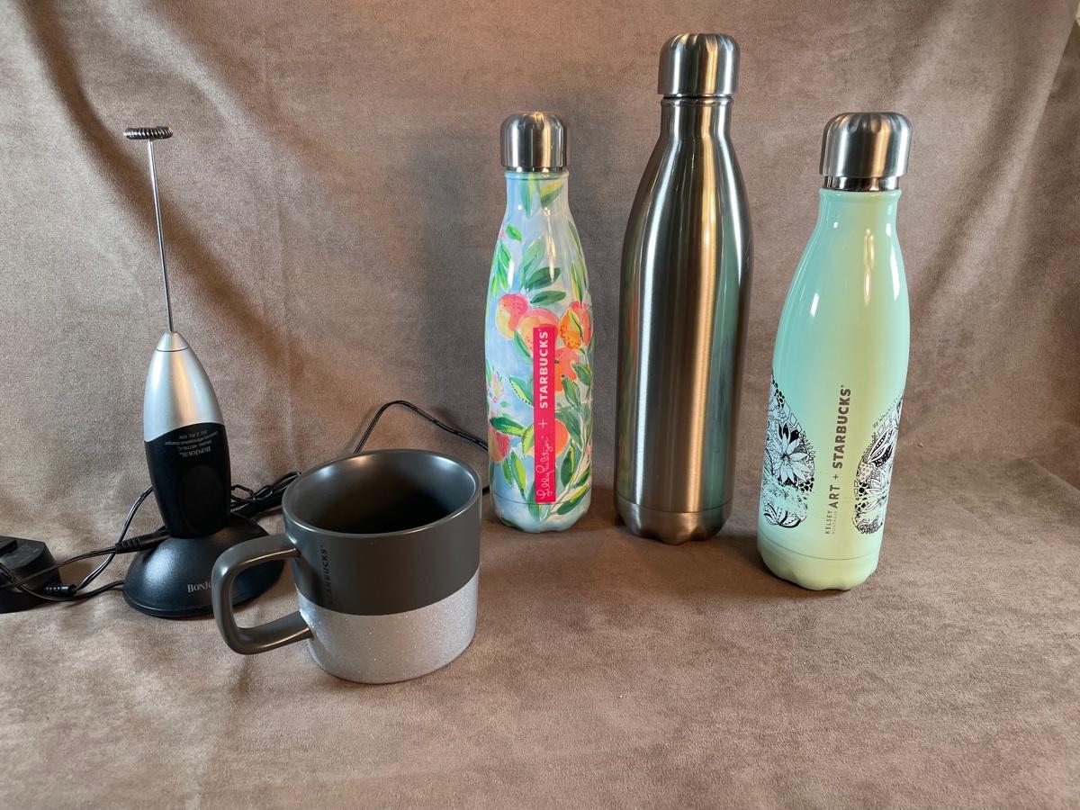 includes 3 Starbuck's branded Swell thermal drink bottles in two sizes, Starbucks coffee mug, BonJour brand electric beverage mixer