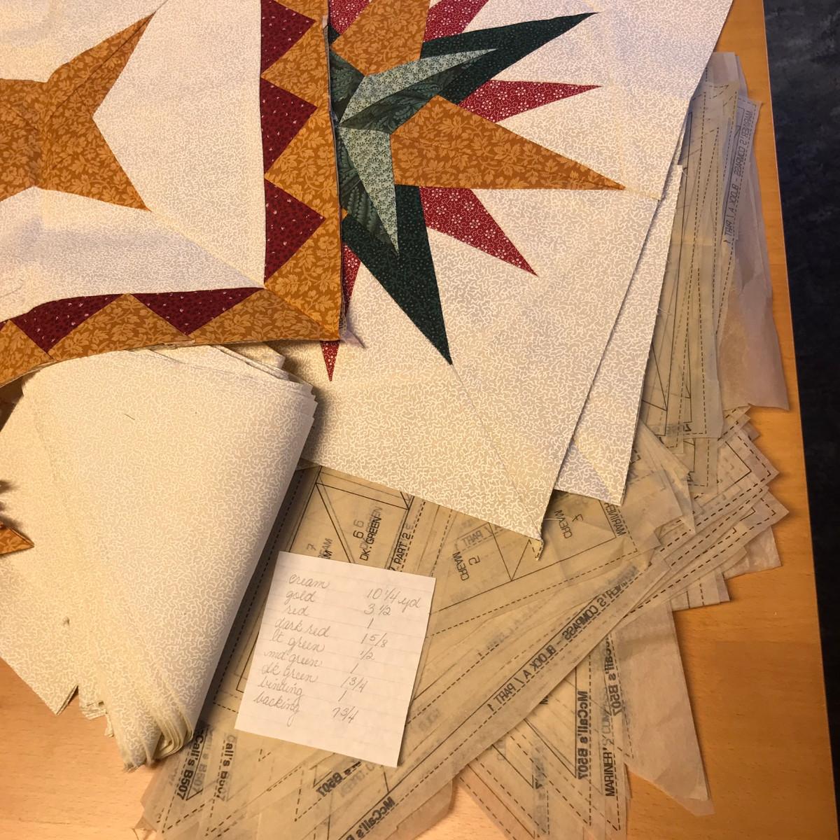 Mostly put together, but has some blocks to go. Sandra wanted me to say, while the material is clean & new; she is a smoker. So it may need washed before using. Patterns and pieces are nice and usable!