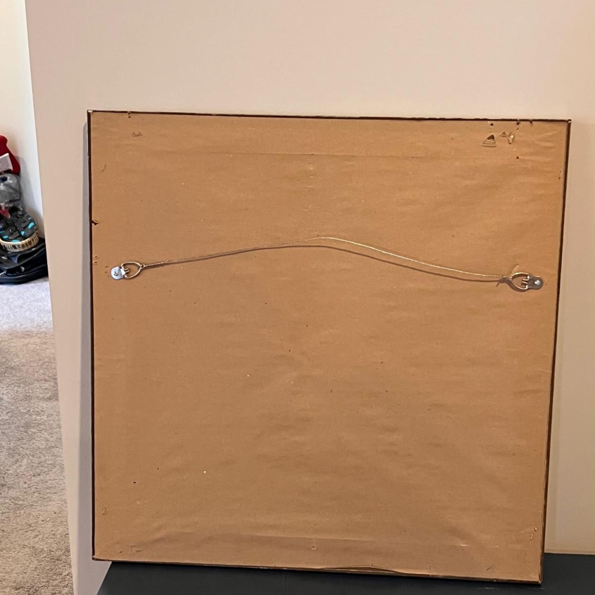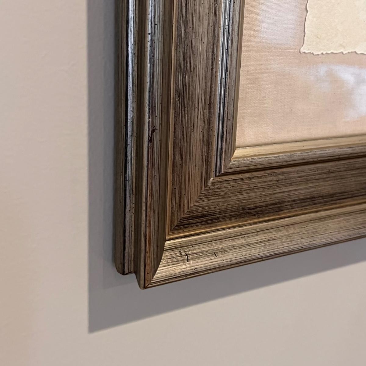 This attractive print is under glass and appears to be on thick paper that is attached to a tan cotton background matt. Quality metallic frame appears to be composite resin which measures 24” x 24”H.