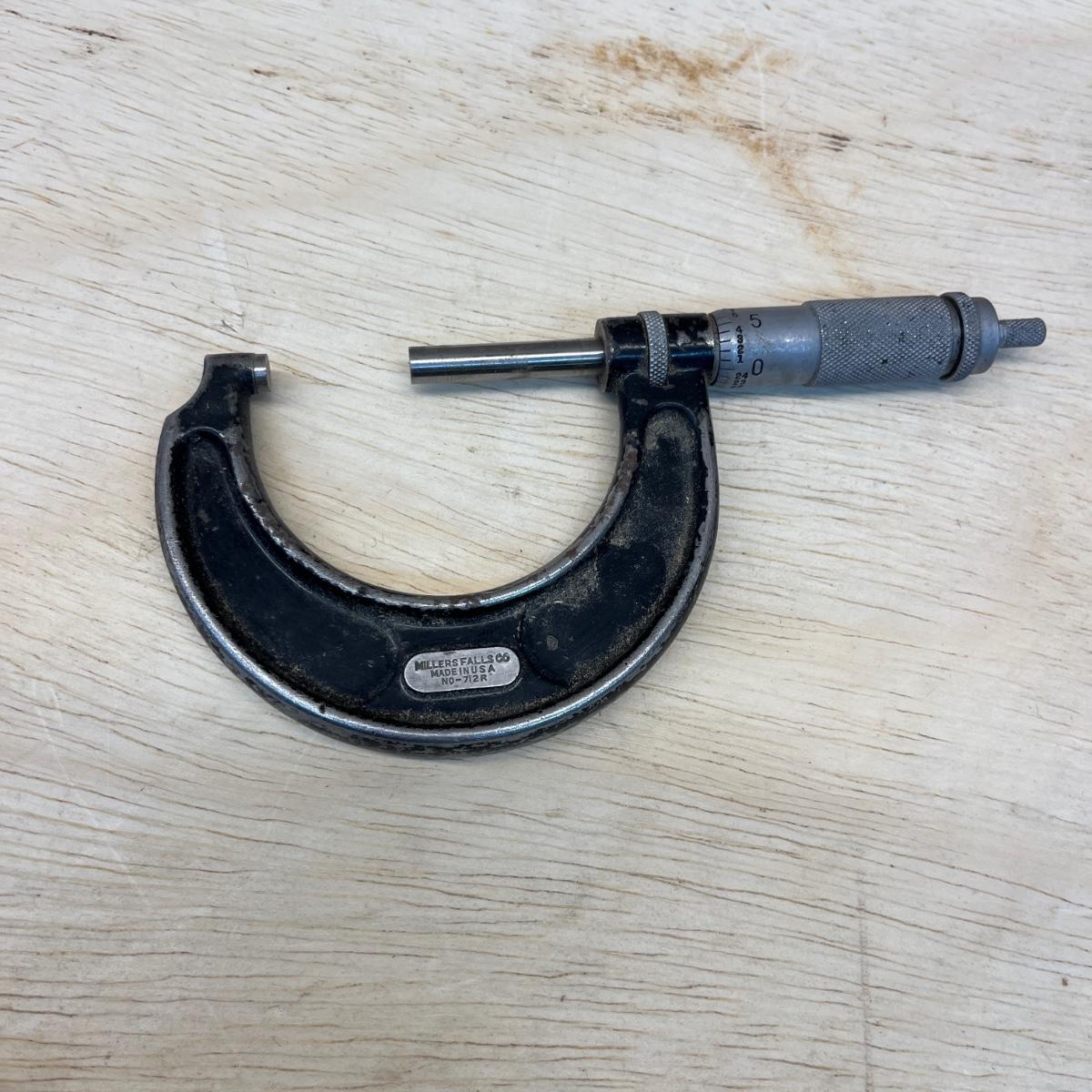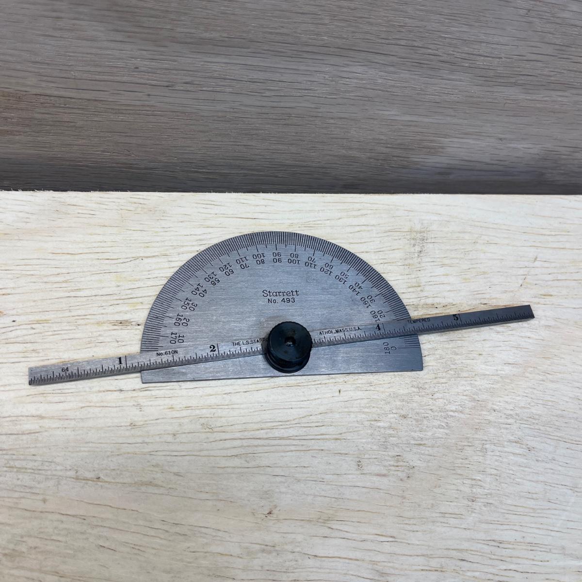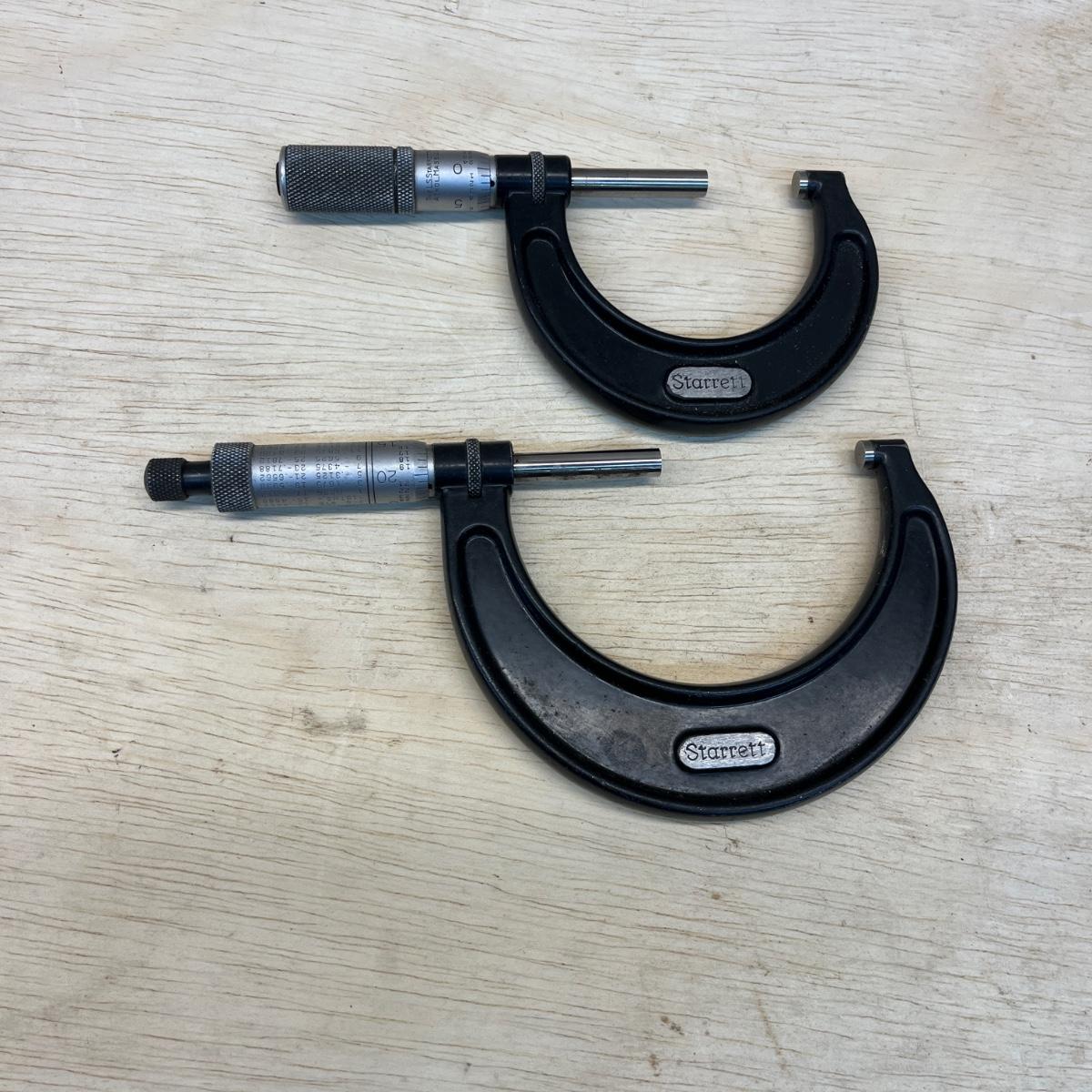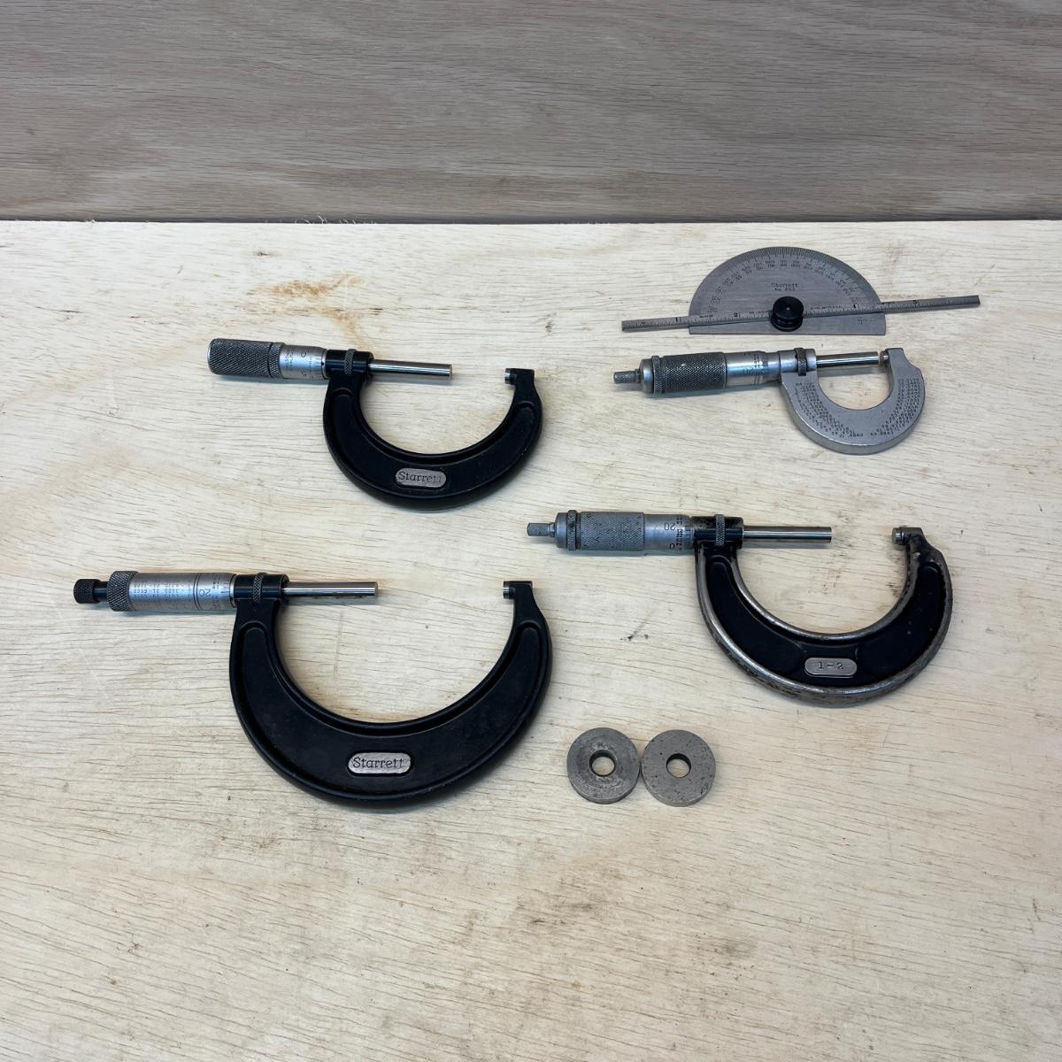 Lot includes two Starrett micrometers, two Millers Falls micrometers and a Starrett protractor. Largest micrometer measures 3.5” x .5” x 7” long.