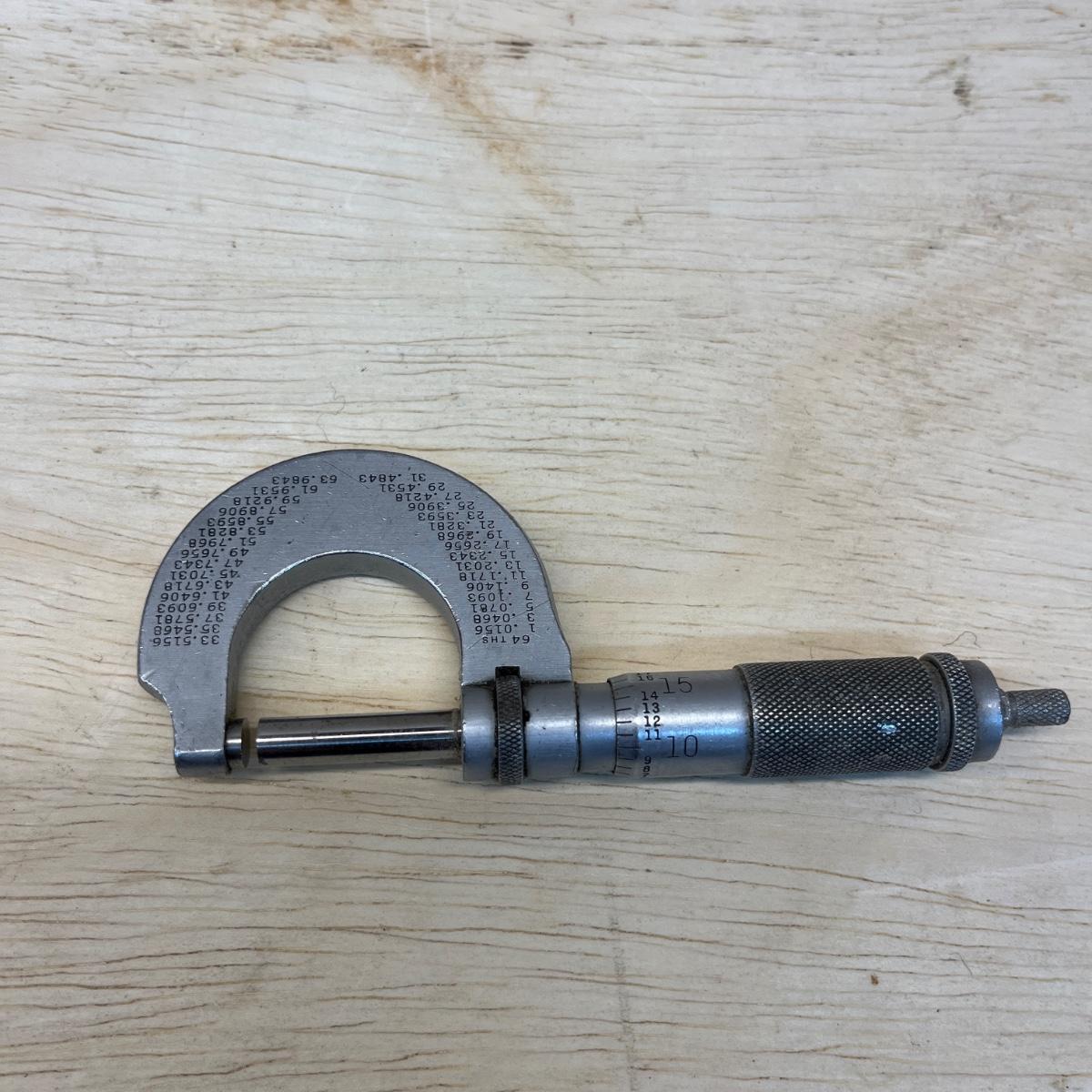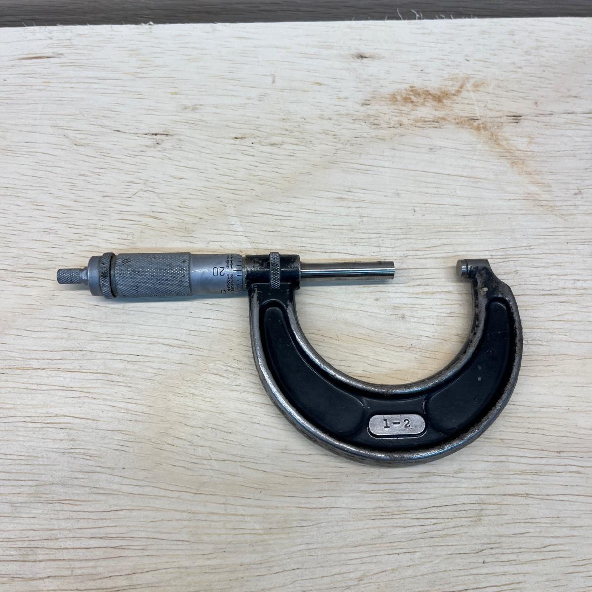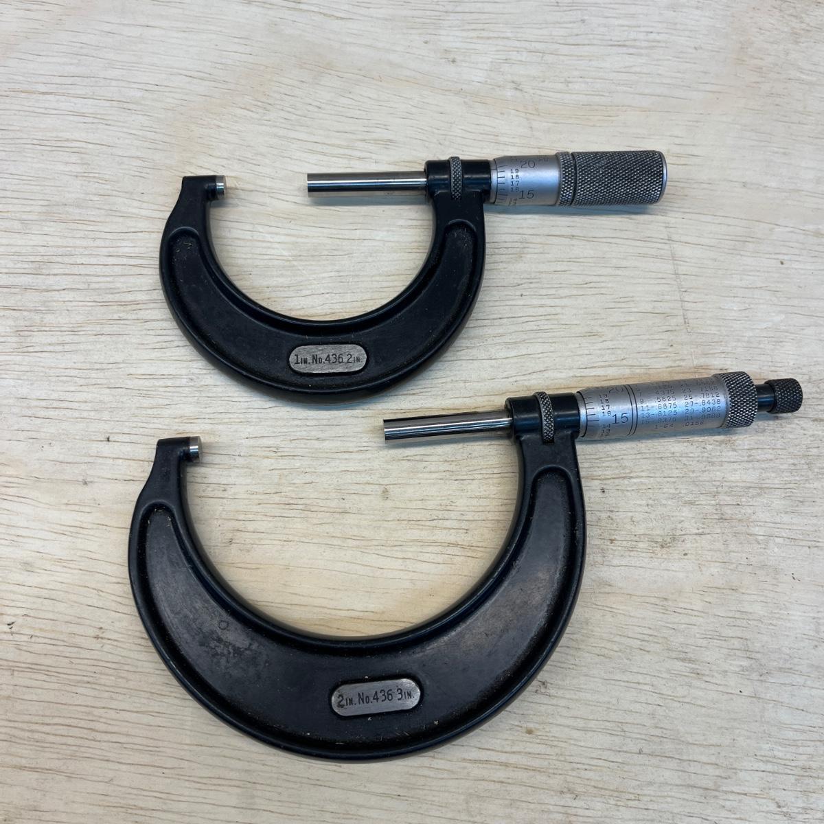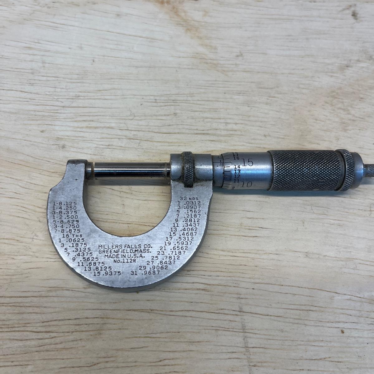 Lot includes two Starrett micrometers, two Millers Falls micrometers and a Starrett protractor. Largest micrometer measures 3.5” x .5” x 7” long.