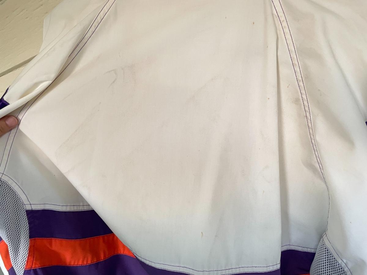 Some staining on the inside of the collar and marks on the back of the jacket (on the white). Otherwise in good condition, no rips or holes found.