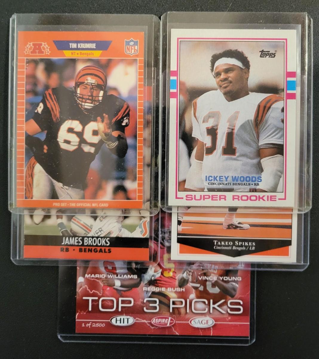 1989 Topps Ickey Woods, 1990 ProSet James Brooks, 1999 Upper Deck Takeo Spikes
