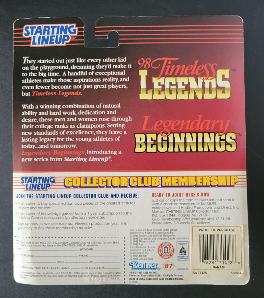 1997 Kenner Starting Lineup Legendary Beginnings Joe Montana, Joe Namath