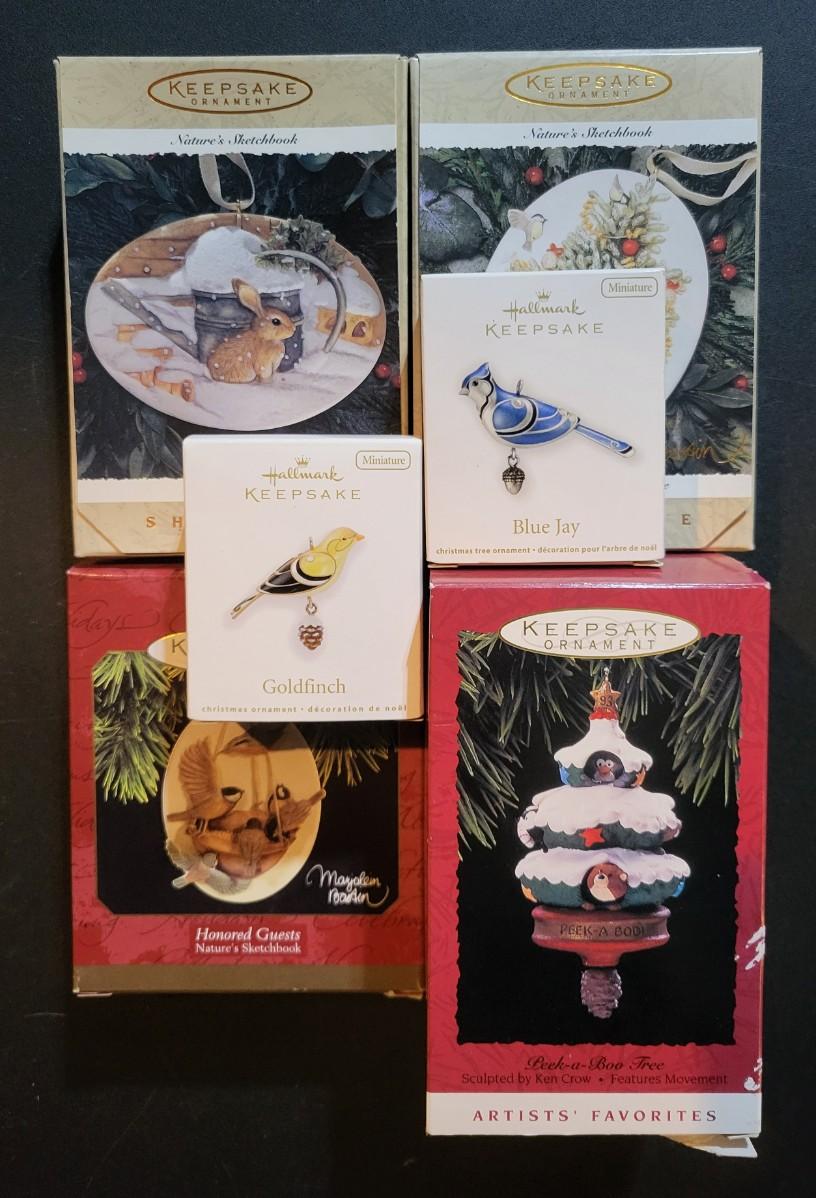 1993-2012 Hallmark Ornaments Designed by Bastin, Kegrize Minitures (peek-a-boo tree has tear in box as pictured)