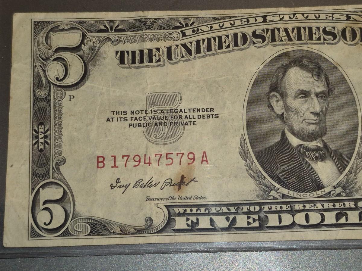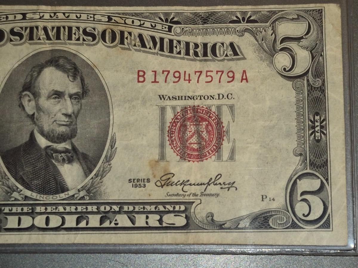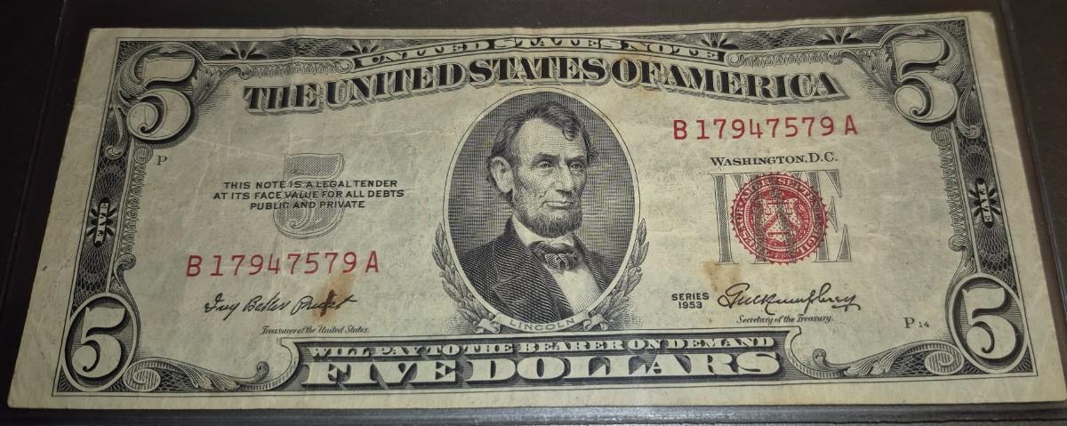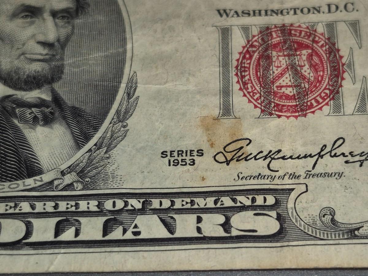 1953 Red Seal $5 Bill. This is the last year that there was no motto on the back.