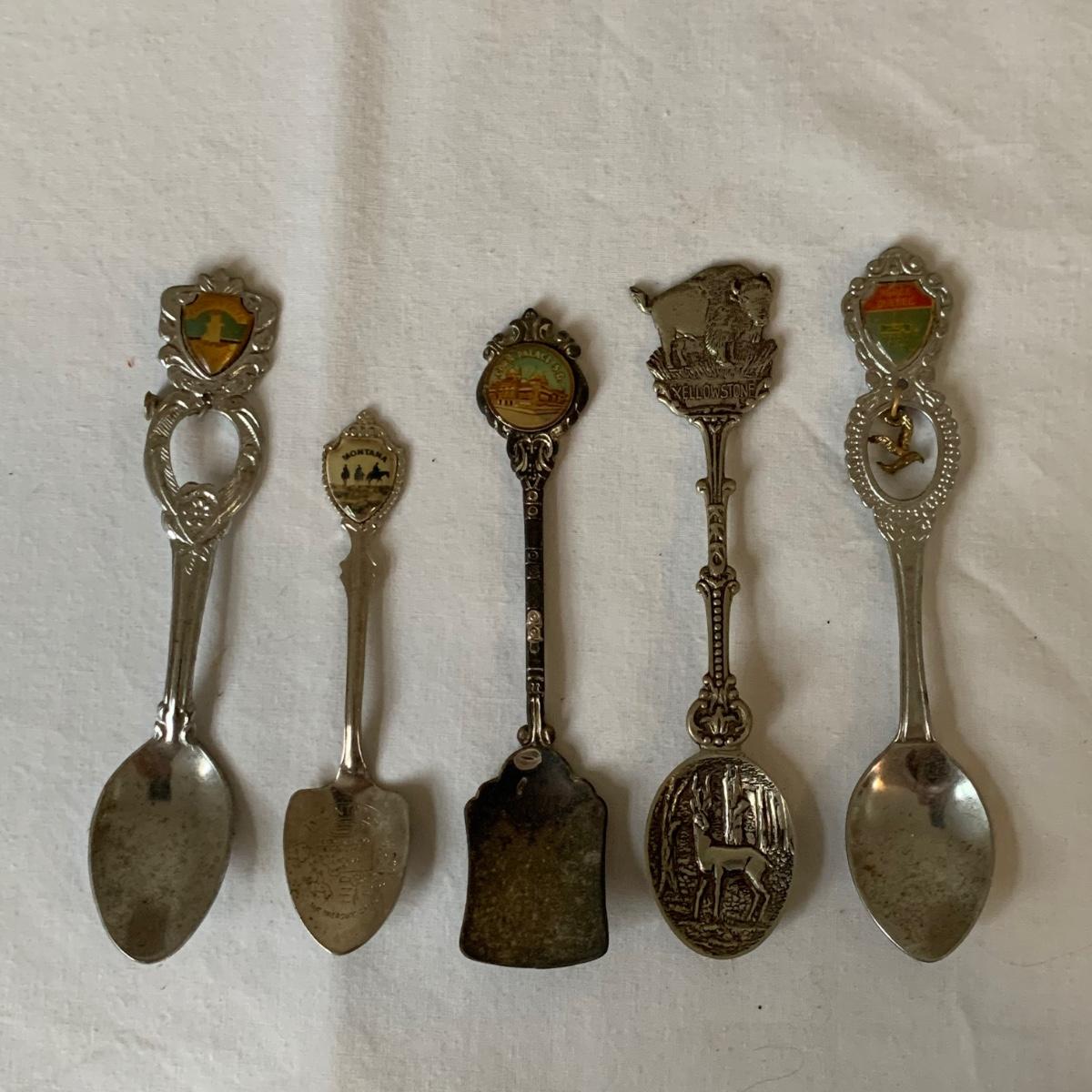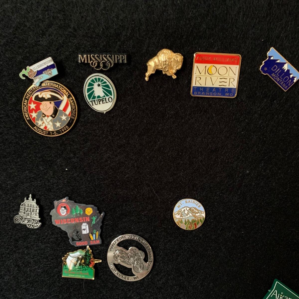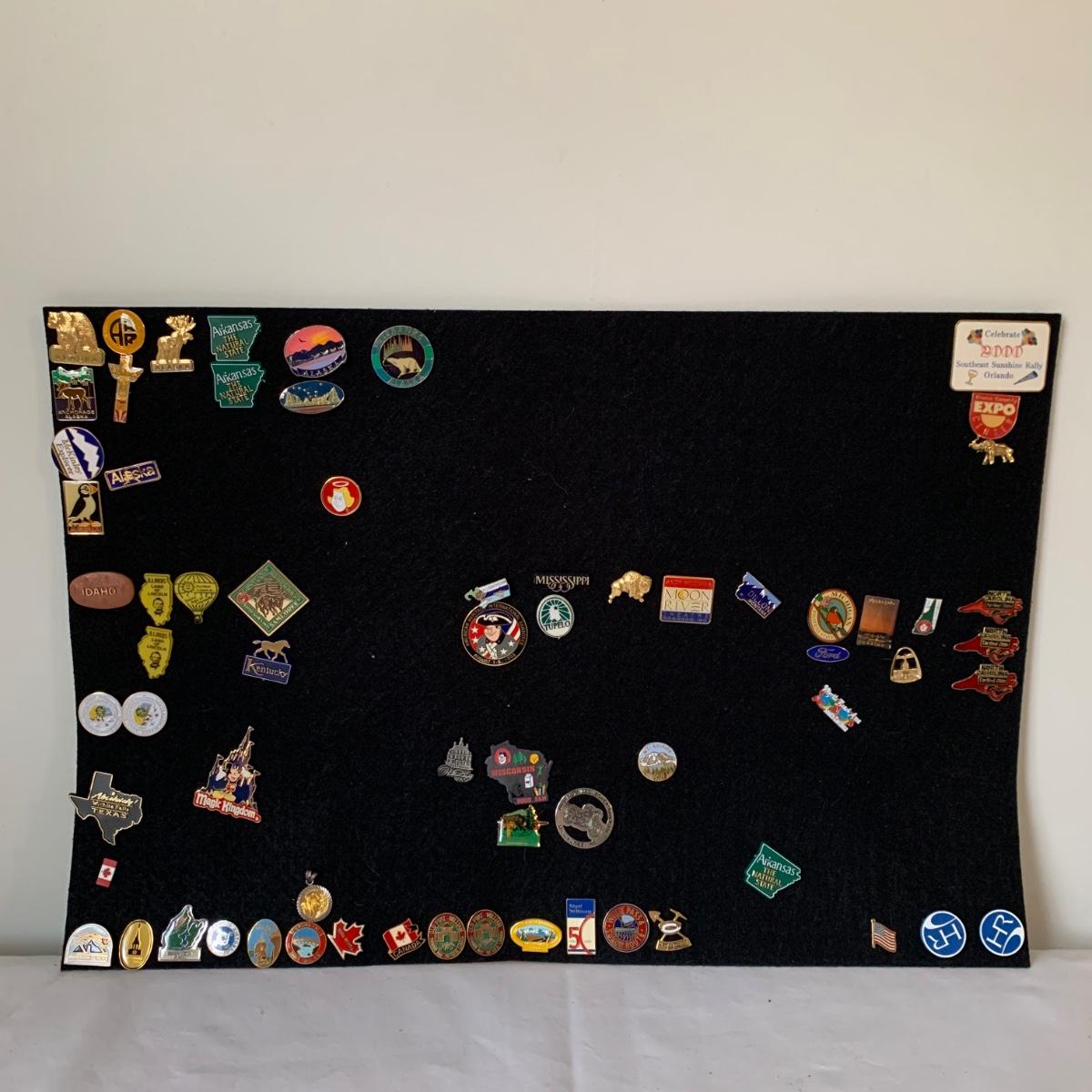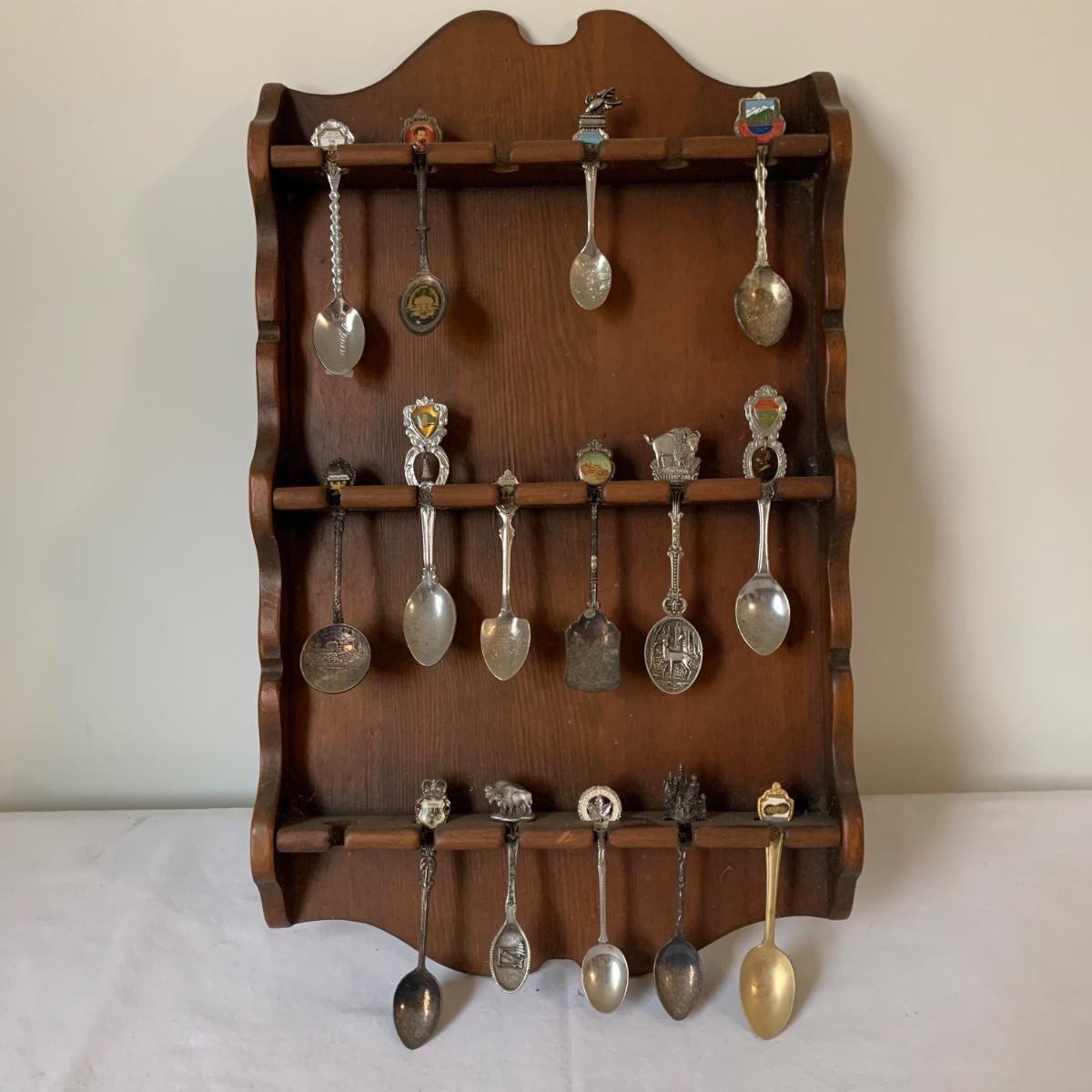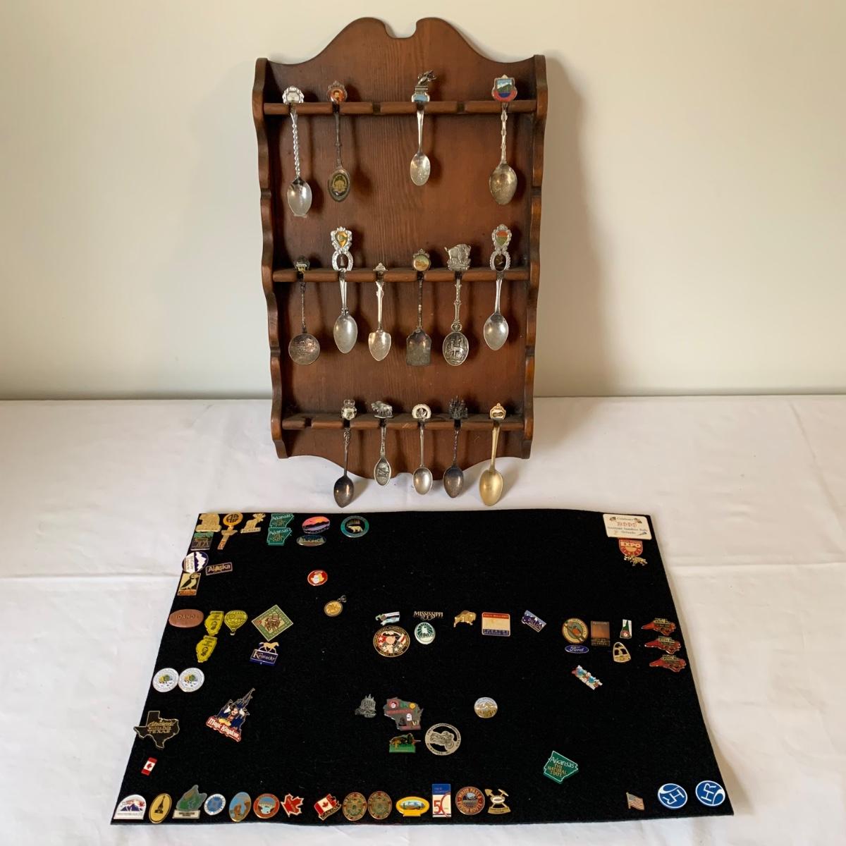 A collection of 60+ pins from different states and Canada. They are all pinned in to a piece of black felt-board. Most are metal and a few are plastic. The largest pin is “Celebrate 2000 Southeast Sunshine Rally Orlando” and it measures 1.75” x 1.25”. The spoon collection features spoons from North America and Europe. The wooden rack measures about 10.5” x 18” and can hold up to 18 spoons. There are 15 spoons in the collection.