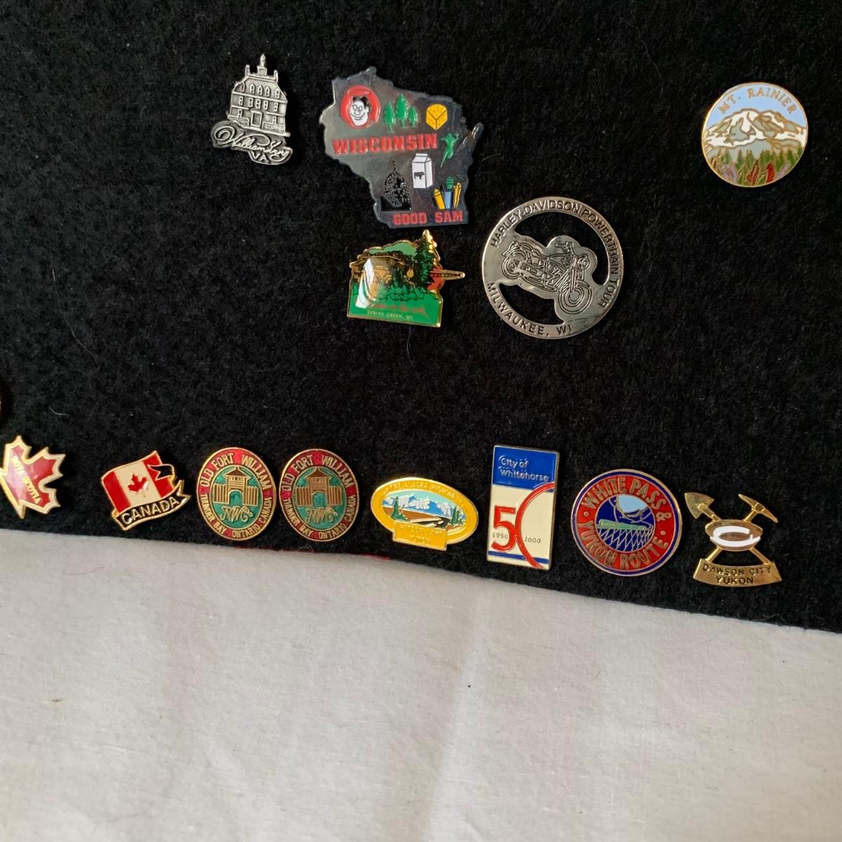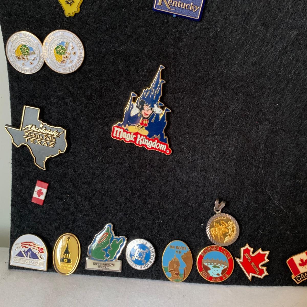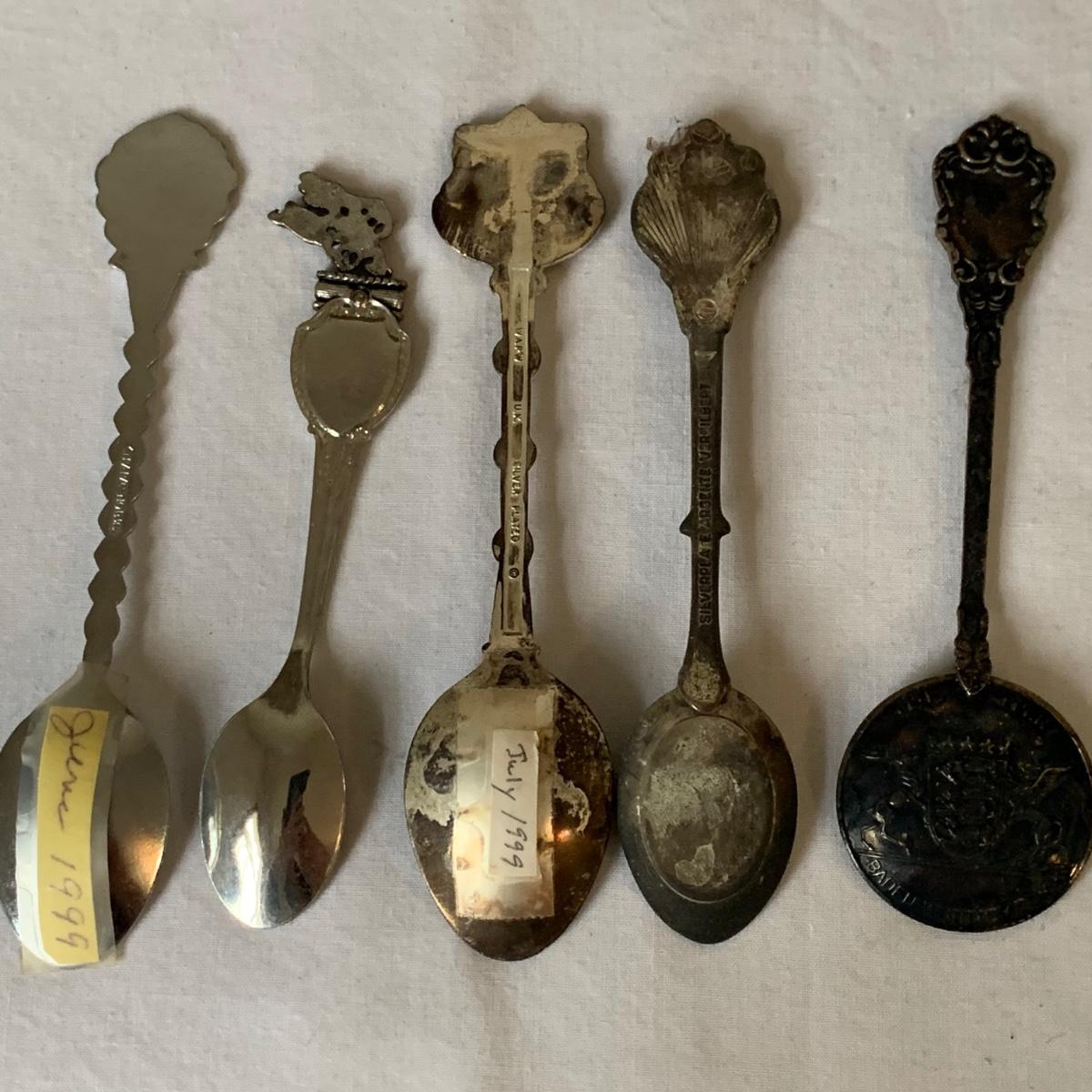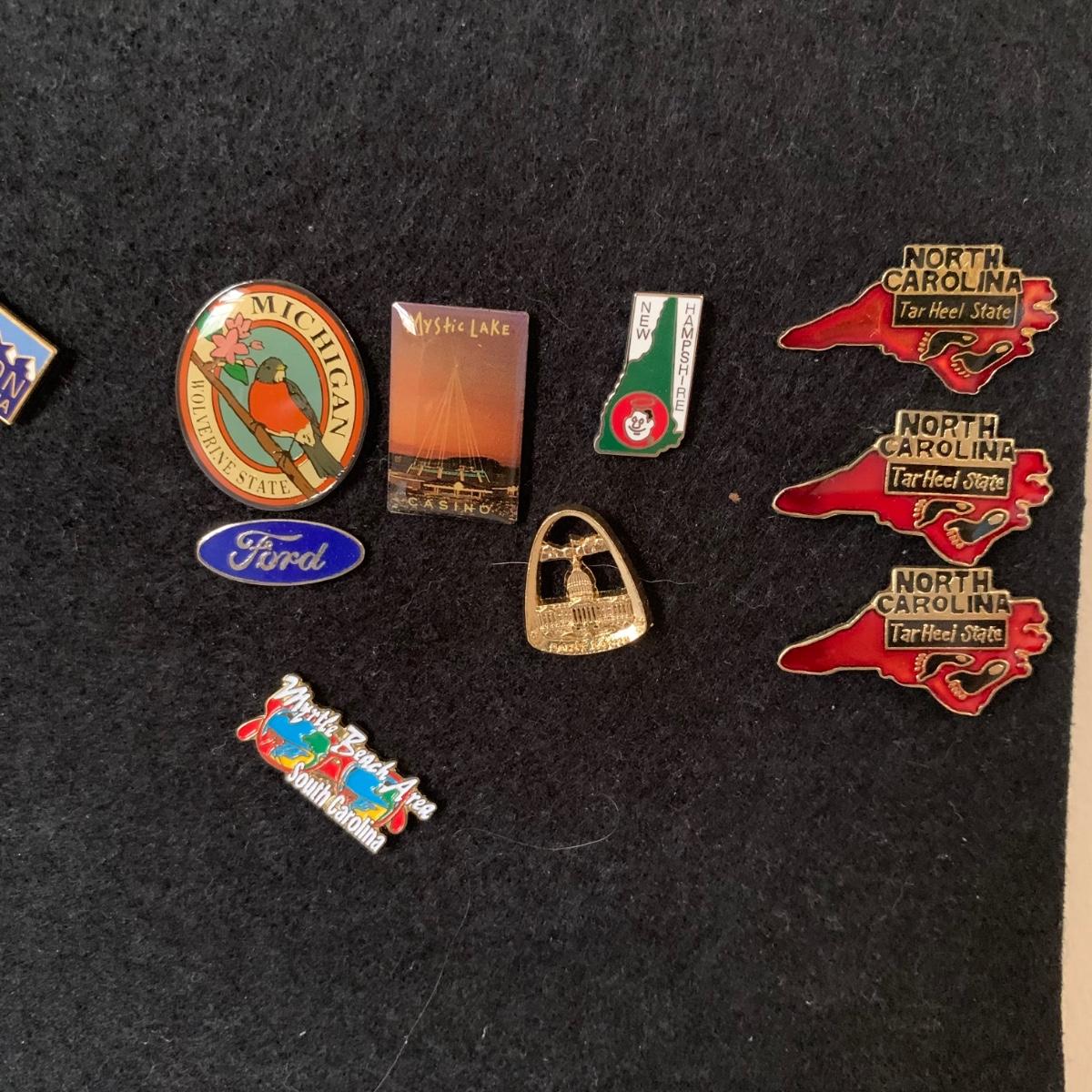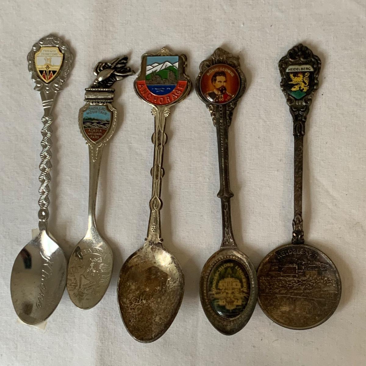 A collection of 60+ pins from different states and Canada. They are all pinned in to a piece of black felt-board. Most are metal and a few are plastic. The largest pin is “Celebrate 2000 Southeast Sunshine Rally Orlando” and it measures 1.75” x 1.25”. The spoon collection features spoons from North America and Europe. The wooden rack measures about 10.5” x 18” and can hold up to 18 spoons. There are 15 spoons in the collection.