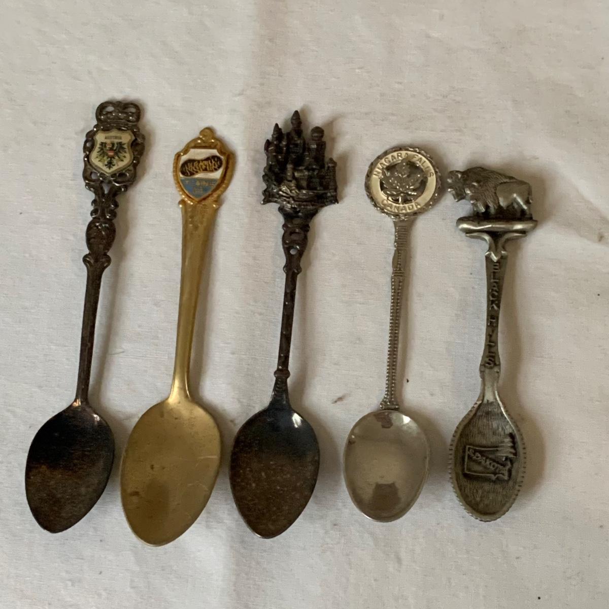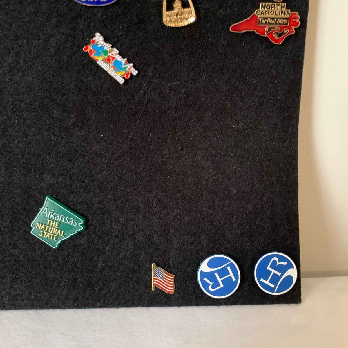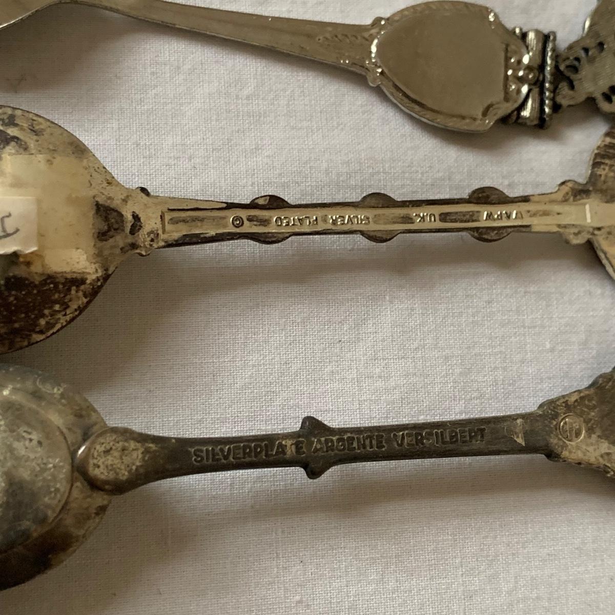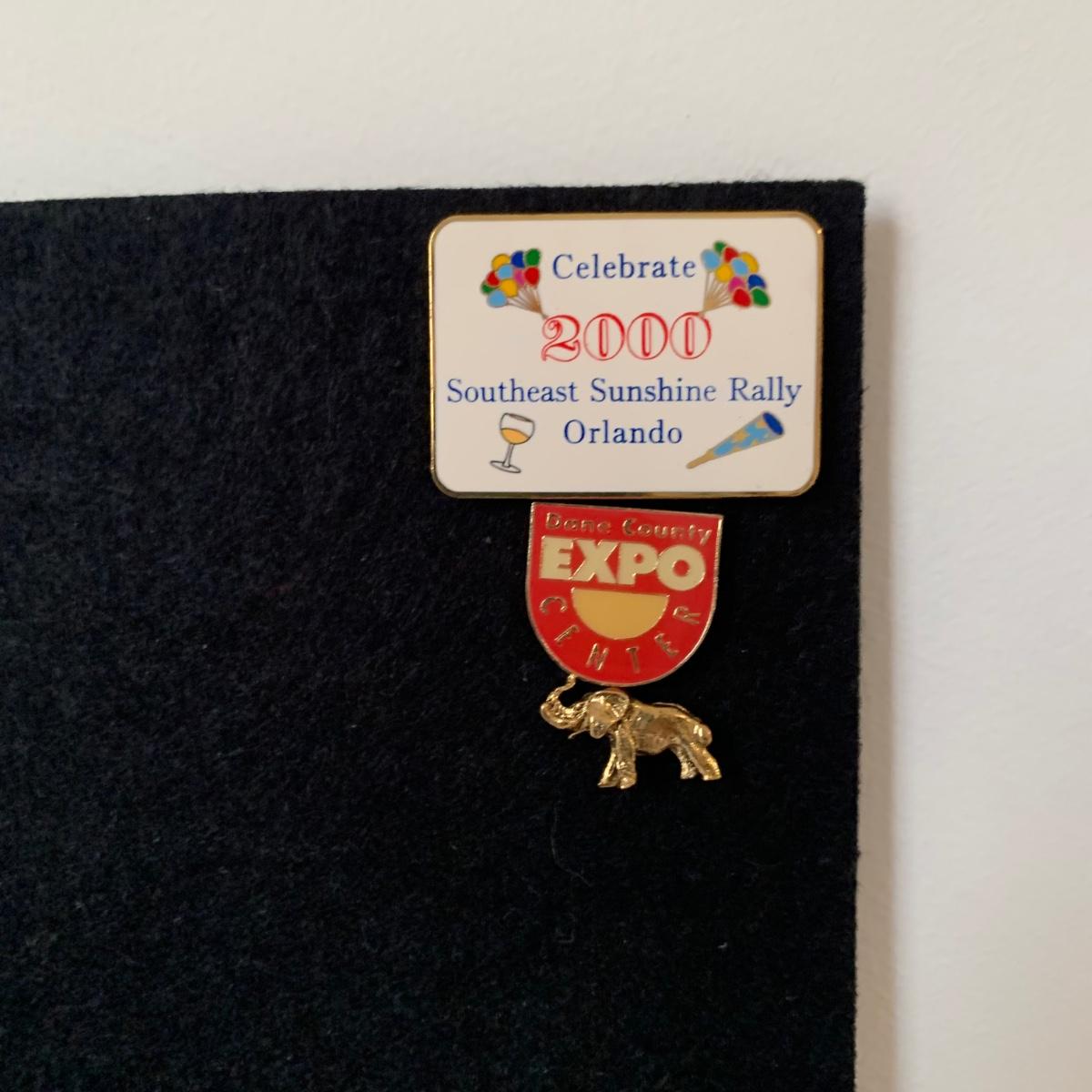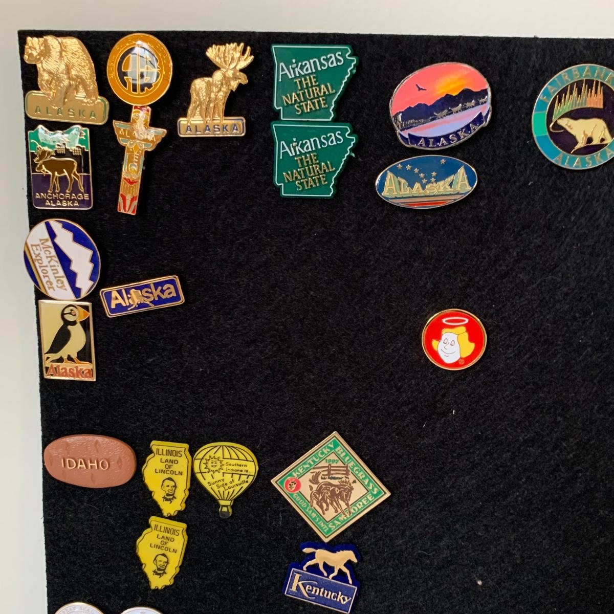 A collection of 60+ pins from different states and Canada. They are all pinned in to a piece of black felt-board. Most are metal and a few are plastic. The largest pin is “Celebrate 2000 Southeast Sunshine Rally Orlando” and it measures 1.75” x 1.25”. The spoon collection features spoons from North America and Europe. The wooden rack measures about 10.5” x 18” and can hold up to 18 spoons. There are 15 spoons in the collection.
