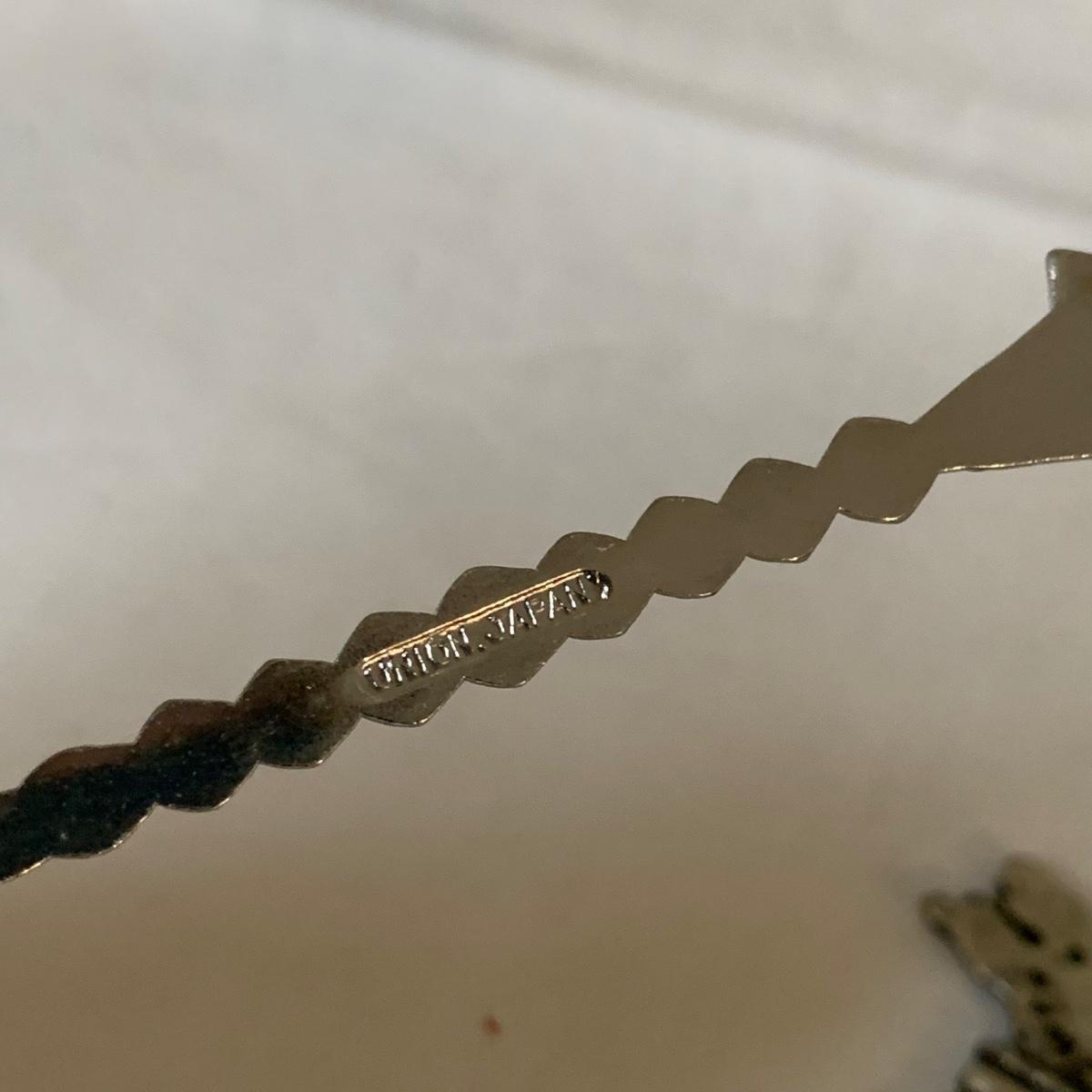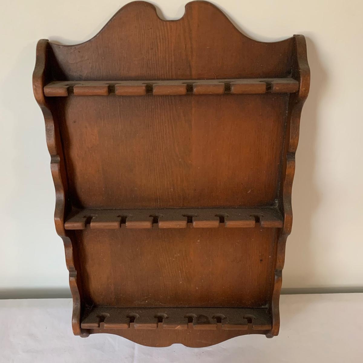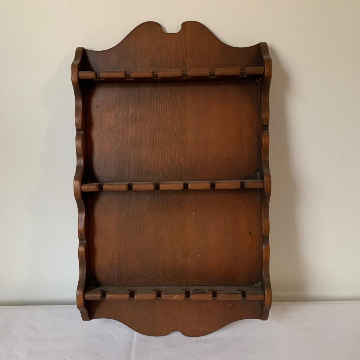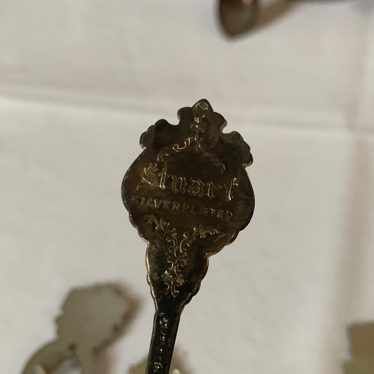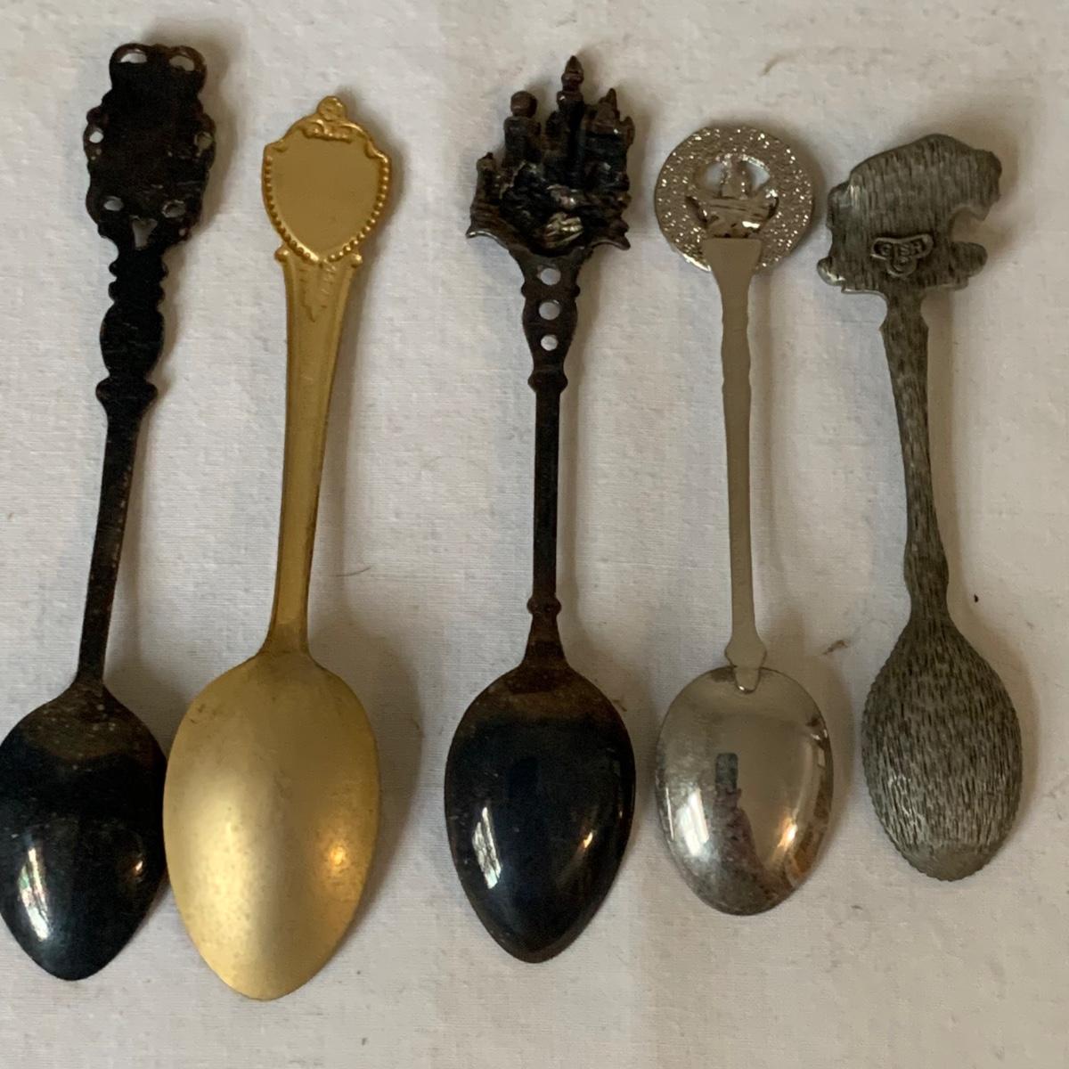 A collection of 60+ pins from different states and Canada. They are all pinned in to a piece of black felt-board. Most are metal and a few are plastic. The largest pin is “Celebrate 2000 Southeast Sunshine Rally Orlando” and it measures 1.75” x 1.25”. The spoon collection features spoons from North America and Europe. The wooden rack measures about 10.5” x 18” and can hold up to 18 spoons. There are 15 spoons in the collection.