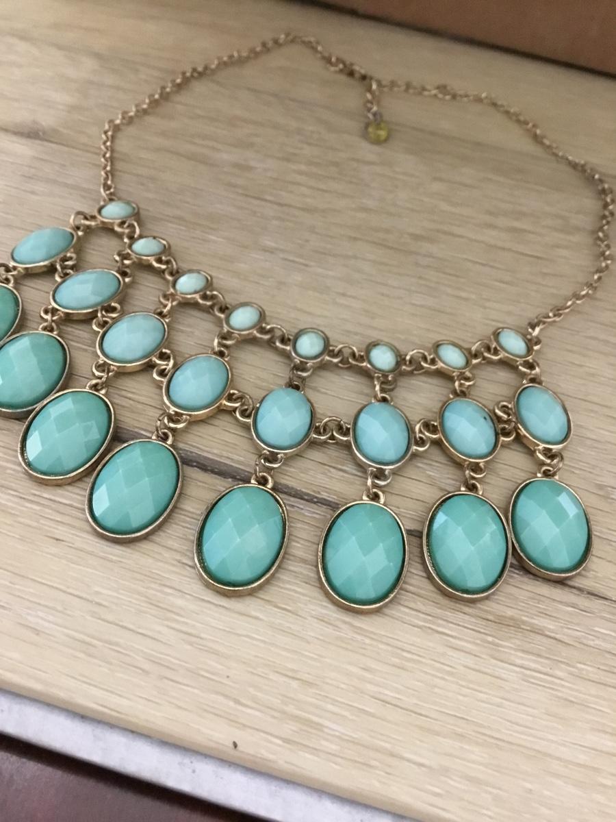Statement Bib Necklace. Faceted Green Plastic Cabochon & Gold Tone Bib Necklace