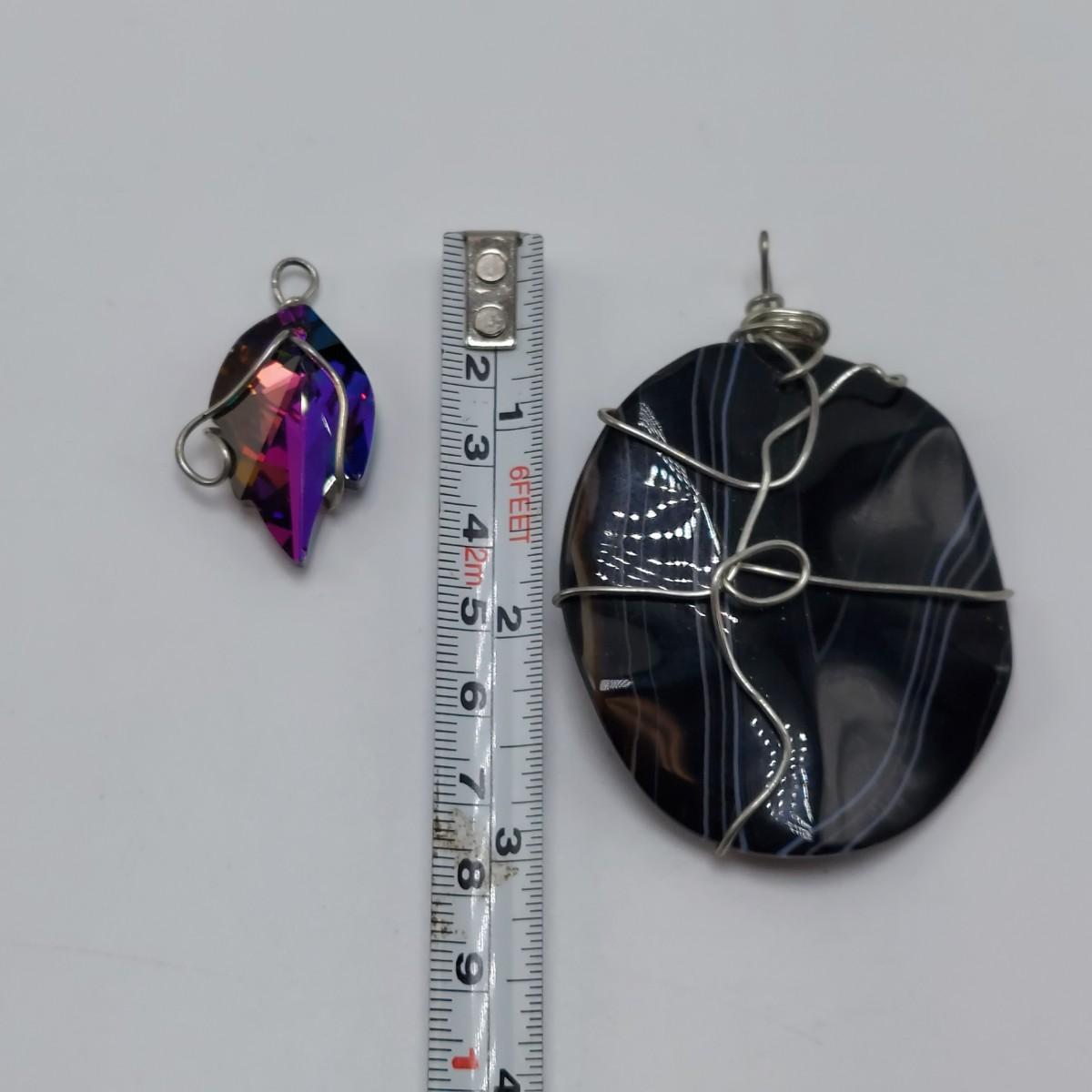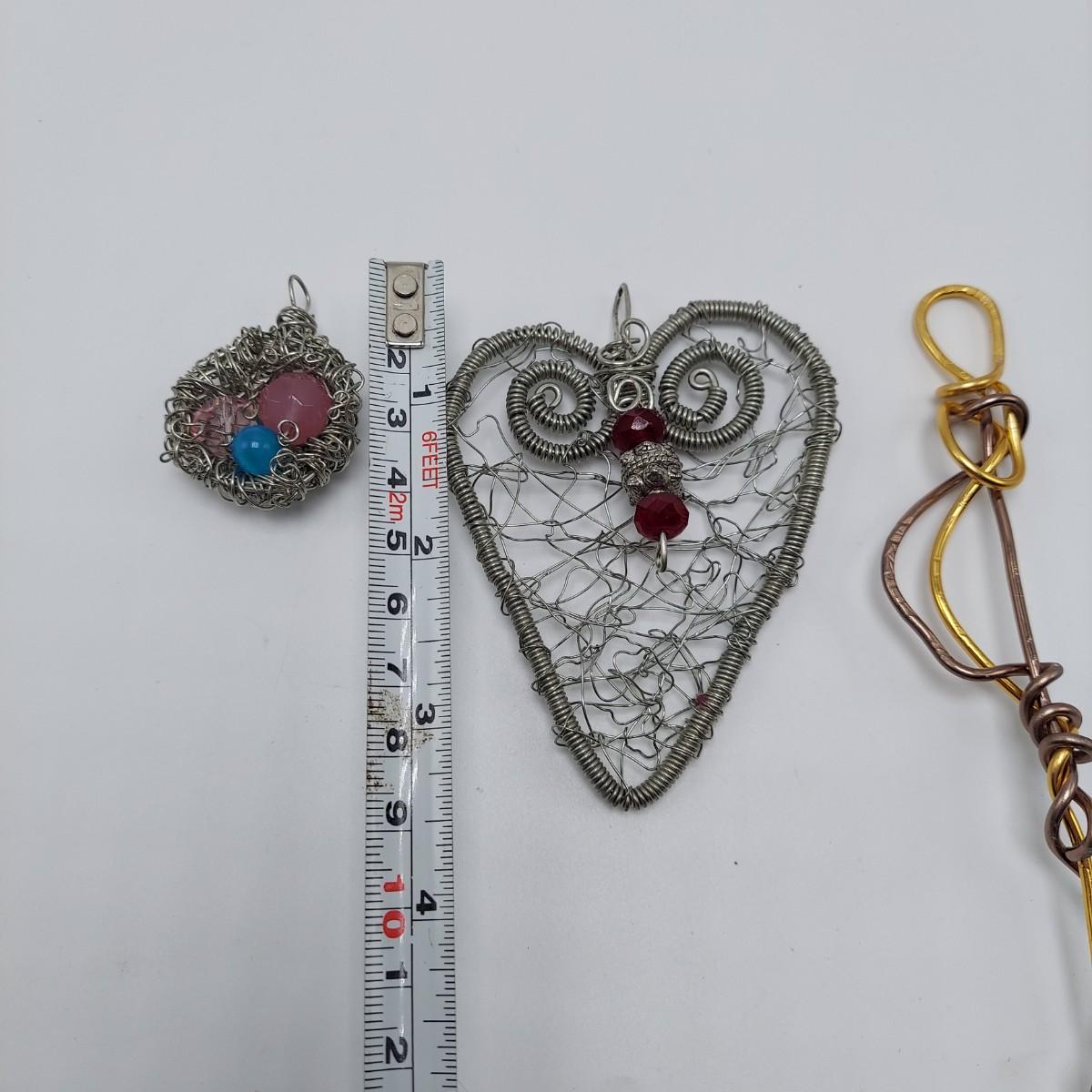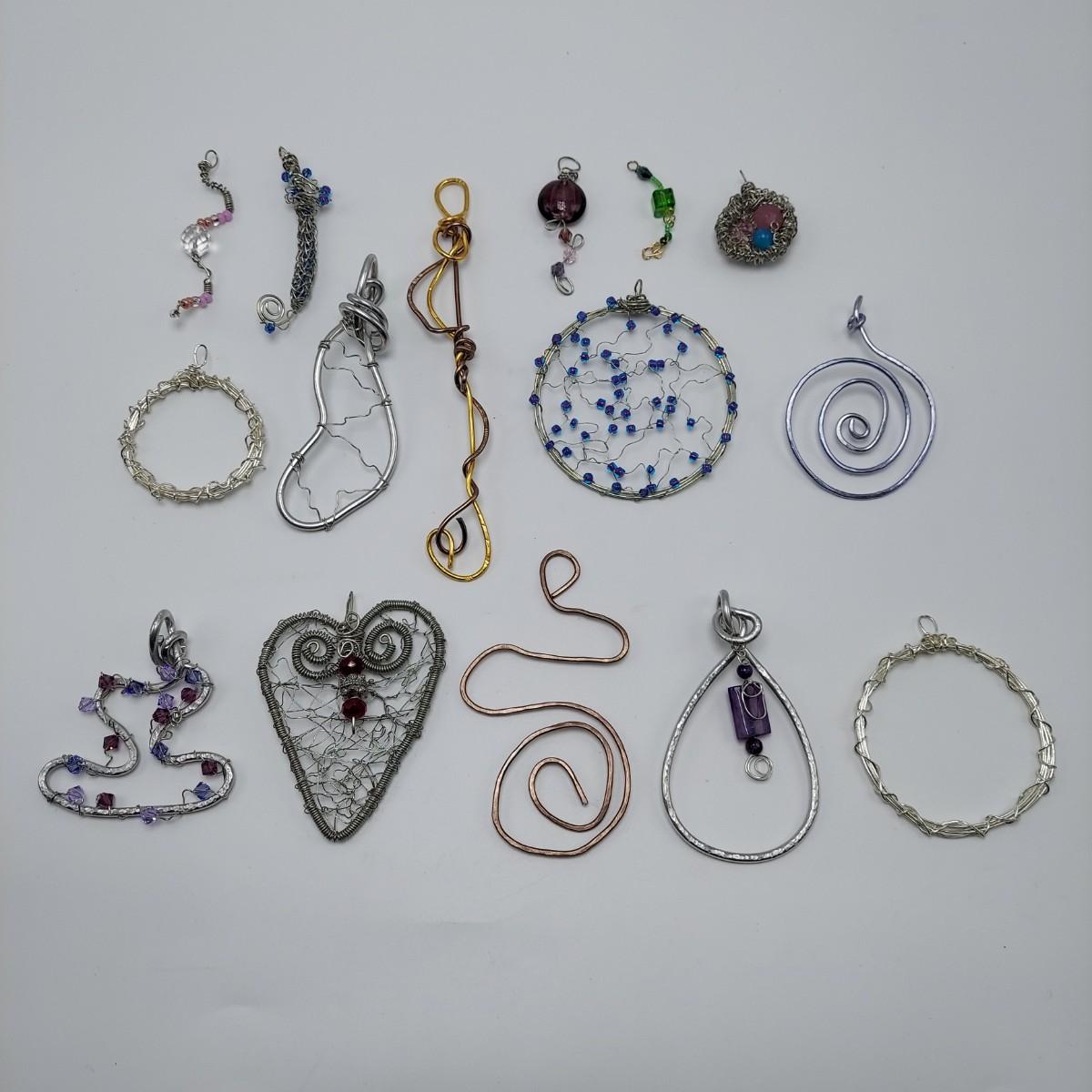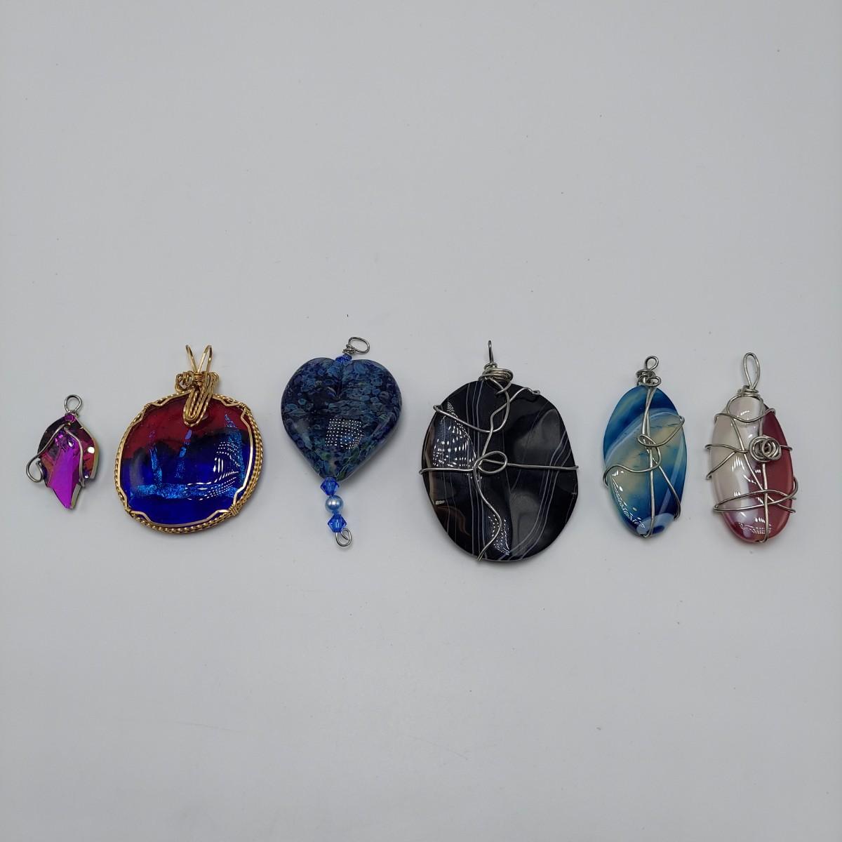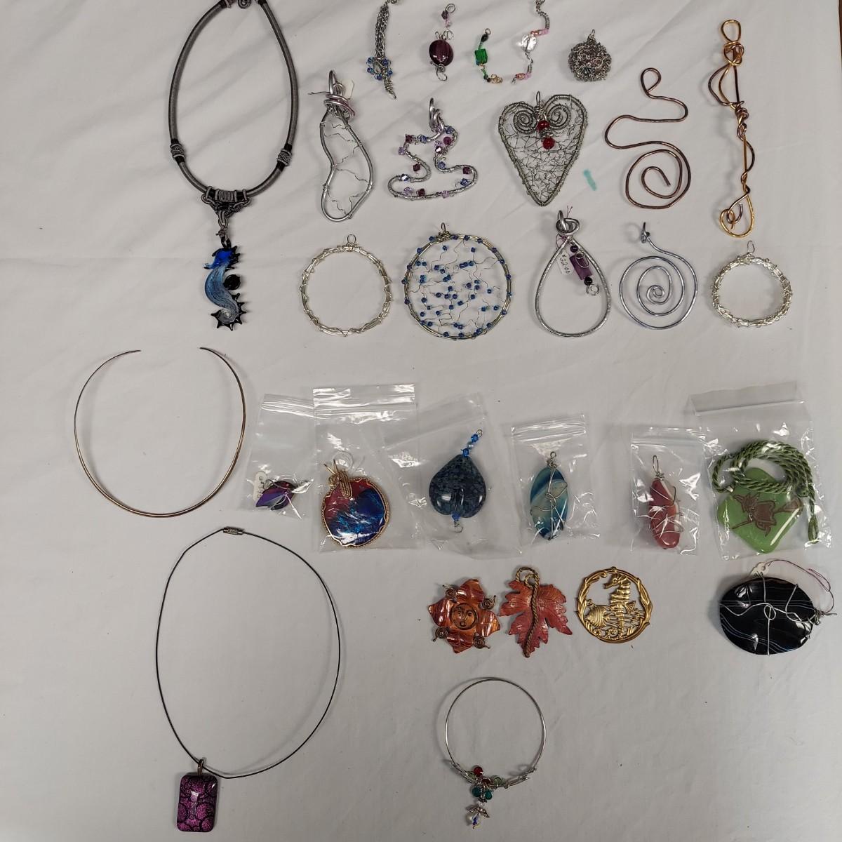 Lot includes one bangle bracelet, four necklaces and 20+ interchangeable wire wrapped pendants. The metal choker and the black wire necklace are easily used with most pendants shown. The green witch necklace is on an 18” long cord. Pendants range from 1.5-7” long. Please see photos for details. Shipping available. All sales are final. No returns or refunds. Please bid accordingly.