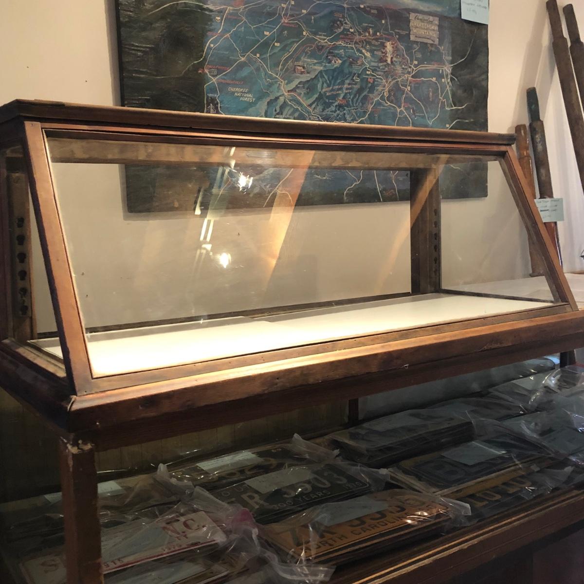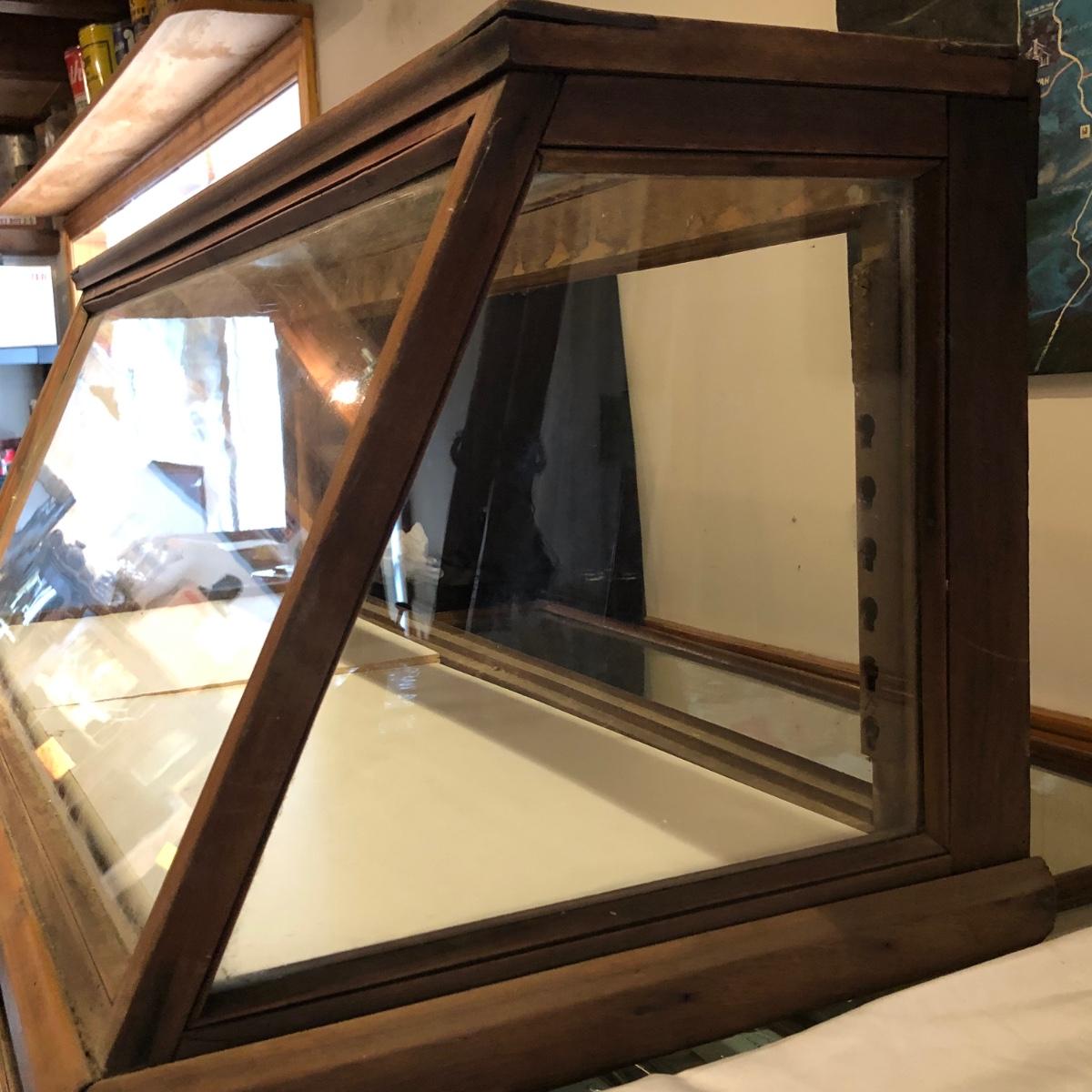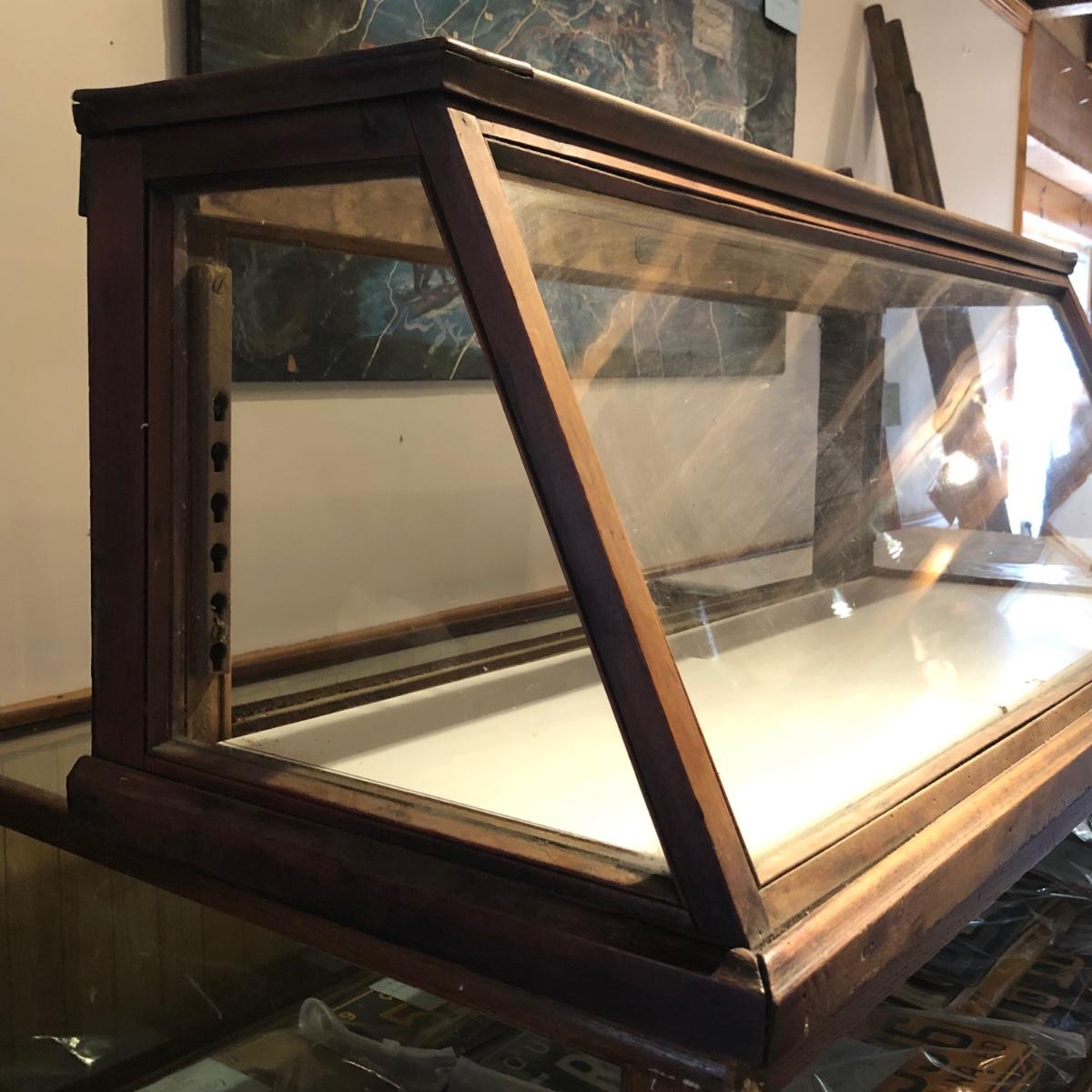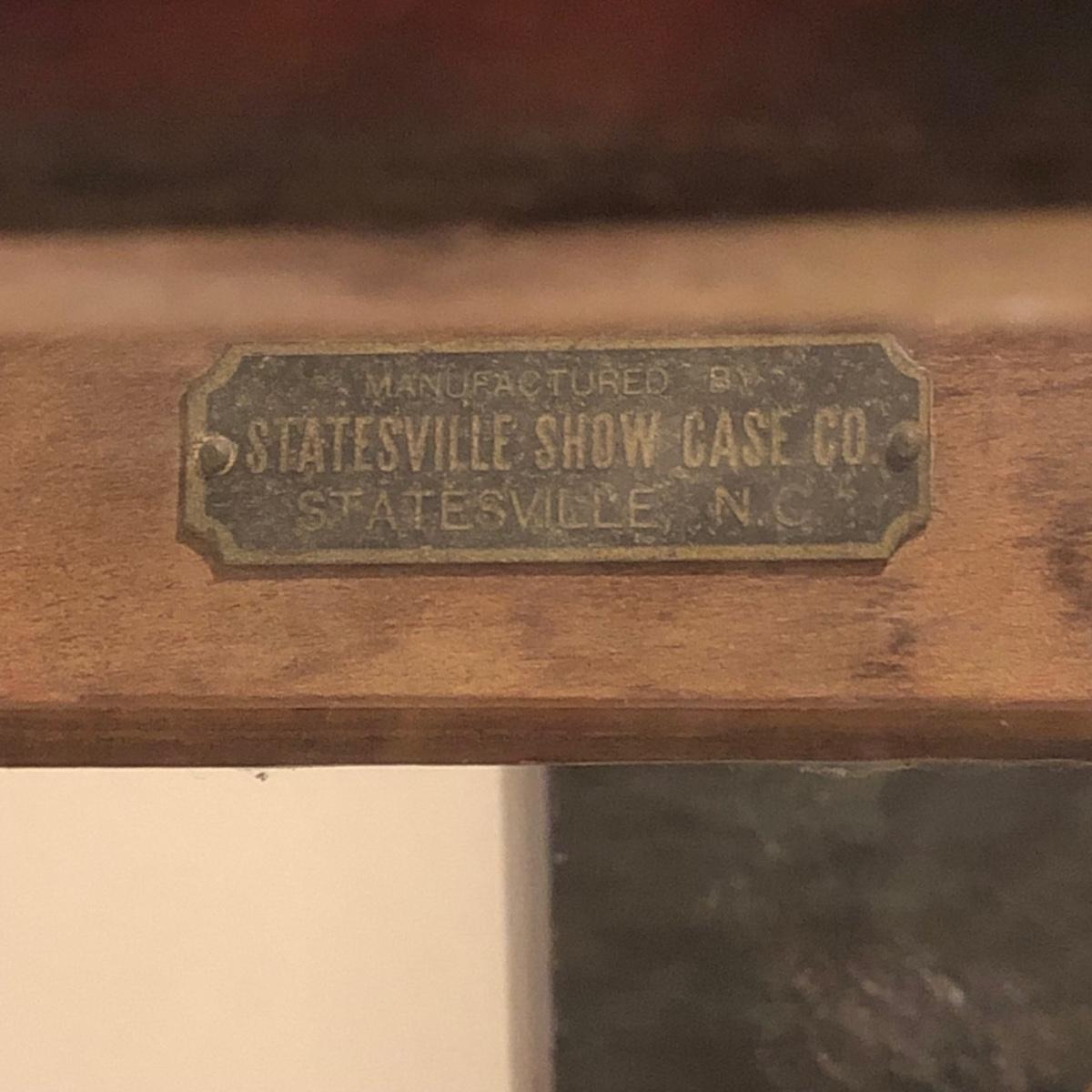 Triangular shaped display case measures 37” x 15.5” x 14”. The bottom of the vase is wider than the top. The front, sides and top all have glass. The back is open. The inside of the vase has two MDF white pieces of boards for the bottom as the bottom is framed out yet has no original flooring. The metal tag on the top back reads, “Statesville Show Case Co.” Local pick up only. In the photos, this display case is sitting on top of another on with items inside.