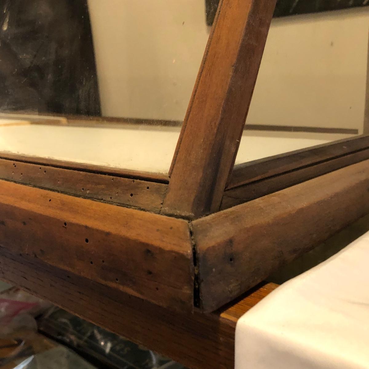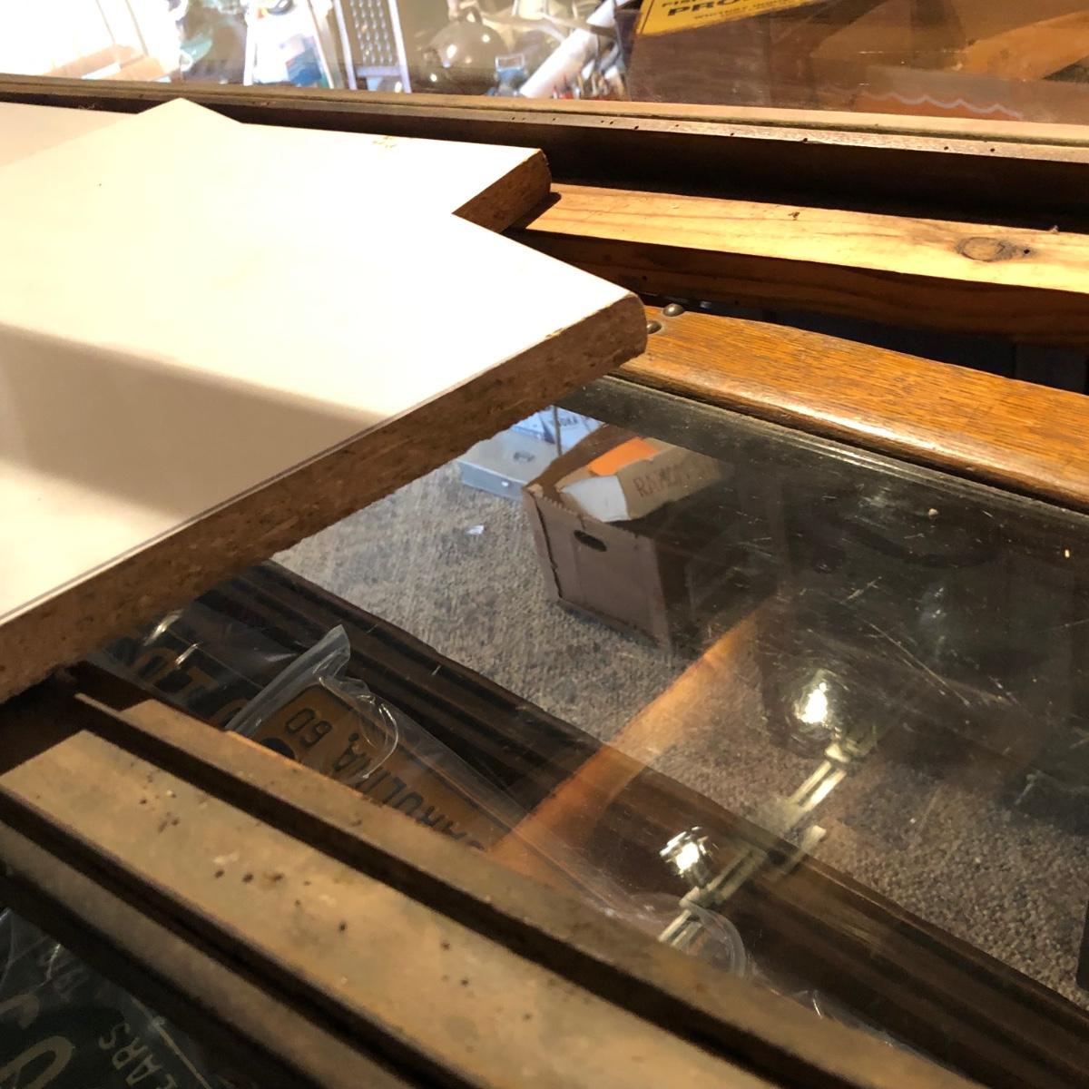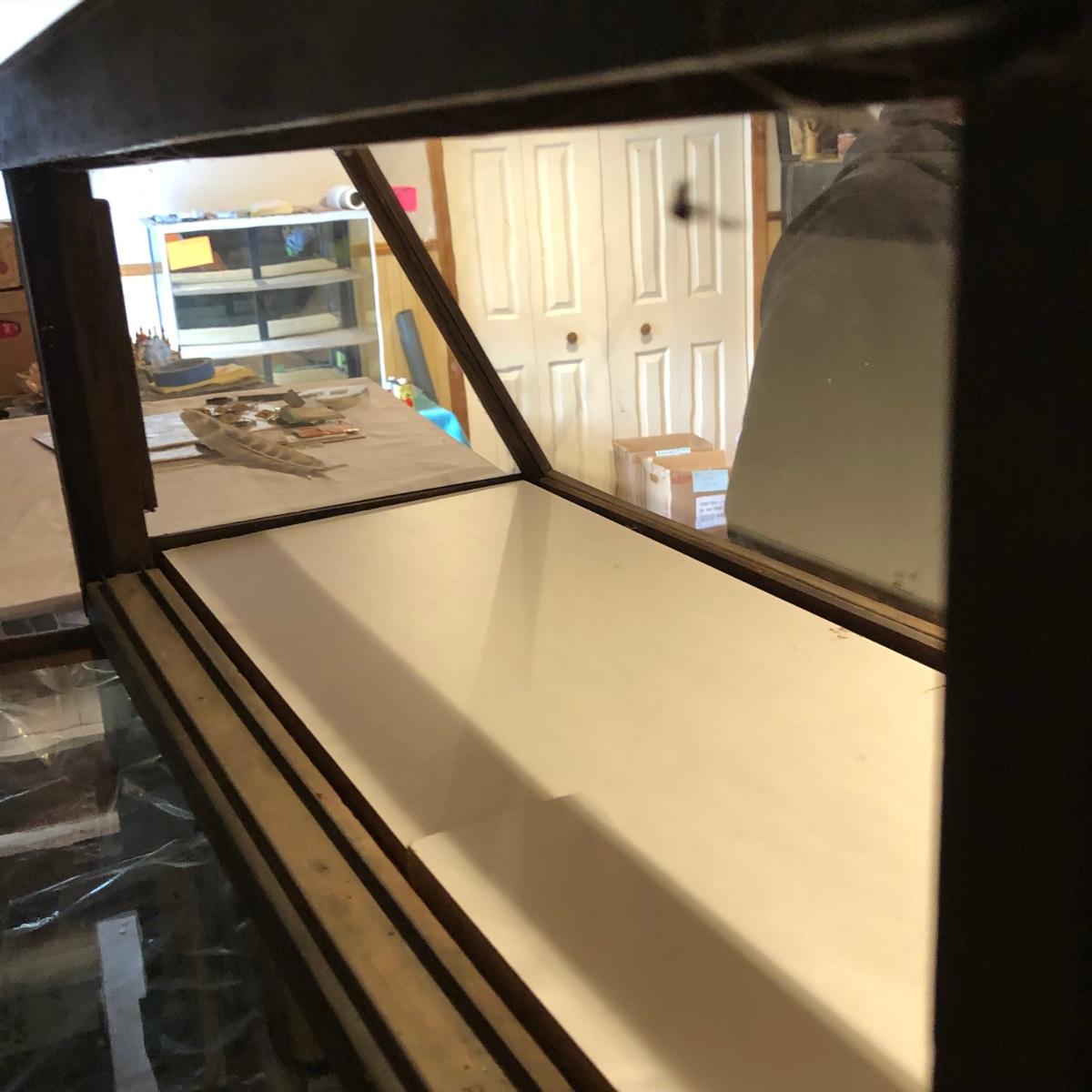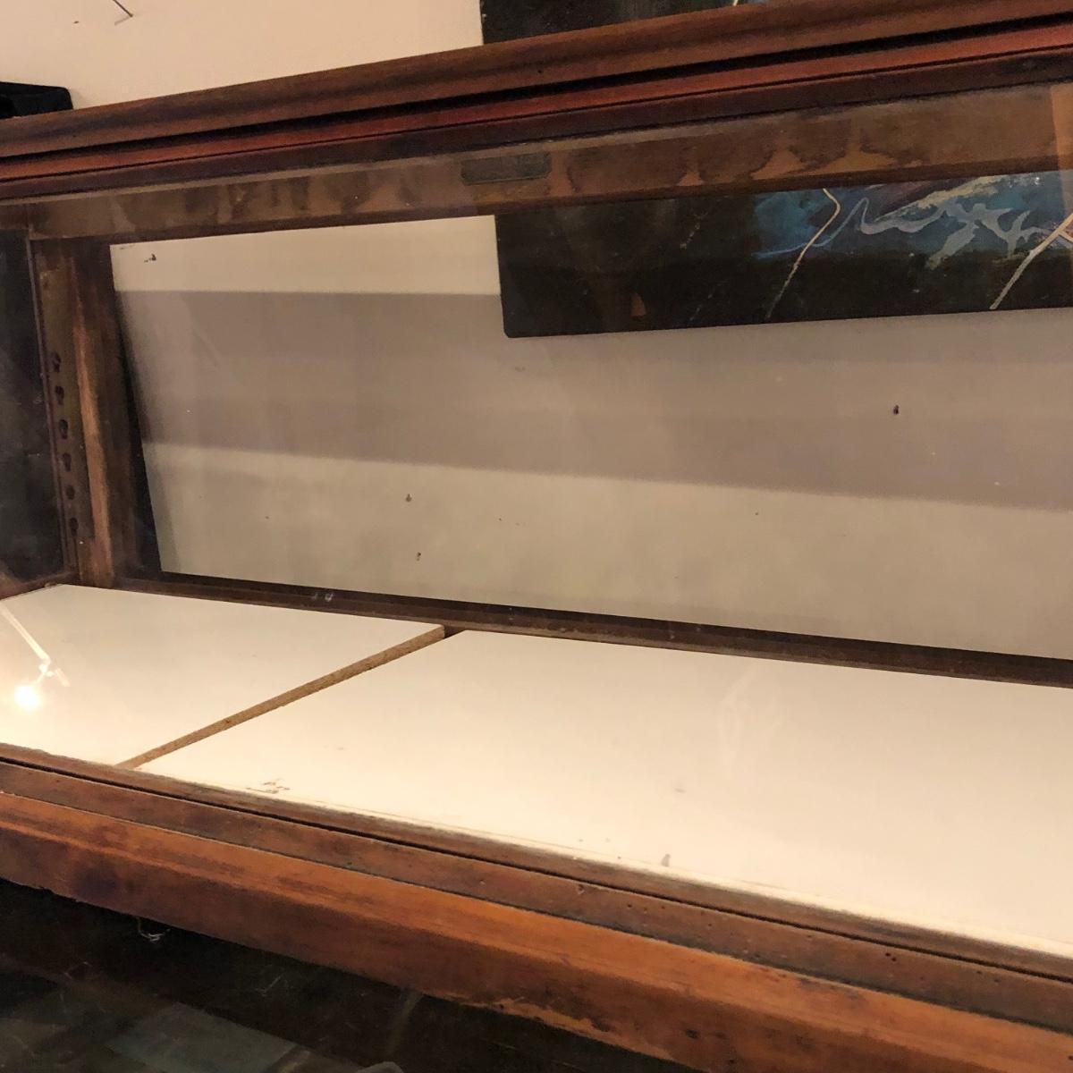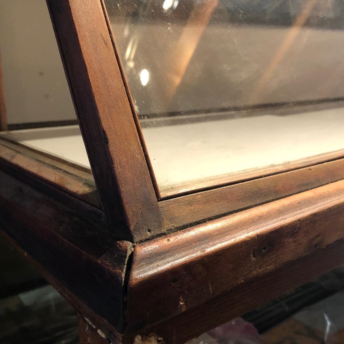 Triangular shaped display case measures 37” x 15.5” x 14”. The bottom of the vase is wider than the top. The front, sides and top all have glass. The back is open. The inside of the vase has two MDF white pieces of boards for the bottom as the bottom is framed out yet has no original flooring. The metal tag on the top back reads, “Statesville Show Case Co.” Local pick up only. In the photos, this display case is sitting on top of another on with items inside.