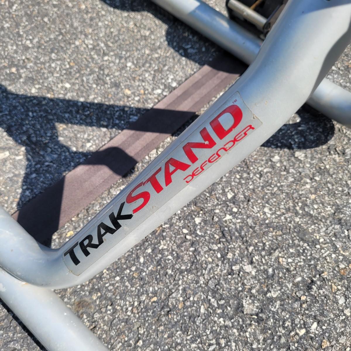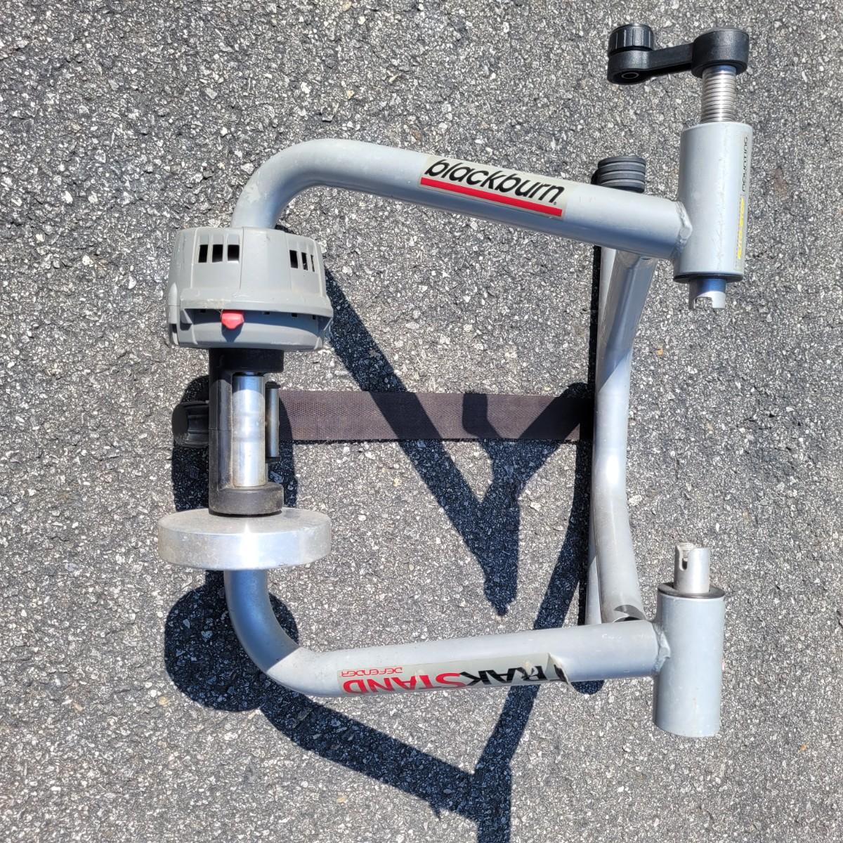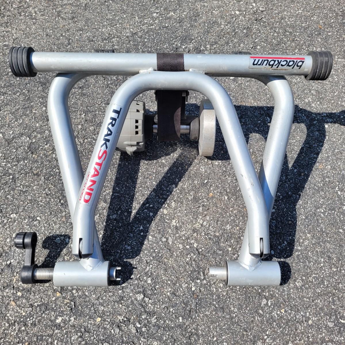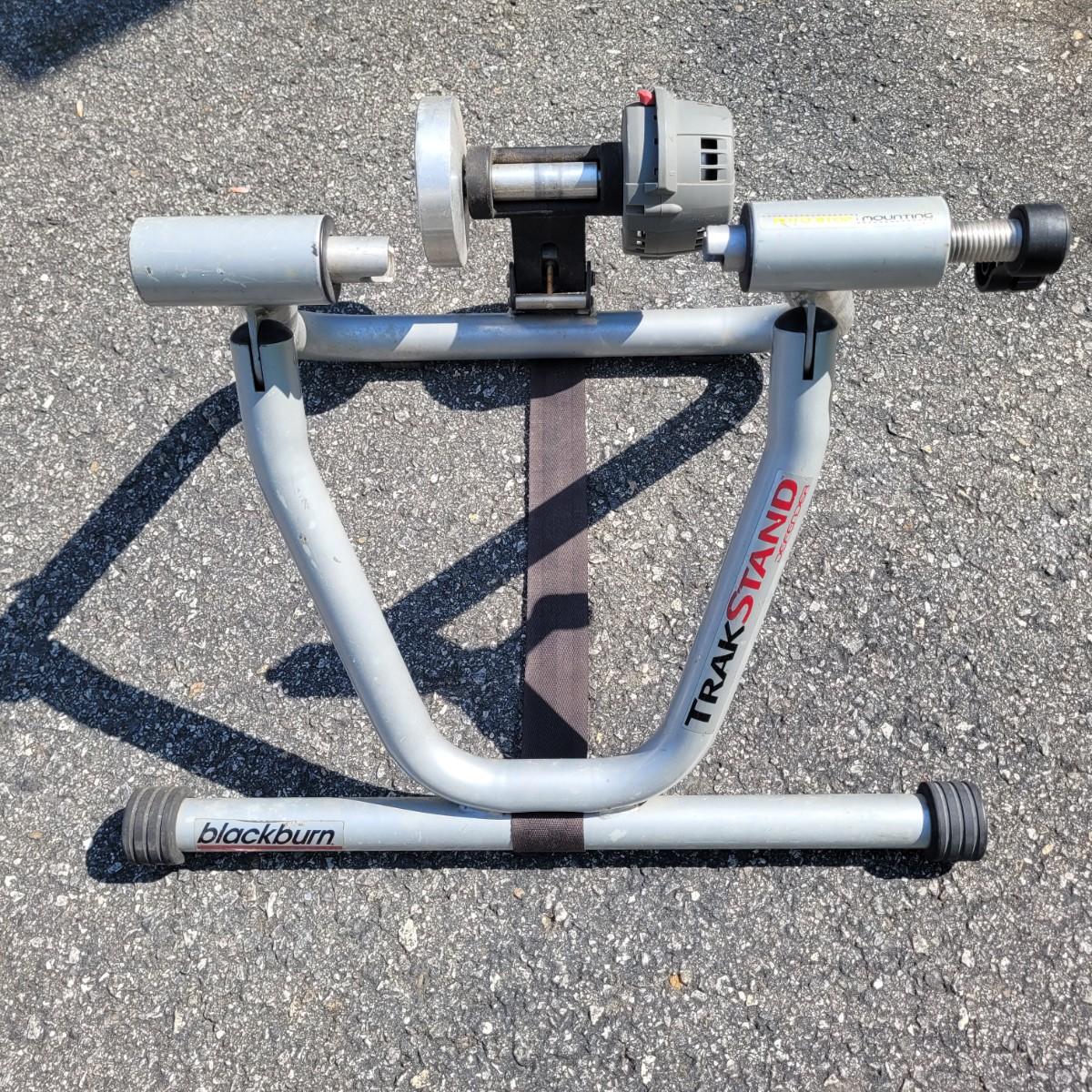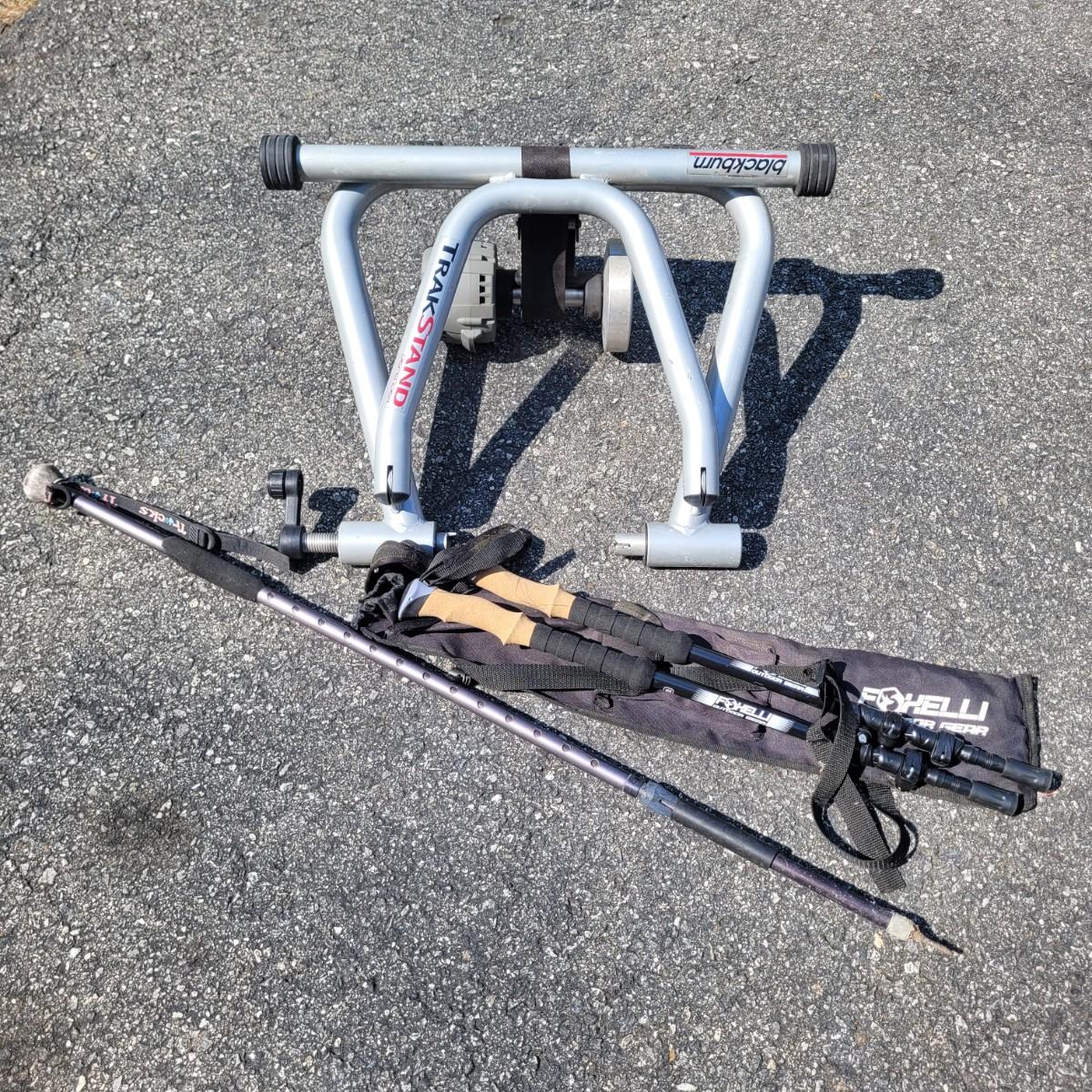 This lot includes a stationary bike trainer stand, single walking stick, and pair of walking sticks. The bike stand is a Blackburn brand trakstand and is meant to turn a bicycle into a stationary workout bike. It is solid and adjustable, made from metal. The pair of trekking poles are Foxelli brand and are adjustable and come with a carrying bag. The single Tracks walking stick is also adjustable and features a wooden top, comfortable foam handle, and metal spike tip.