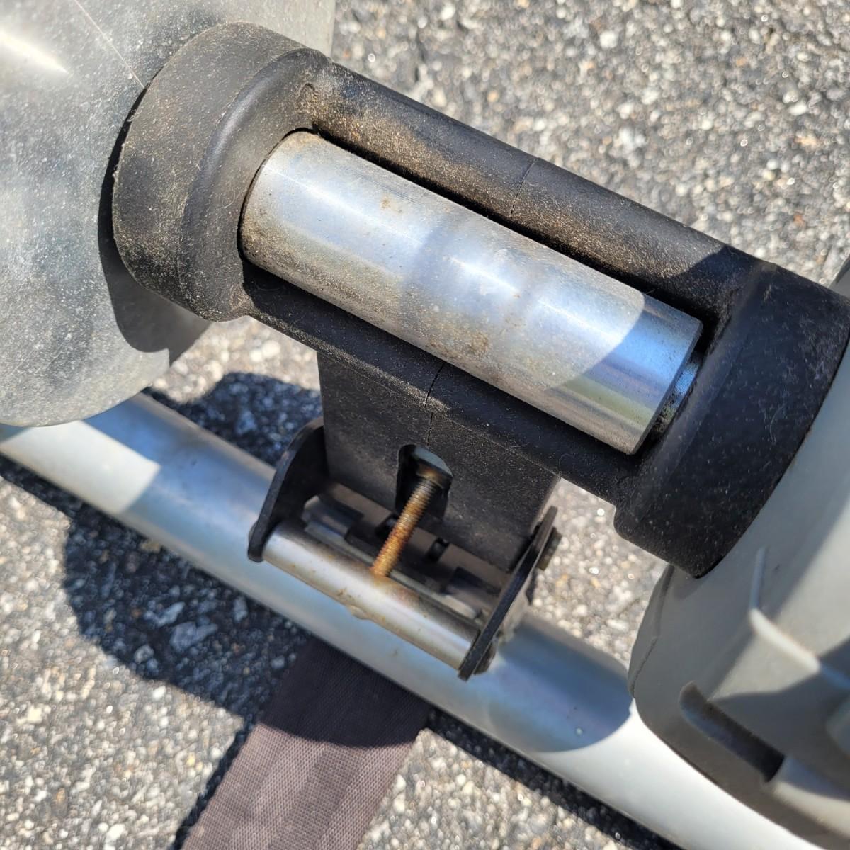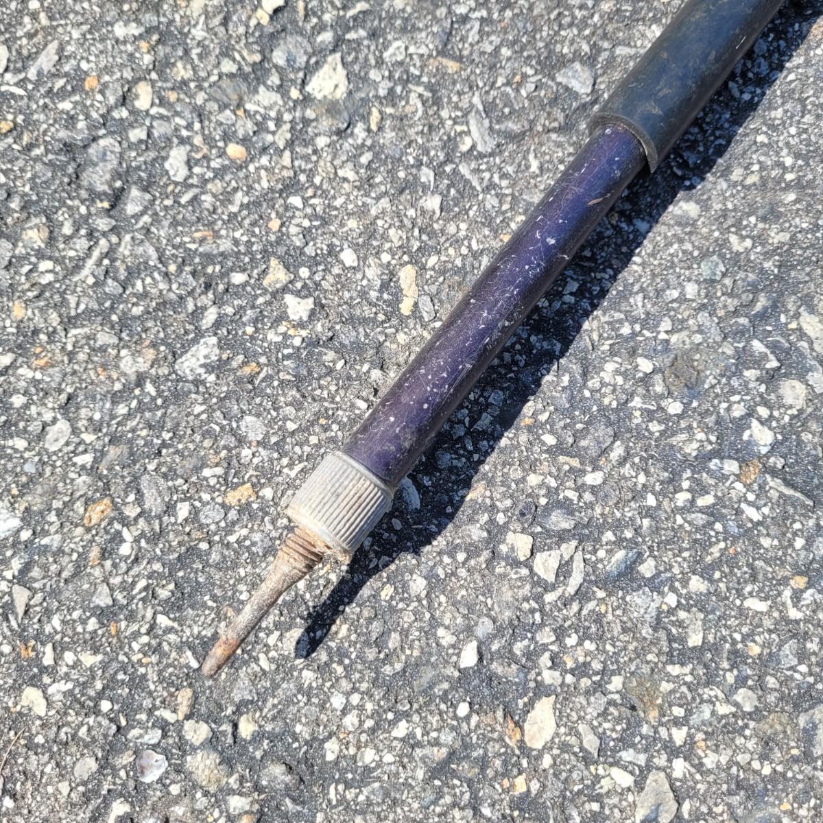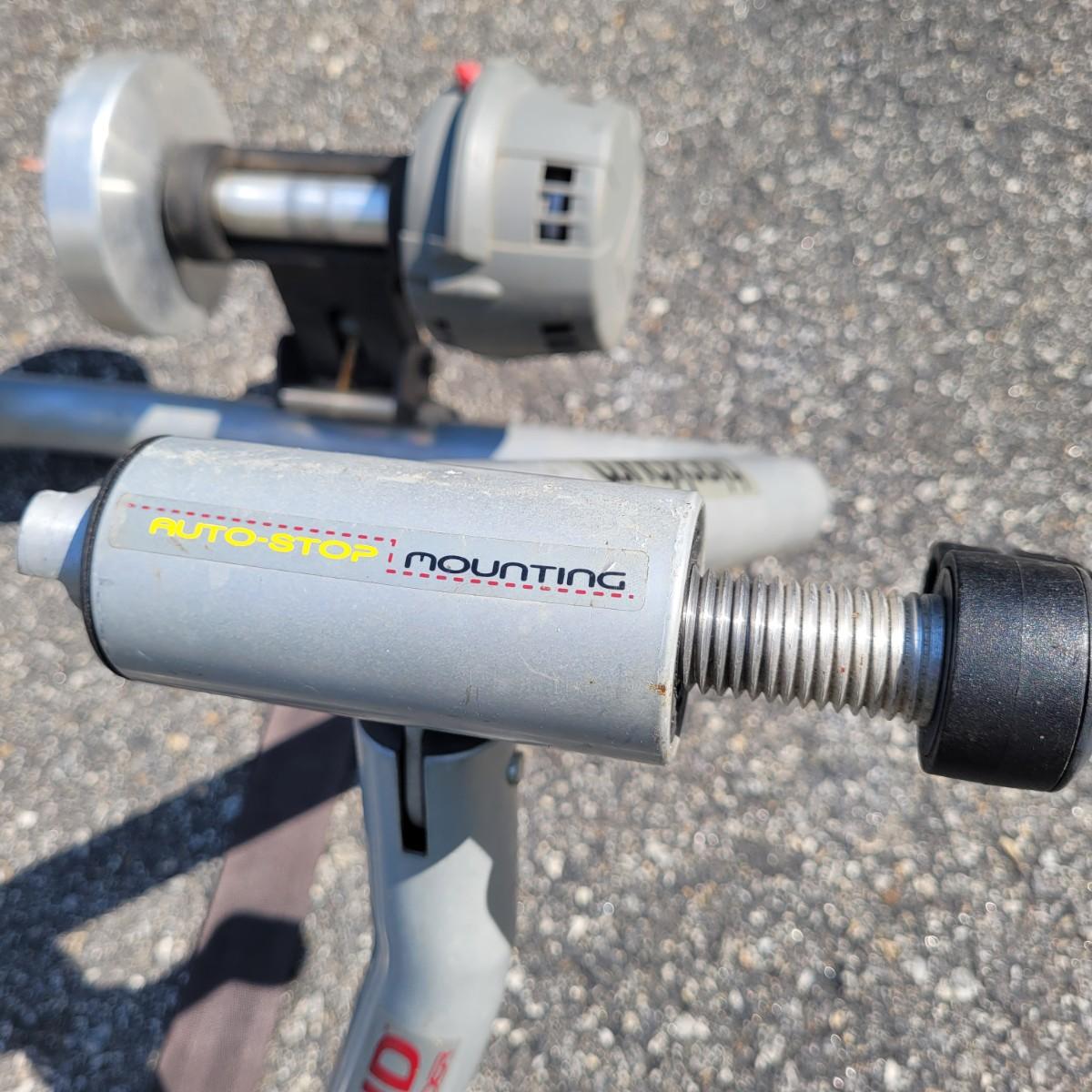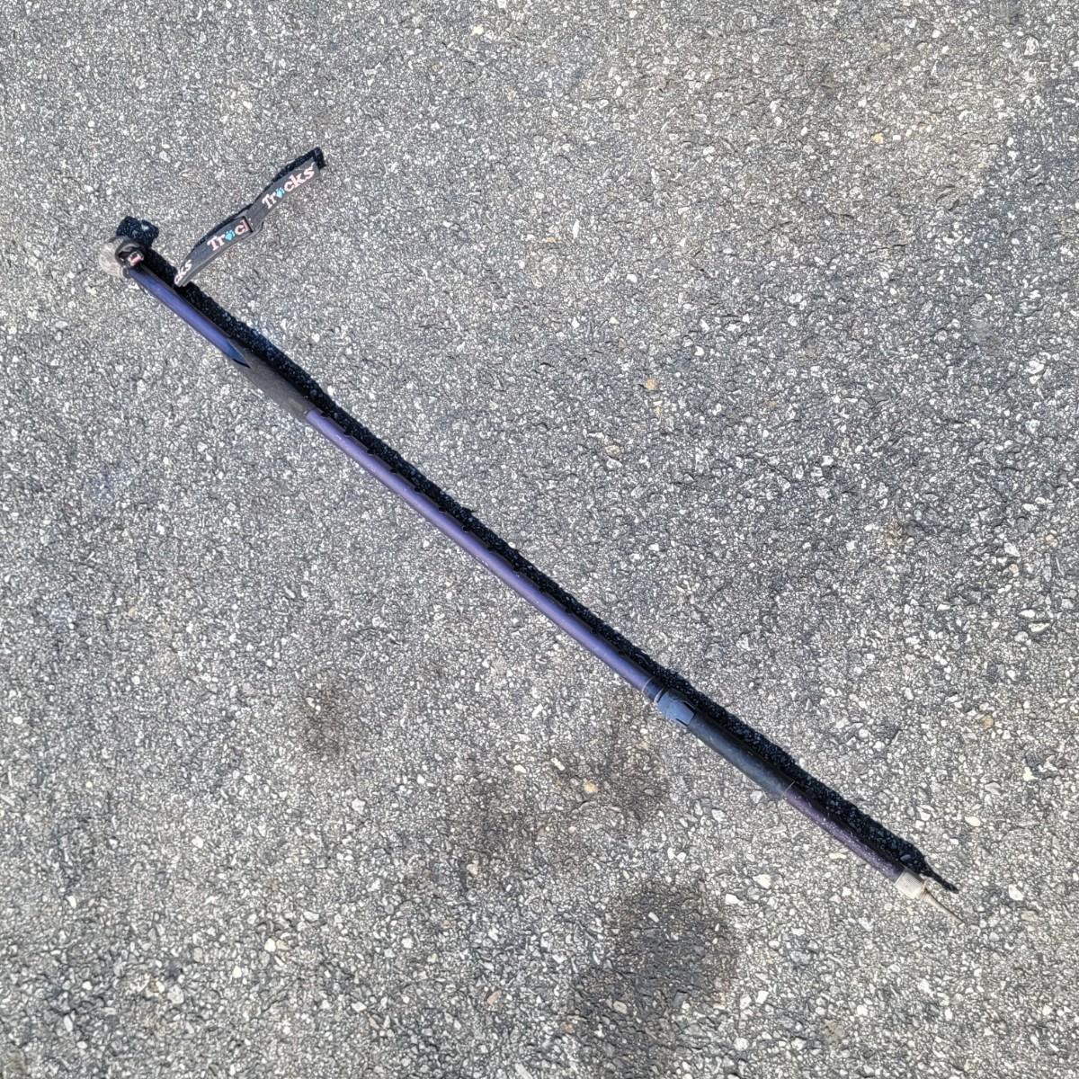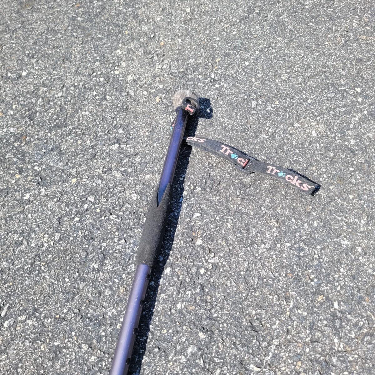 This lot includes a stationary bike trainer stand, single walking stick, and pair of walking sticks. The bike stand is a Blackburn brand trakstand and is meant to turn a bicycle into a stationary workout bike. It is solid and adjustable, made from metal. The pair of trekking poles are Foxelli brand and are adjustable and come with a carrying bag. The single Tracks walking stick is also adjustable and features a wooden top, comfortable foam handle, and metal spike tip.