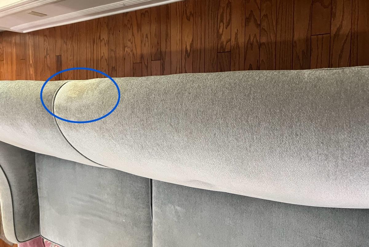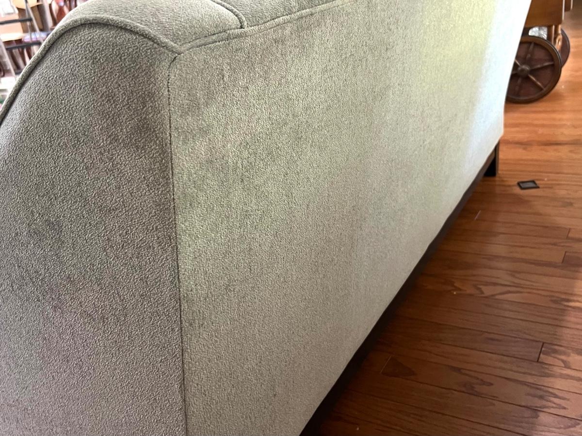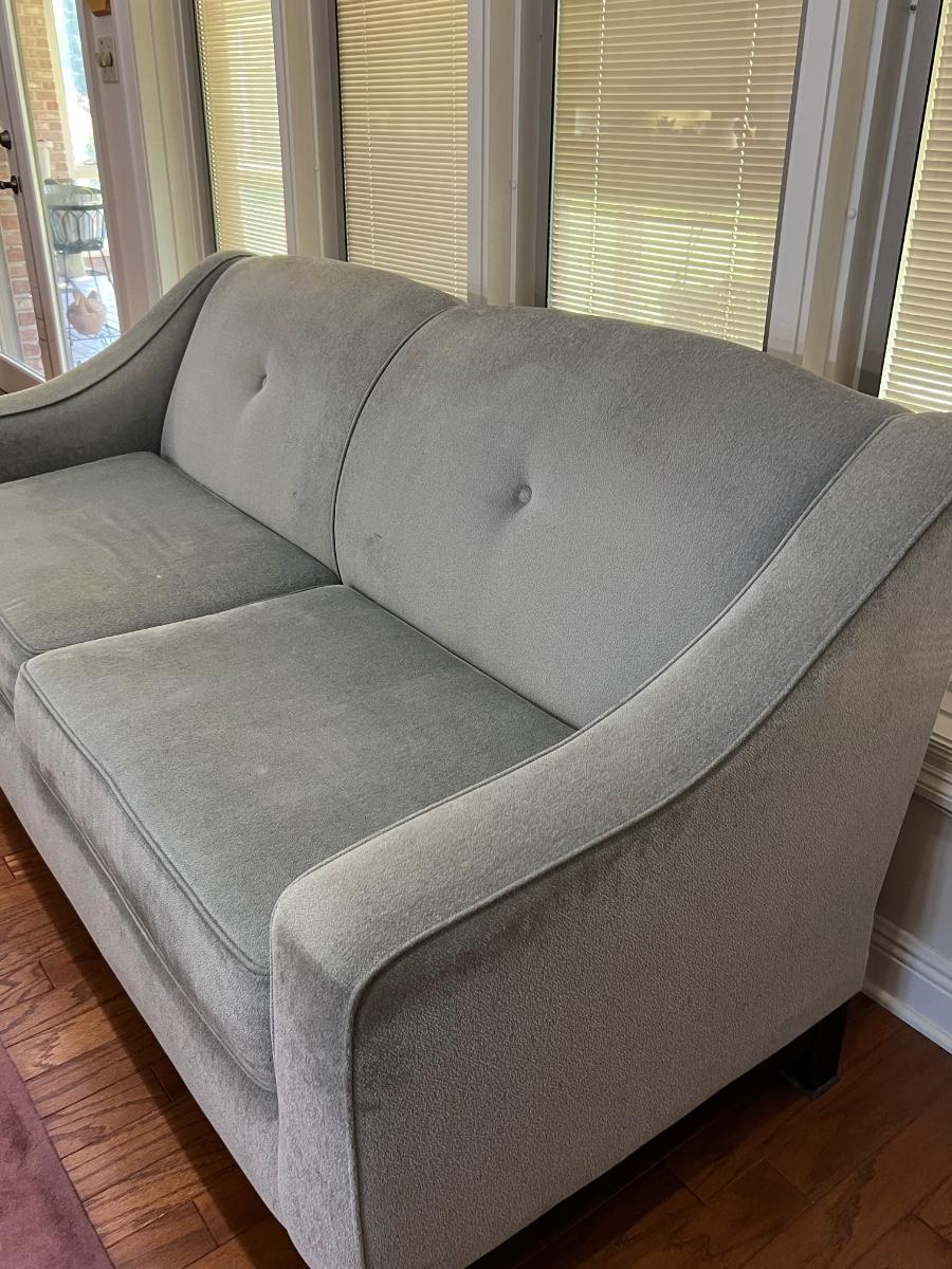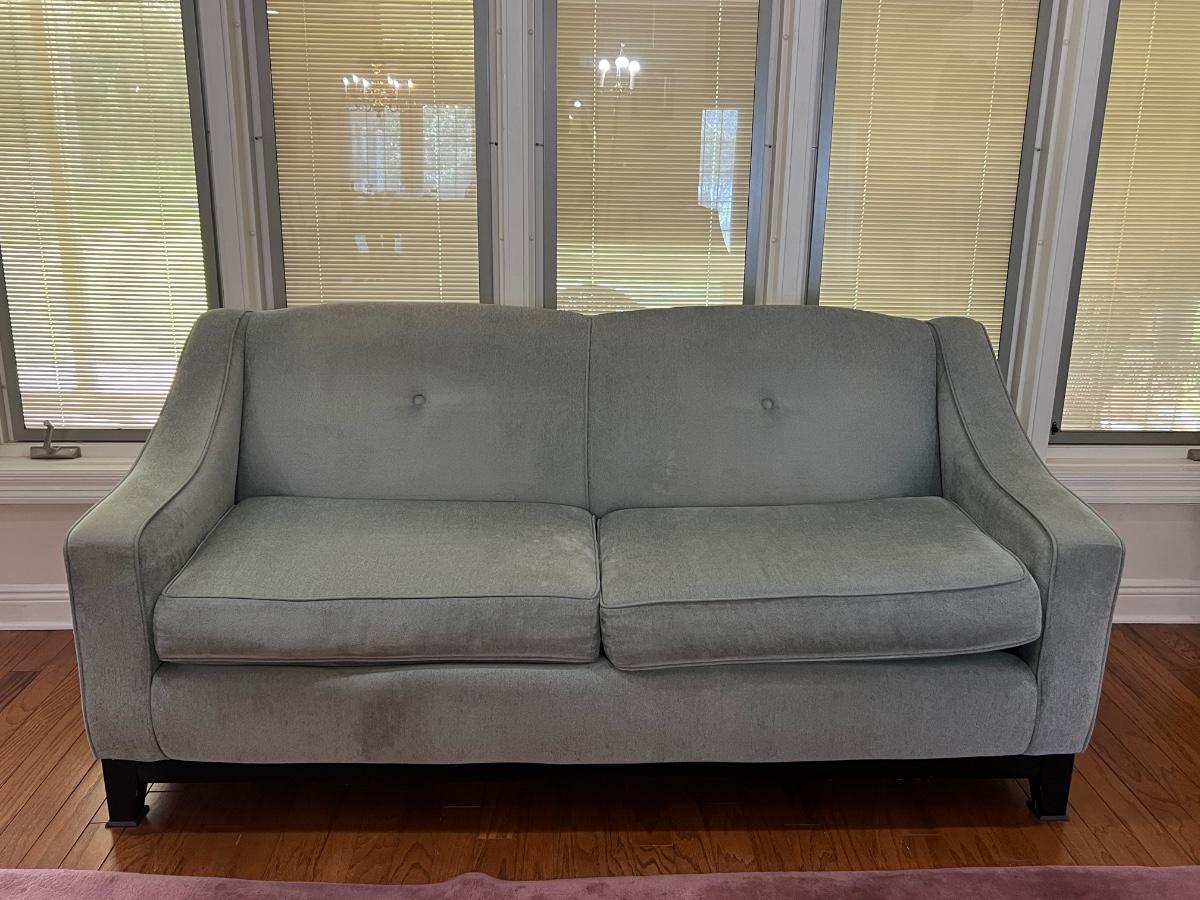 Large Stationary Sofa with two cushions. Color is gray. Measures 77 1/2 inches wide, 35 inches tall and 36 inches deep. Floor to seat measures at 18 inches. No rips or tears in the material. It appears as though a spot on the top/back has been wiped and may require spot cleaning. Please see picture.