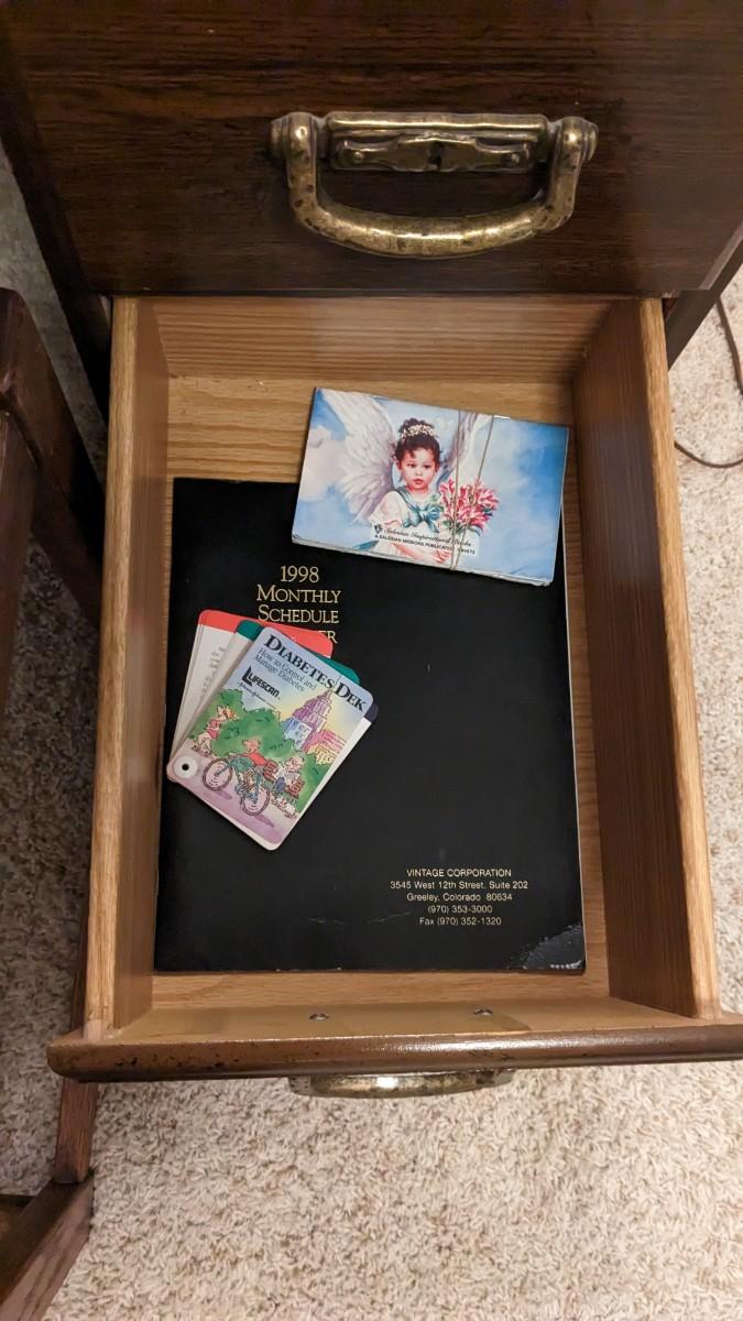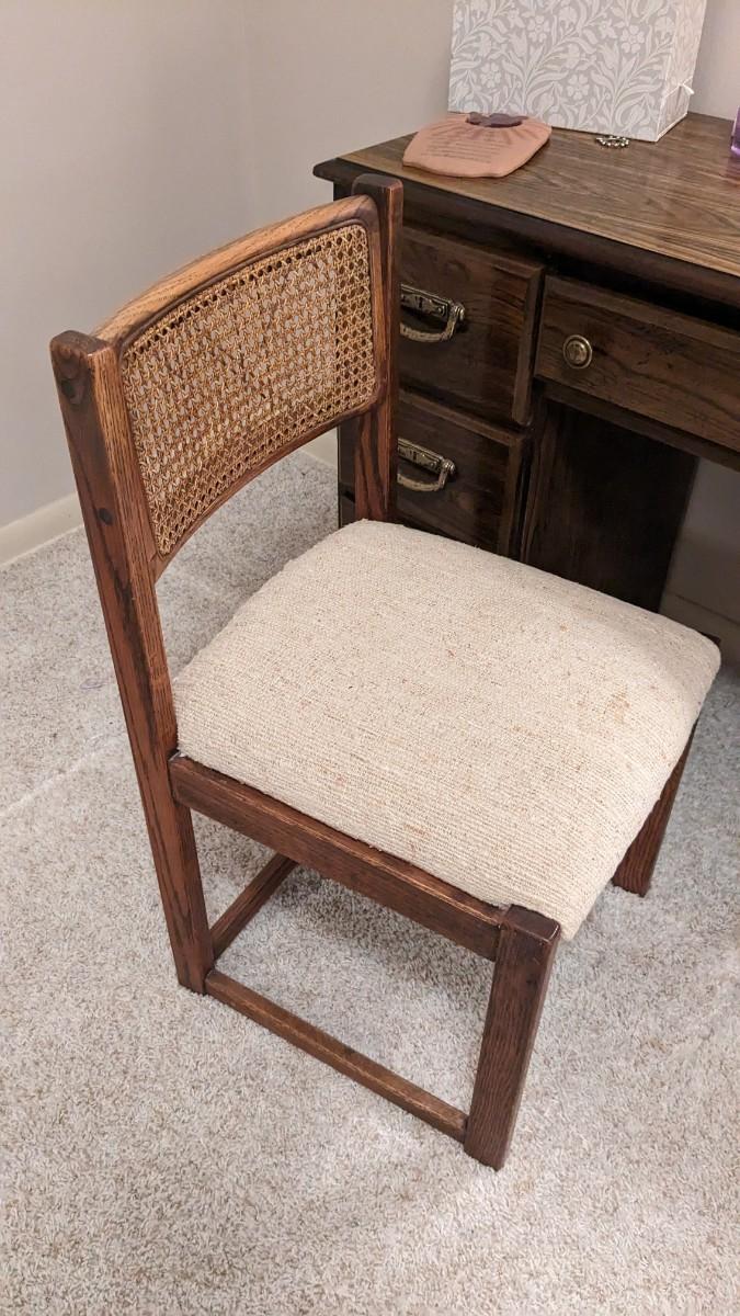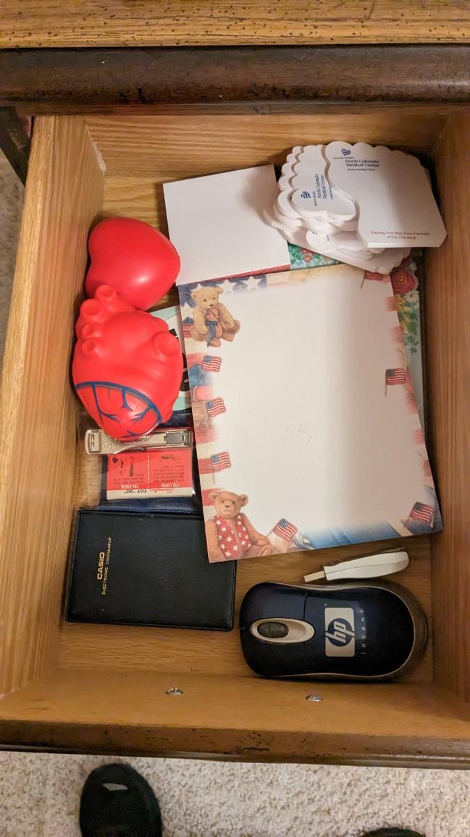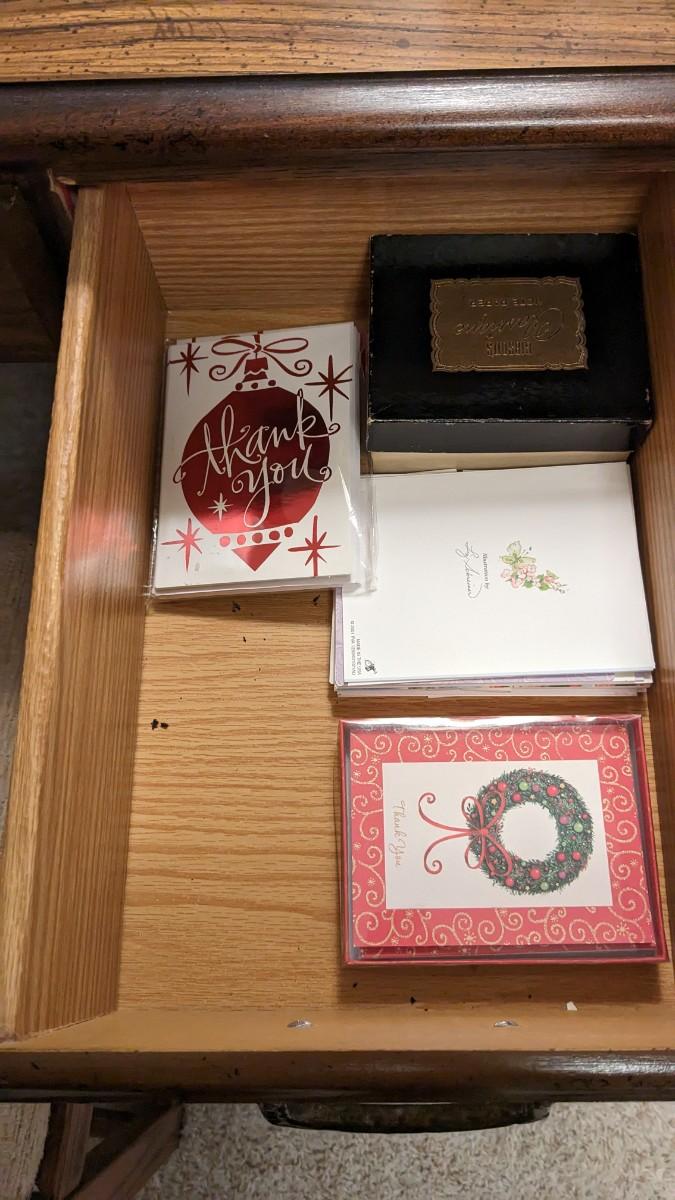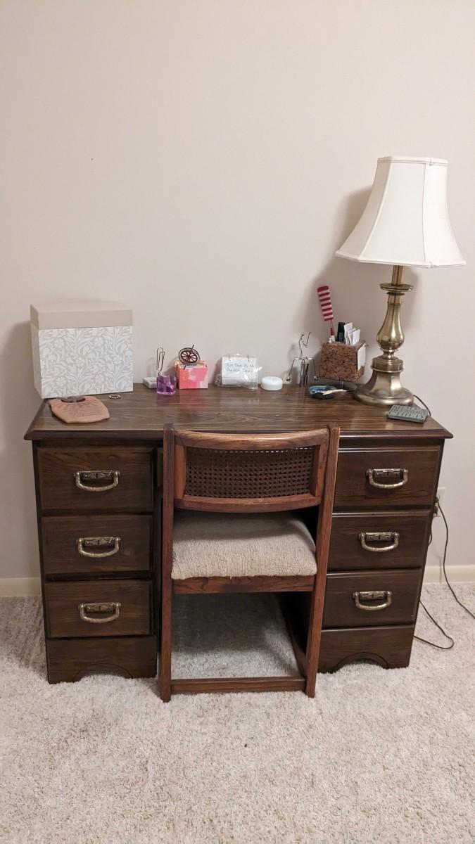 43.5"x 18"x 30.5" 7 drawer desk chock full of everything you could ever need to send your sentiments or write prose. New in package handheld games also included for when it's break time. Nice brass lamp and cain back chair comes with. No shipping. Winning bidder responsible for removal of all items. bdrm2