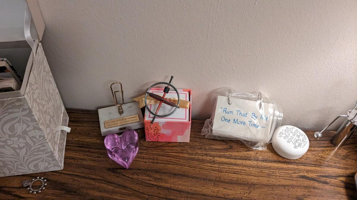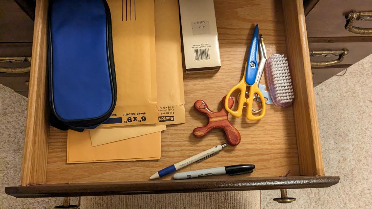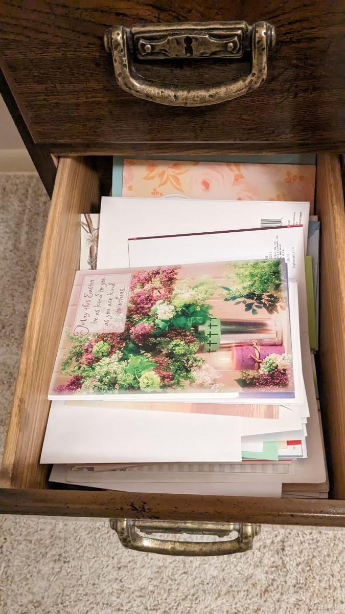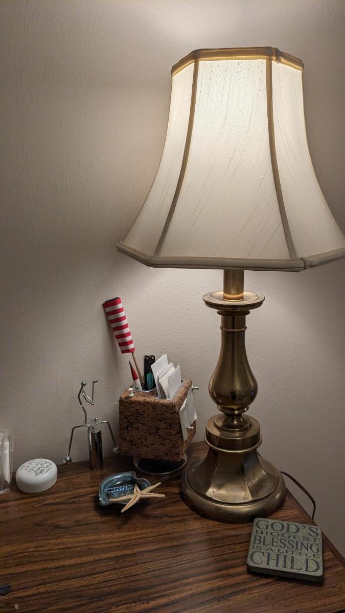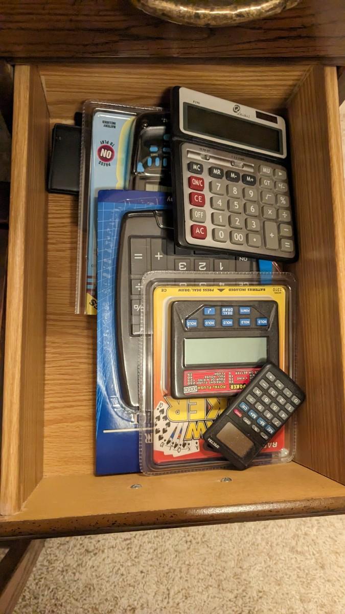 43.5"x 18"x 30.5" 7 drawer desk chock full of everything you could ever need to send your sentiments or write prose. New in package handheld games also included for when it's break time. Nice brass lamp and cain back chair comes with. No shipping. Winning bidder responsible for removal of all items. bdrm2