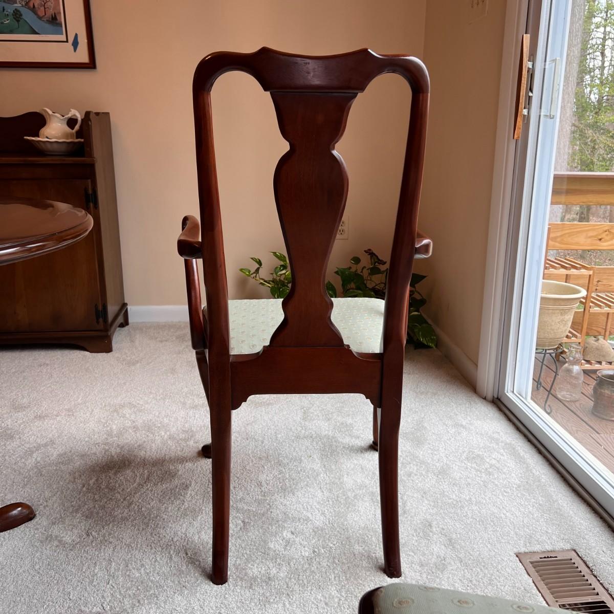 Queen Anne style cherry pedestal dining table set from the Statton Furniture Old Towne Collection. Features 6 upholstered cushion chairs (clean, upholstered with a neutral muted mint green fabric) and two 18-inch expansion leaves along with table pads. Shows some nicks and scratches consistent with age and use. Table: 56"L x 42"W; Chairs: 19.5"W x 38.5"H