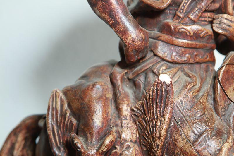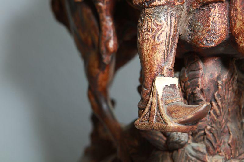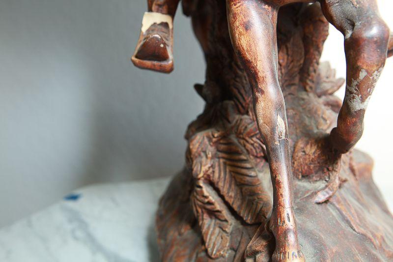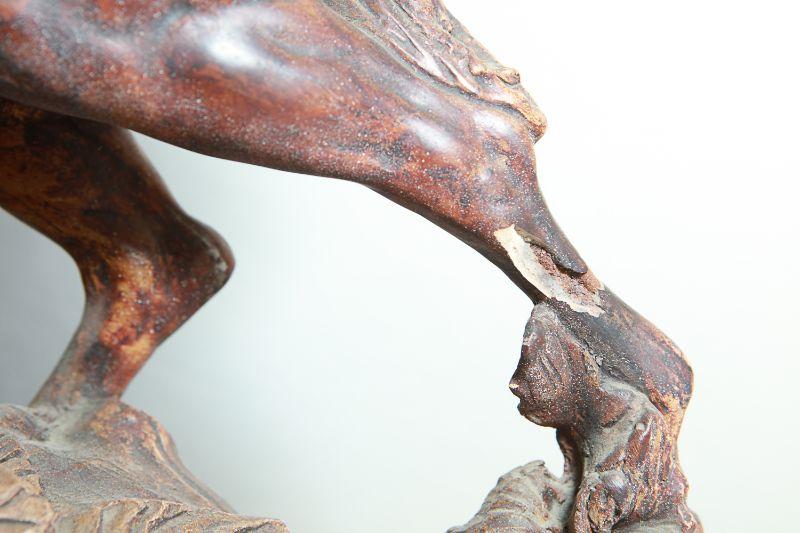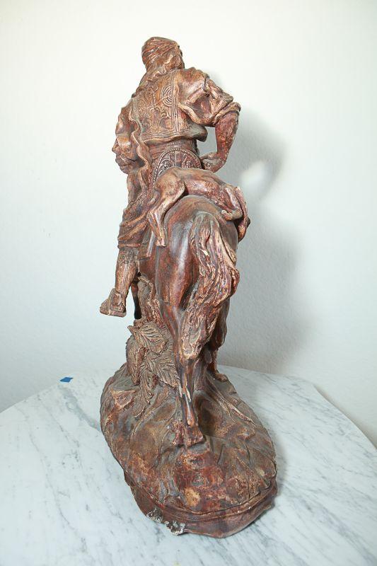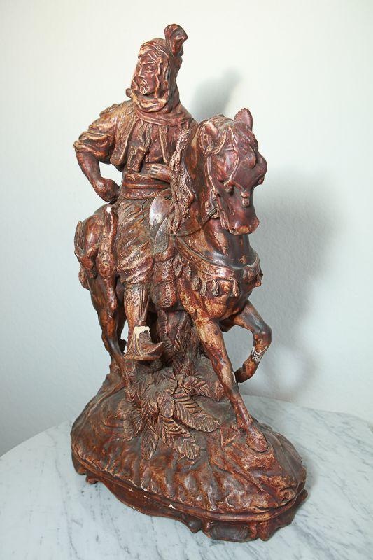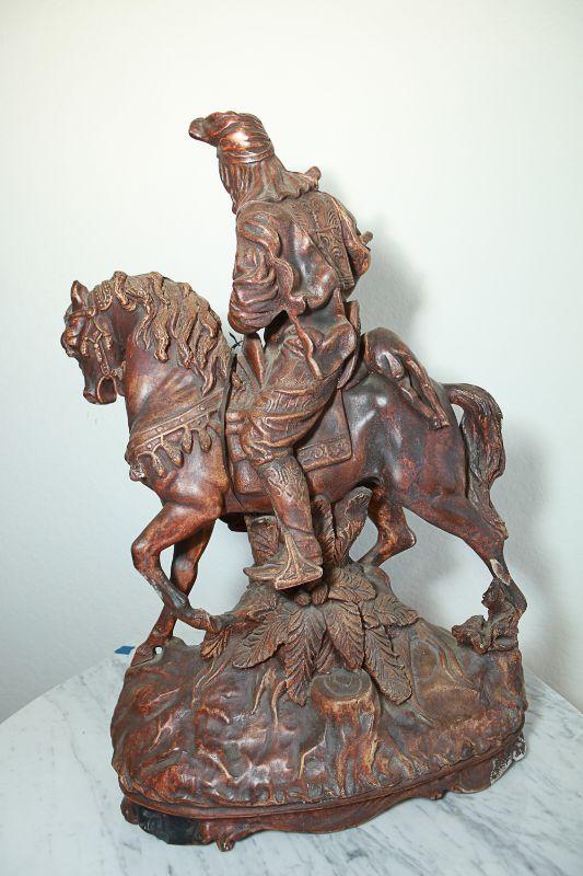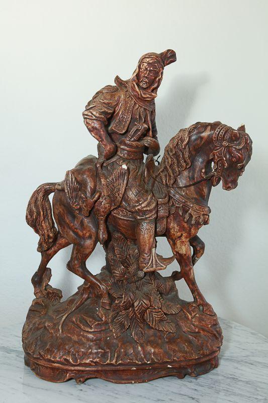 Large horse with rider statue. About 18" size, very heavy. There is damage in multiple spots but it does display nicely. Unsigned.