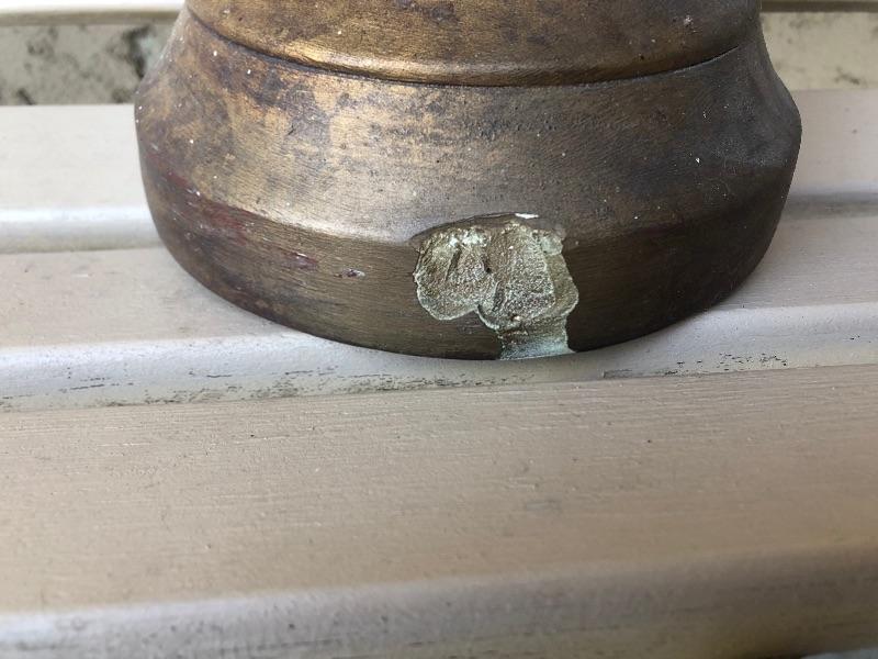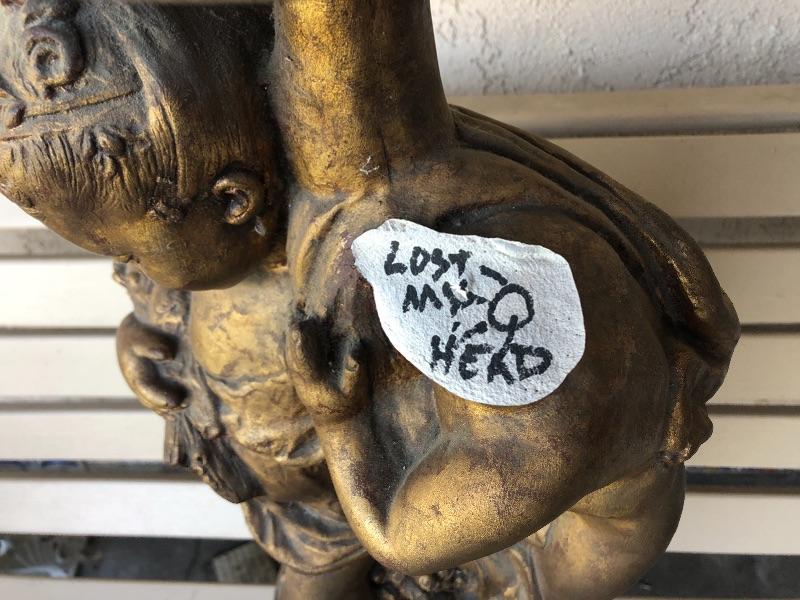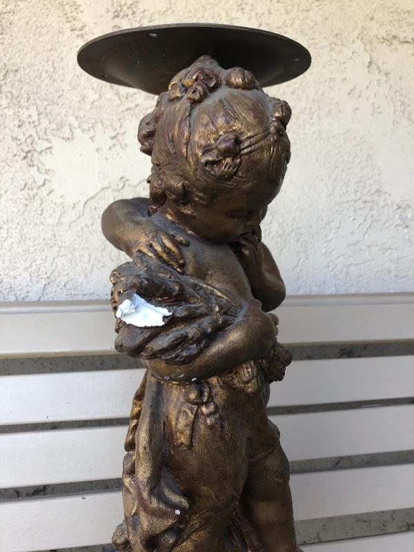 Gold painted concrete statue. Unfortunately the head of one of the figures has been broken off. Small pedestal surface, great for repurposed yard art plant stand.