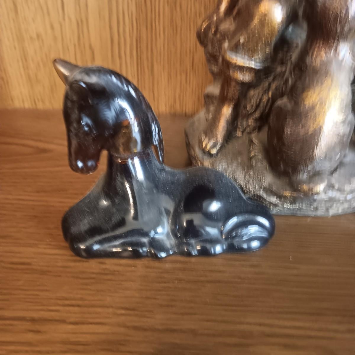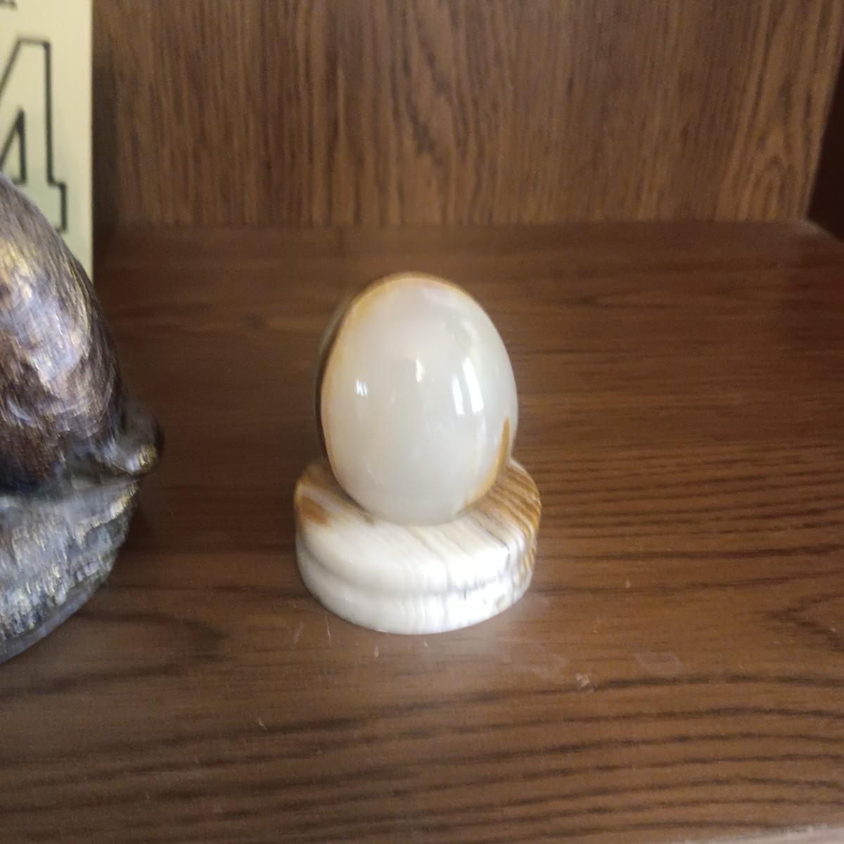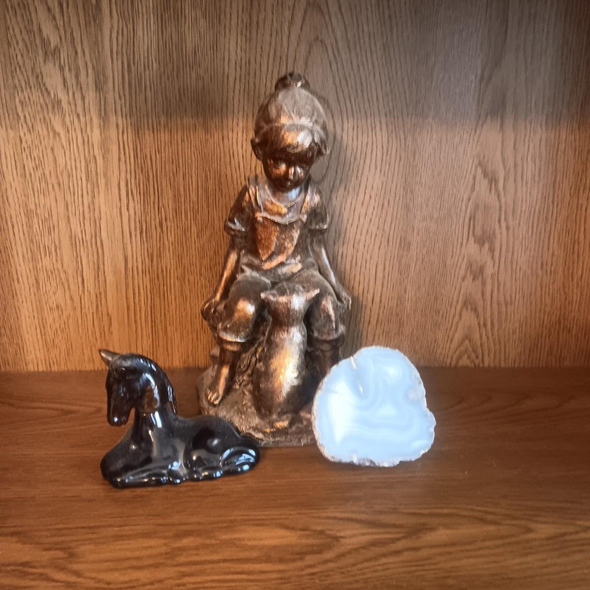 STATUE OF A GIRL AND CAT, MARBLE EGG, AVON COLOGNE HORSE AND AN AGATE