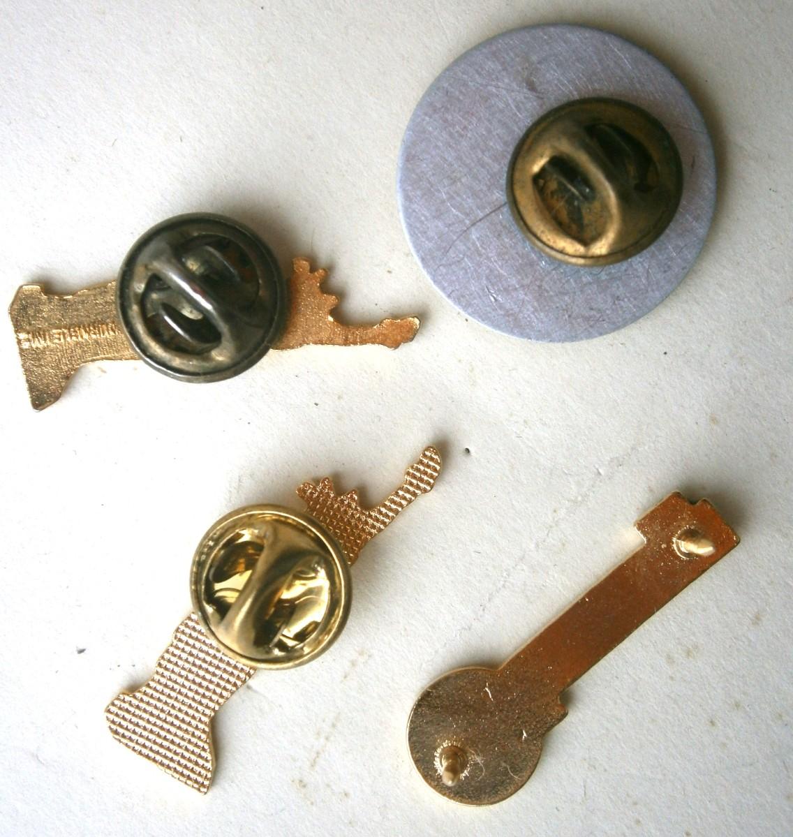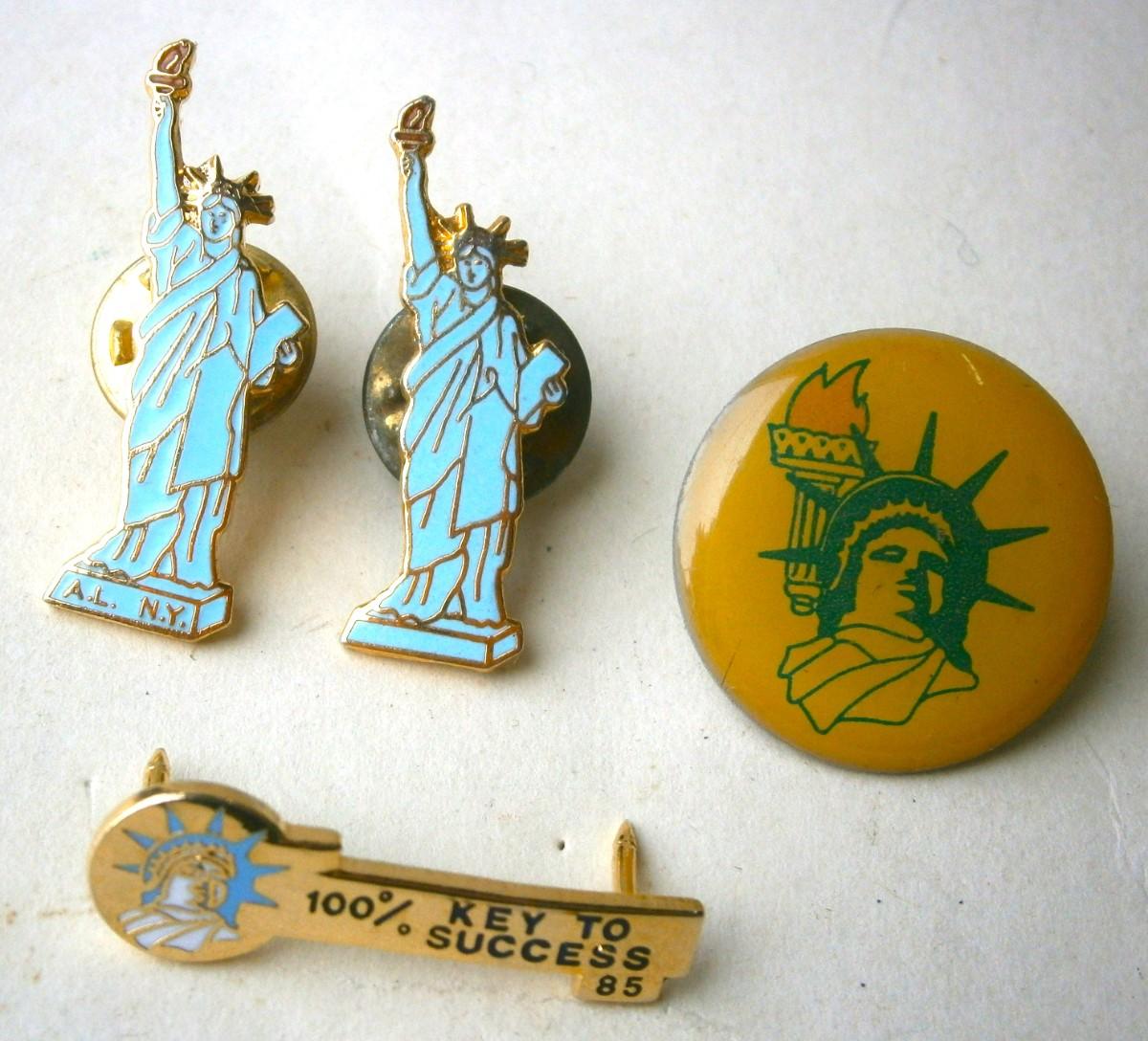 4 Vintage Statue of Liberty Lapel Buttons, 7/8 in. diameter & 1 1/4 in. tall, painted metal.