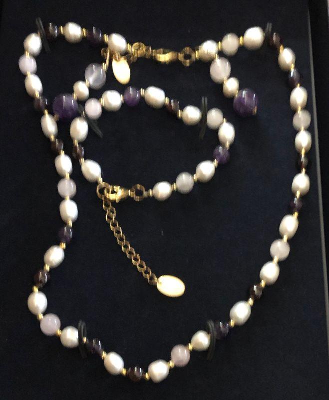 Earring..bracelet and necklace in this jewelry suite by Stauer...Pearl Party Set #30077...Purple gemstones and Fresh Water Pearls....